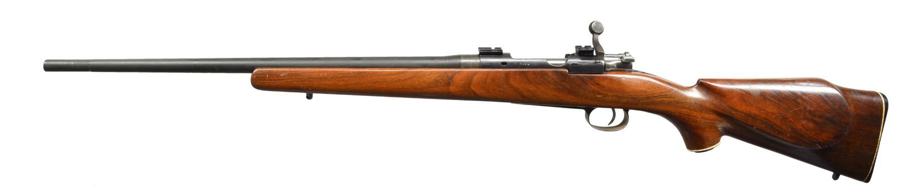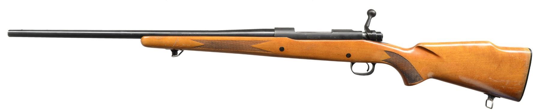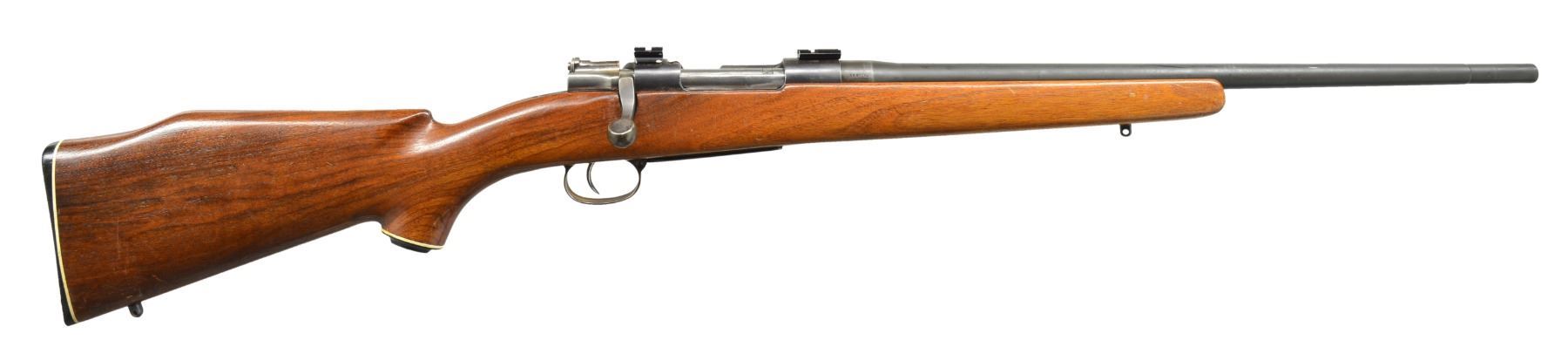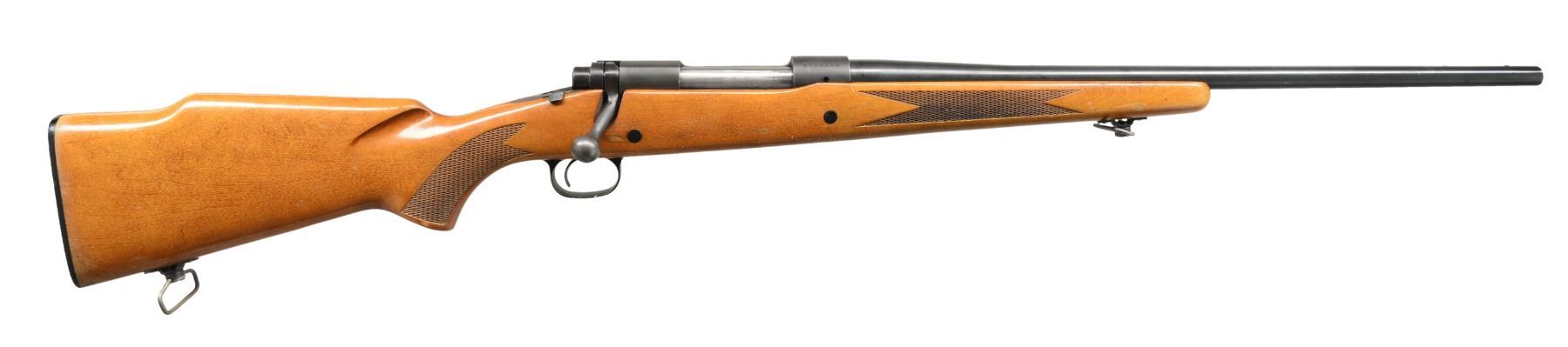 1) SPANISH MODEL 1893 BOLT ACTION. Cal. 308 Win. S# 09836. Bbl. 21 3/4" Replacement. Bolt handle has been altered for low scope mounting & bolt knob flattened on top. Model 1893 sm. ring receiver fitted w/ Weaver bases. Hinged floorplate w/ push button release. Walnut sporter stock w/ Monte Carlo comb & cheekpiece. Black plastic grip cap & buttplate w/ white line spacers. Swivel studs. CONDITION: stock set has hobbyist gunsmith type inletting. Stock finish has thinning, wear & scattered handling marks. Metal has mixture of parkerizing & blue w/ thinning, wear & scratches. Very good shiny bore. (20-513/RW). MODERN. 2) WINCHESTER MODEL 77 SEMI AUTO. Cal. 22 LR. S# 71258. Bbl. 22", markings include "MODEL 77 WINCHESTER 22 L.RIFLE". Receiver grooved for tip off scope. Open sporting rear sight. Bead front sight. Walnut stock w/ beavertail forend. Black plastic buttplate. MAGS: 1 detachable 10 rd. CONDITION: stock has lightly worn original finish w/ thinning & scattered handling marks throughout. Metal has traces of blue turning overall gray w/ scattered spots of oxidation. Worn bore w/ notable oxidation & fine pitting towards muzzle. (20-514/RW). CURIO. 3) WINCHESTER MODEL 670 BOLT ACTION. Cal. 30-06. S# G138313. Bbl. 22". Receiver marked on left rail "WINCHESTER TRADEMARK". Bbl. marked �WINCHESTER MODEL 670-30-06 SPRG". Tang type safety. Drilled & tapped for scope mts., receiver sight. Bbl. drilled & tapped for bbl. sights, no sights are fitted. Hardwood stock has impressed checkering, Monte Carlo comb & black plastic buttplate. Blind mag. CONDITION: stock has wear, scratches & sm. handling marks throughout. Stock has added screw on 1 1/4" fixed sling swivels. Metal has 85% blue w/ light wear & scattered scratches. 1 Plug screw is missing from receiver bridge. Near excellent shiny bore. (20-516/RW). MODERN. $550-900.