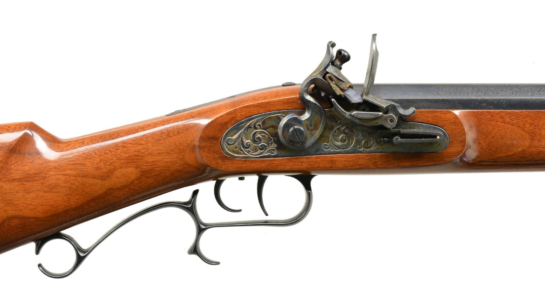 Cal. 50. S# 105985. Bbl. 27" oct. Blade front sight w/ adj. square notch rear sight. Engraved case colored lock. Dbl. set triggers. Gloss finished walnut stock w/ steel buttplate & trigger guard. Extra long brass tipped hardwood ramrod held on under rib by 2 iron pipes. CONDITION: 90% lightly faded metal finish showing surface corrosion around breech area. Refinished stock shows scratches & marks. Bore shows general pitting. (01-17419/DS). ANTIQUE. $150-250.