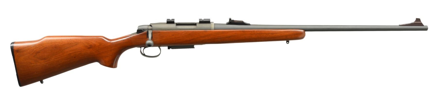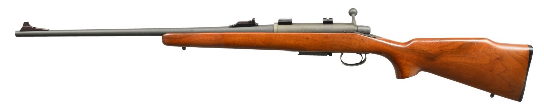 Cal. 222 Rem. S# 039631. Bbl. 24". Receiver marked "REMINGTON MODEL 788". Bbl. marked "222 REM". Receiver fitted w/ 2 piece Weaver scope bases. Bbl. has open sporting rear sight. Ramp & blade front sight. Walnut stock w/ Monte Carlo comb. Black plastic buttplate. MAGS: 1 detachable 4 rd. CONDITION: stock has moderate wear, scratches & handling marks throughout w/ loss of finish. Metal parts have high degree of phosphate type refinish. Front sight is notable plum color. Bright shiny bore. (20-734/RW). MODERN. $300-400.