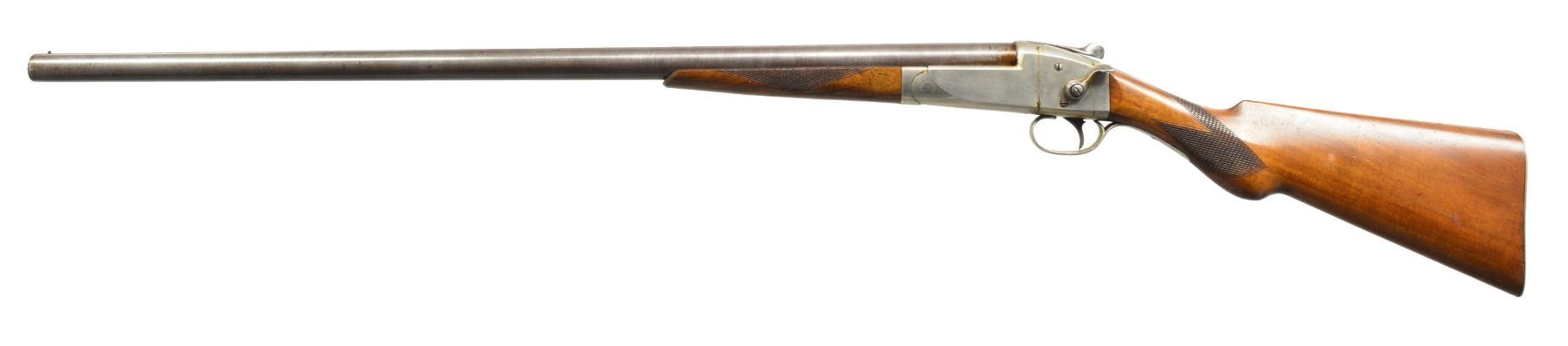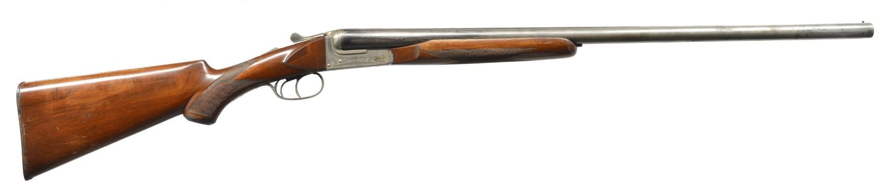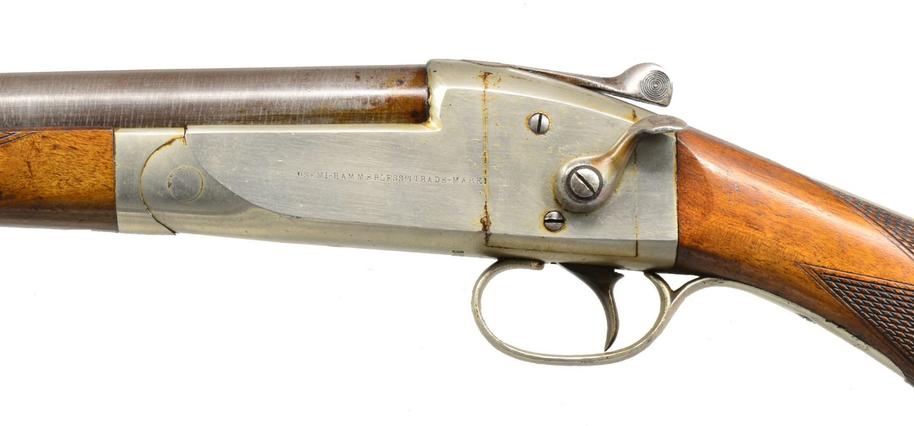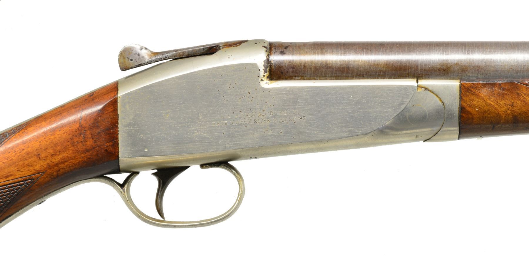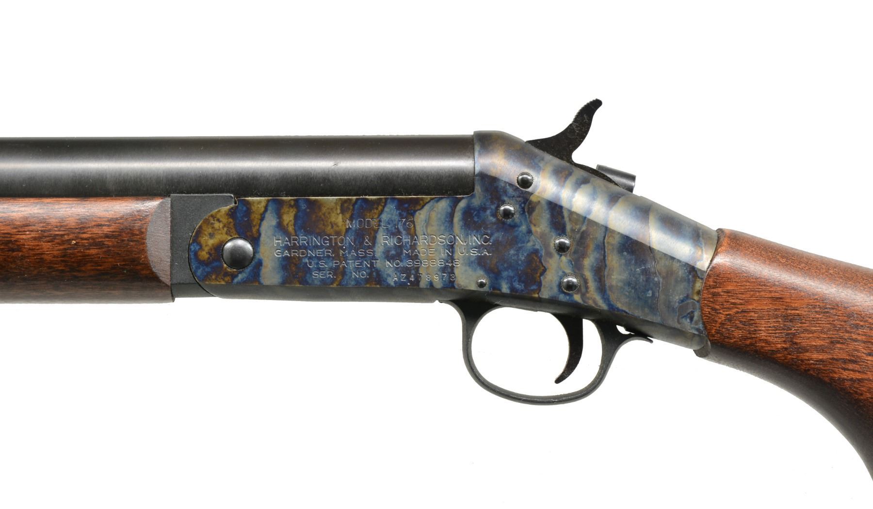 1) AM ARMS CO. SEMI HAMMERLESS. Cal. 12 Ga., 2 3/4". S# 33328. Bbl. 30" Damascus w/ sm. brass bead & full choke. Mfg. 1870's-1880's in Boston w/ nickel plated receiver & buttplate. G.H. Fox Co. started 1853, became American Tool & Machine in 1865, then in 1870 became American Arms w/Fox as primary stockholder; company ceased in 1893. Top lever opening plus left side sideplate having cocking lever. Checkered stock set w/ rnd. knob pistol grip buttstock. CONDITION: good overall appearance w/ sm. marks throughout. Light oxidation following parting line of sideplate. Good Damascus pattern w/ occasional spots of cleaned oxidation. Peppery oxidation on areas of receiver; especially right & bottom. Season crack on forend diagonally left side to bottom. Refinished stock set. Fair to good bore; bright cleaned appearance w/ scattered spots of pitting. (01-17473/NW). ANTIQUE. 2) H&R MODEL 176. Cal. 10 Ga. S# AZ478973. Bbl. 28" cyl. bored Slug Gun w/ folding leaf rear sight & ramp blade front. Mfg. 1982-1986. Case colored receiver w/ opening lever at right of hammer. Stained hardwood stock set w/ swivels & white line ventilated pad. CONDITION: all aspects near excellent including bore. (20-397/NW). MODERN. 3) HOPKINS & ALLEN FALLING BLOCK. Cal. 12 Ga. 2 1/2". S# 6957. Bbl. 28 1/2" w/ cyl. bore. Mfg. 1887 to early 1900's. Blued w/ case colored receiver & checkered walnut stock set; buttstock w/ rnd. knob pistol grip & smooth steel buttplate. Schnabel tipped forend. Matching numbered finger lever. CONDITION: good general appearance w/ faded case colors. Patina appearance to bottom of receiver, lever & buttplate. Minimal marks on forend, buttstock has many marks; most noticeable on left side. Generally good appearing bore w/ cleaned light pitting plus noticeable pitting in chamber area. (20-402/NW). CURIO. 4) DE GASPAR ARZIAGA SxS BOXLOCK. Cal. 12 Ga. 2 3/4". S# 129545. Bbls. 27 1/2" w/ extractor; choked IC & full. Mfg. 1930 in Eibar, Spain w/ dbl. triggers & top tang safety. Matching numbered bbls. plus 656 assembly no. on forend iron, forend, bbls. & bottom plate of action. Checkered stock set having beavertail push button release forend & pistol grip buttstock w/ basket weave pattern buttplate plus cheekpiece & grip cap. Moderately engraved in the white receiver & trigger guard. CONDITION: about good overall appearance w/ numerous cleaned oxidation spots on bbl. & some occasional peppery oxidation spots on receiver. Forend best appearing component of stock set; buttstock w/ numerous scratches & peeling finish along w/ oversized buttplate. Very good plus bores w/ longitudinal streaks of firing residue. Tight action w/ lever just reaching center. (20-405/NW). CURIO. $650-900.