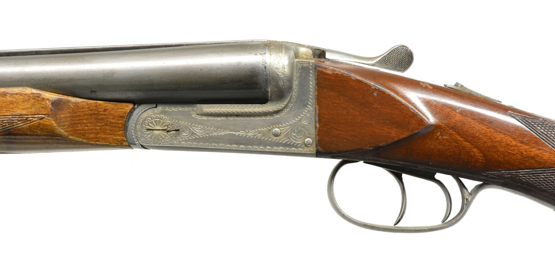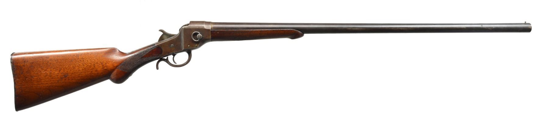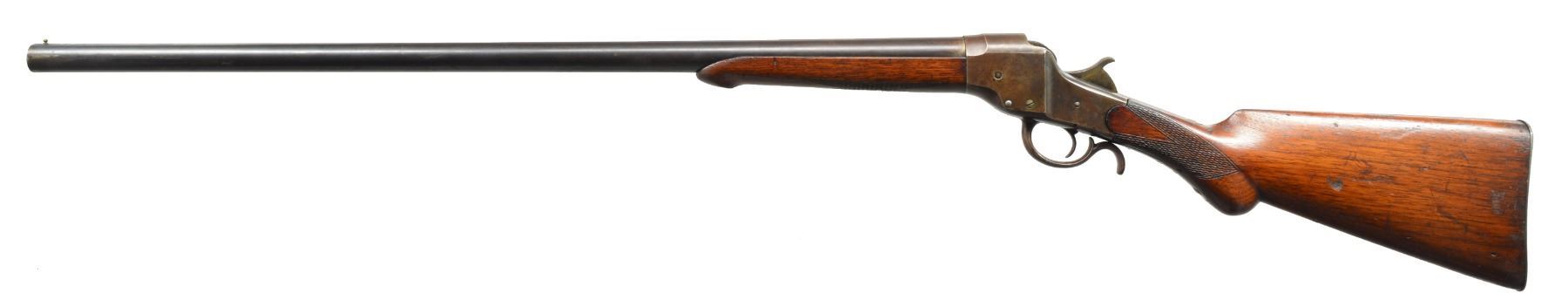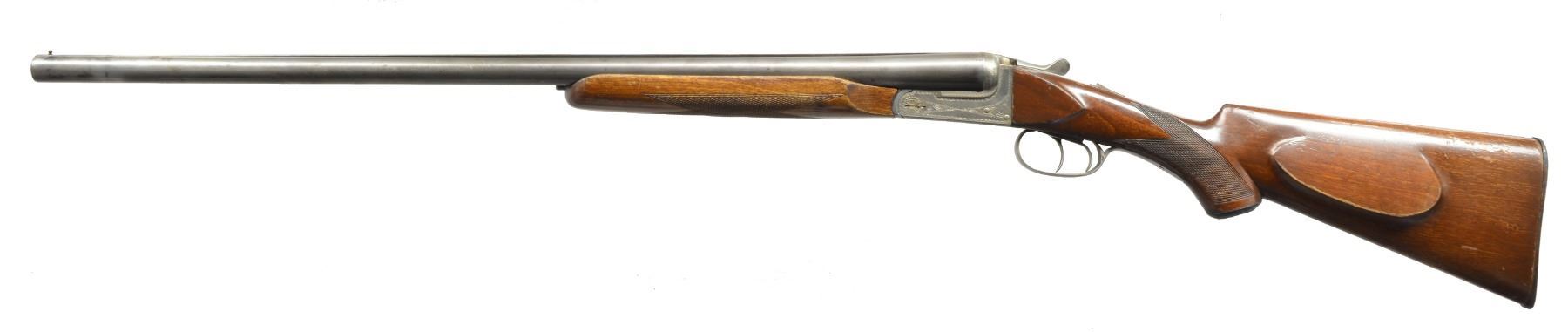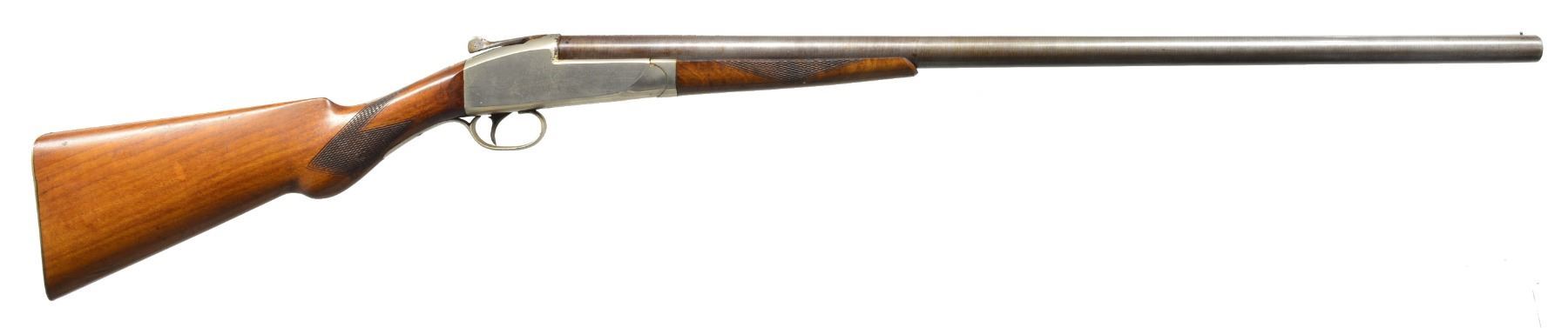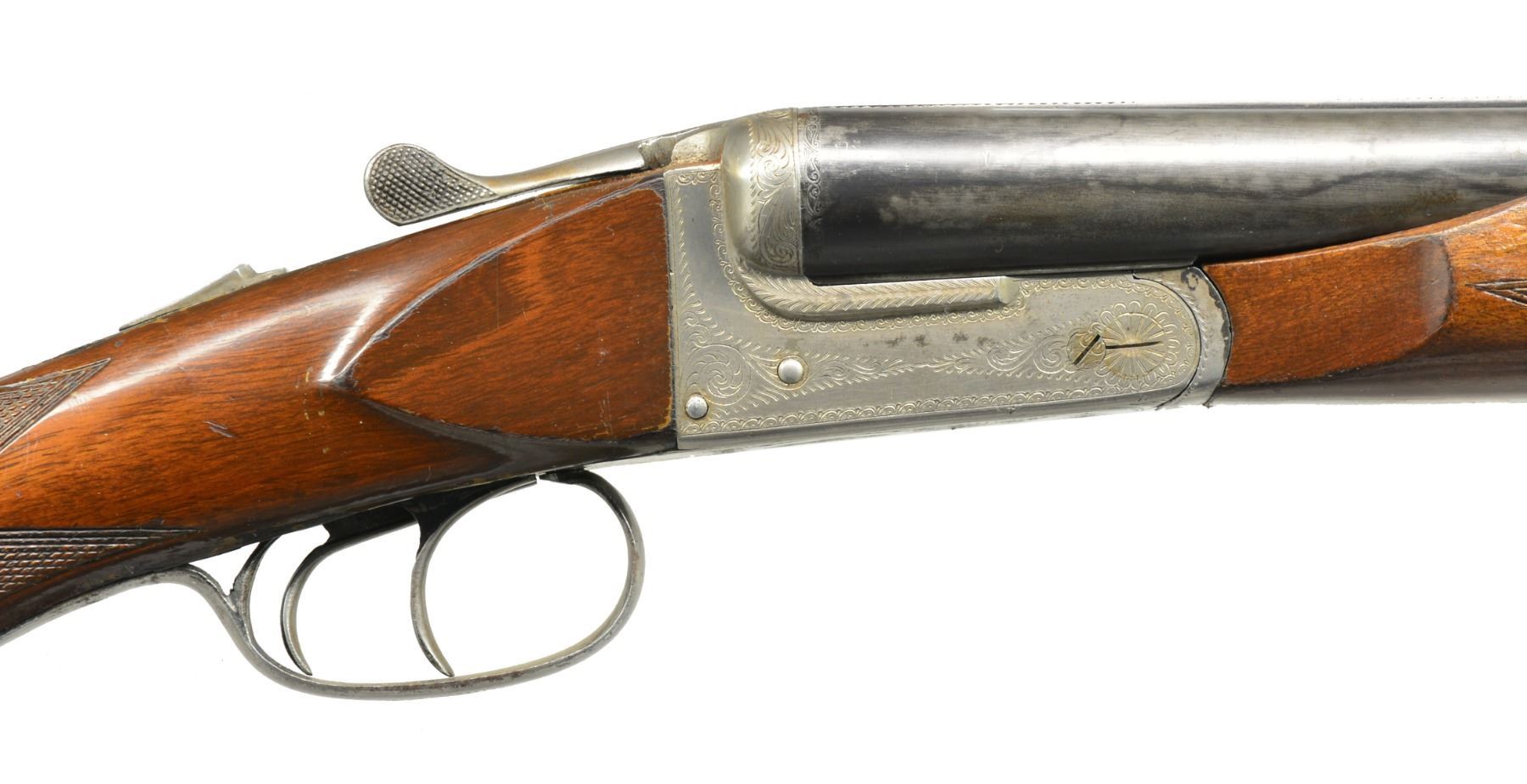 1) AM ARMS CO. SEMI HAMMERLESS. Cal. 12 Ga., 2 3/4". S# 33328. Bbl. 30" Damascus w/ sm. brass bead & full choke. Mfg. 1870's-1880's in Boston w/ nickel plated receiver & buttplate. G.H. Fox Co. started 1853, became American Tool & Machine in 1865, then in 1870 became American Arms w/Fox as primary stockholder; company ceased in 1893. Top lever opening plus left side sideplate having cocking lever. Checkered stock set w/ rnd. knob pistol grip buttstock. CONDITION: good overall appearance w/ sm. marks throughout. Light oxidation following parting line of sideplate. Good Damascus pattern w/ occasional spots of cleaned oxidation. Peppery oxidation on areas of receiver; especially right & bottom. Season crack on forend diagonally left side to bottom. Refinished stock set. Fair to good bore; bright cleaned appearance w/ scattered spots of pitting. (01-17473/NW). ANTIQUE. 2) H&R MODEL 176. Cal. 10 Ga. S# AZ478973. Bbl. 28" cyl. bored Slug Gun w/ folding leaf rear sight & ramp blade front. Mfg. 1982-1986. Case colored receiver w/ opening lever at right of hammer. Stained hardwood stock set w/ swivels & white line ventilated pad. CONDITION: all aspects near excellent including bore. (20-397/NW). MODERN. 3) HOPKINS & ALLEN FALLING BLOCK. Cal. 12 Ga. 2 1/2". S# 6957. Bbl. 28 1/2" w/ cyl. bore. Mfg. 1887 to early 1900's. Blued w/ case colored receiver & checkered walnut stock set; buttstock w/ rnd. knob pistol grip & smooth steel buttplate. Schnabel tipped forend. Matching numbered finger lever. CONDITION: good general appearance w/ faded case colors. Patina appearance to bottom of receiver, lever & buttplate. Minimal marks on forend, buttstock has many marks; most noticeable on left side. Generally good appearing bore w/ cleaned light pitting plus noticeable pitting in chamber area. (20-402/NW). CURIO. 4) DE GASPAR ARZIAGA SxS BOXLOCK. Cal. 12 Ga. 2 3/4". S# 129545. Bbls. 27 1/2" w/ extractor; choked IC & full. Mfg. 1930 in Eibar, Spain w/ dbl. triggers & top tang safety. Matching numbered bbls. plus 656 assembly no. on forend iron, forend, bbls. & bottom plate of action. Checkered stock set having beavertail push button release forend & pistol grip buttstock w/ basket weave pattern buttplate plus cheekpiece & grip cap. Moderately engraved in the white receiver & trigger guard. CONDITION: about good overall appearance w/ numerous cleaned oxidation spots on bbl. & some occasional peppery oxidation spots on receiver. Forend best appearing component of stock set; buttstock w/ numerous scratches & peeling finish along w/ oversized buttplate. Very good plus bores w/ longitudinal streaks of firing residue. Tight action w/ lever just reaching center. (20-405/NW). CURIO. $650-900.