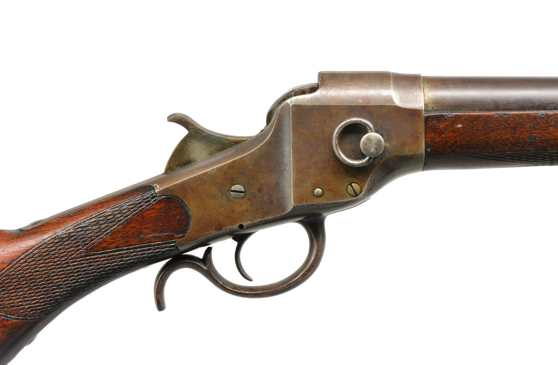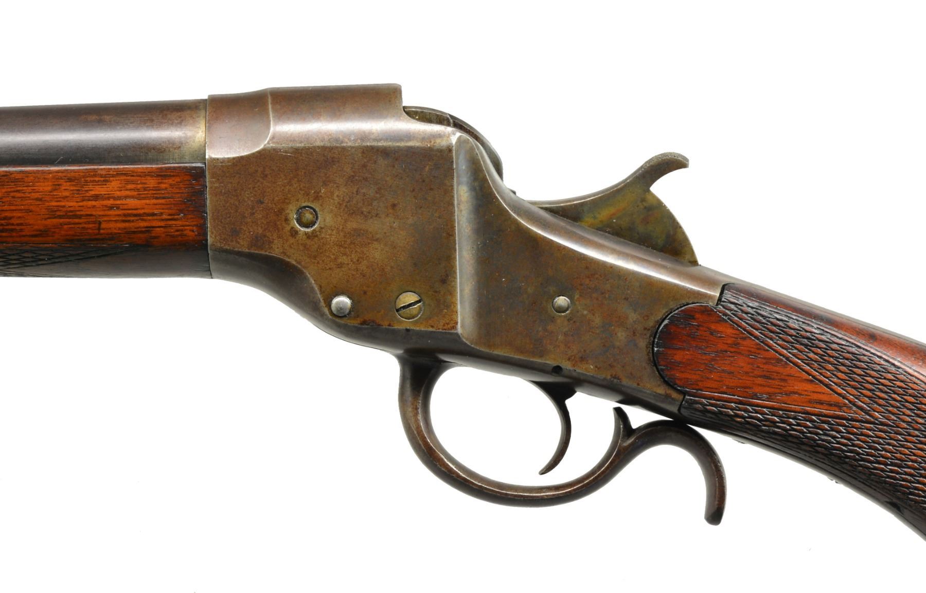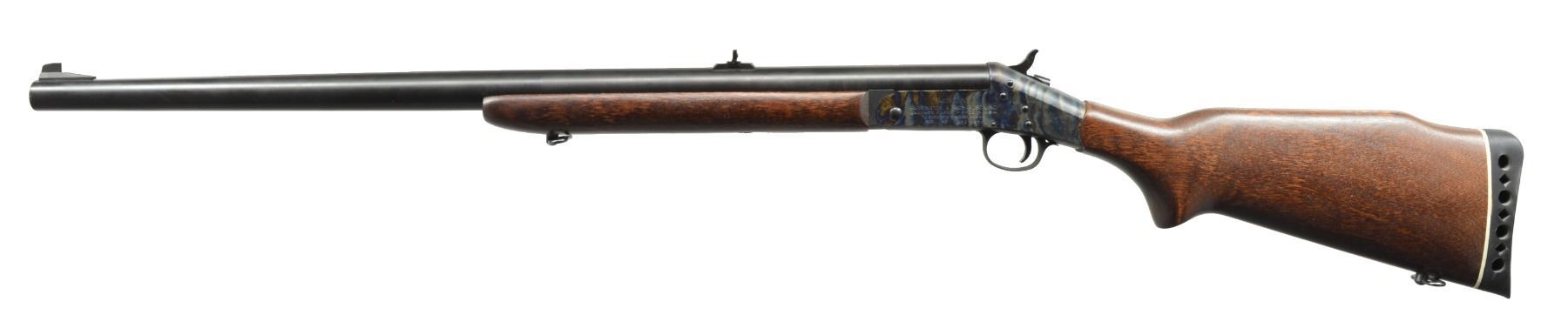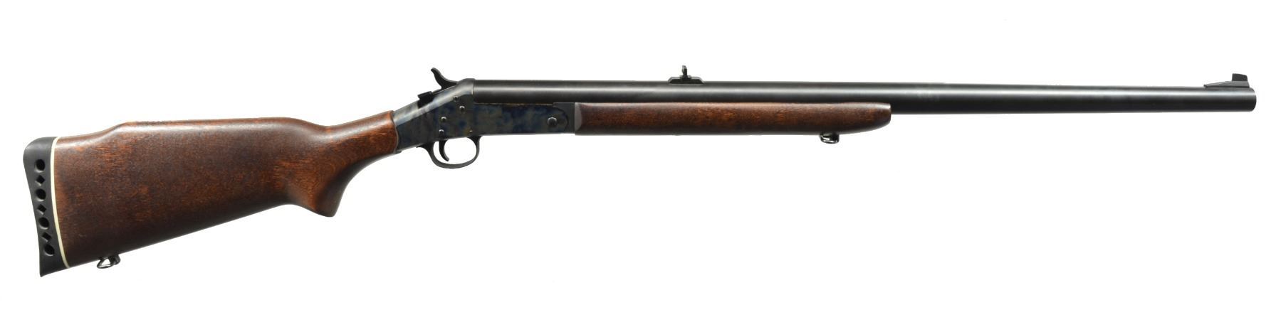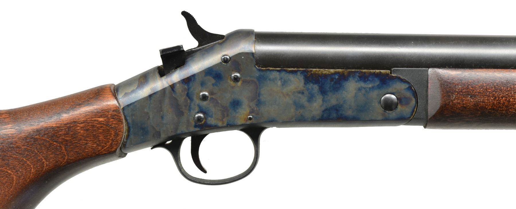 1) AM ARMS CO. SEMI HAMMERLESS. Cal. 12 Ga., 2 3/4". S# 33328. Bbl. 30" Damascus w/ sm. brass bead & full choke. Mfg. 1870's-1880's in Boston w/ nickel plated receiver & buttplate. G.H. Fox Co. started 1853, became American Tool & Machine in 1865, then in 1870 became American Arms w/Fox as primary stockholder; company ceased in 1893. Top lever opening plus left side sideplate having cocking lever. Checkered stock set w/ rnd. knob pistol grip buttstock. CONDITION: good overall appearance w/ sm. marks throughout. Light oxidation following parting line of sideplate. Good Damascus pattern w/ occasional spots of cleaned oxidation. Peppery oxidation on areas of receiver; especially right & bottom. Season crack on forend diagonally left side to bottom. Refinished stock set. Fair to good bore; bright cleaned appearance w/ scattered spots of pitting. (01-17473/NW). ANTIQUE. 2) H&R MODEL 176. Cal. 10 Ga. S# AZ478973. Bbl. 28" cyl. bored Slug Gun w/ folding leaf rear sight & ramp blade front. Mfg. 1982-1986. Case colored receiver w/ opening lever at right of hammer. Stained hardwood stock set w/ swivels & white line ventilated pad. CONDITION: all aspects near excellent including bore. (20-397/NW). MODERN. 3) HOPKINS & ALLEN FALLING BLOCK. Cal. 12 Ga. 2 1/2". S# 6957. Bbl. 28 1/2" w/ cyl. bore. Mfg. 1887 to early 1900's. Blued w/ case colored receiver & checkered walnut stock set; buttstock w/ rnd. knob pistol grip & smooth steel buttplate. Schnabel tipped forend. Matching numbered finger lever. CONDITION: good general appearance w/ faded case colors. Patina appearance to bottom of receiver, lever & buttplate. Minimal marks on forend, buttstock has many marks; most noticeable on left side. Generally good appearing bore w/ cleaned light pitting plus noticeable pitting in chamber area. (20-402/NW). CURIO. 4) DE GASPAR ARZIAGA SxS BOXLOCK. Cal. 12 Ga. 2 3/4". S# 129545. Bbls. 27 1/2" w/ extractor; choked IC & full. Mfg. 1930 in Eibar, Spain w/ dbl. triggers & top tang safety. Matching numbered bbls. plus 656 assembly no. on forend iron, forend, bbls. & bottom plate of action. Checkered stock set having beavertail push button release forend & pistol grip buttstock w/ basket weave pattern buttplate plus cheekpiece & grip cap. Moderately engraved in the white receiver & trigger guard. CONDITION: about good overall appearance w/ numerous cleaned oxidation spots on bbl. & some occasional peppery oxidation spots on receiver. Forend best appearing component of stock set; buttstock w/ numerous scratches & peeling finish along w/ oversized buttplate. Very good plus bores w/ longitudinal streaks of firing residue. Tight action w/ lever just reaching center. (20-405/NW). CURIO. $650-900.