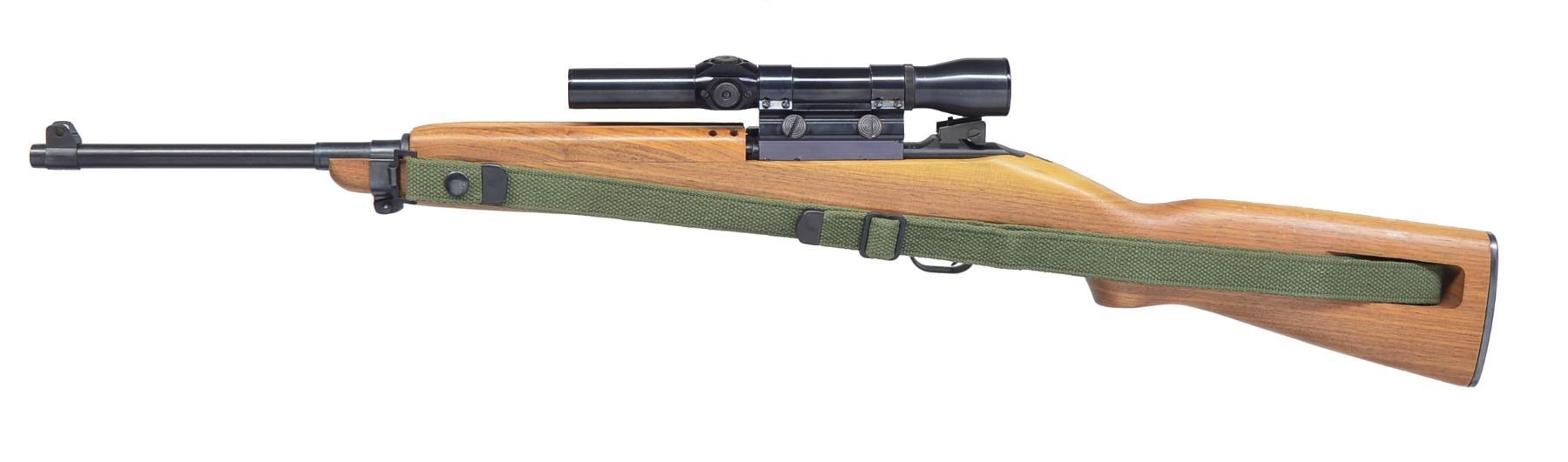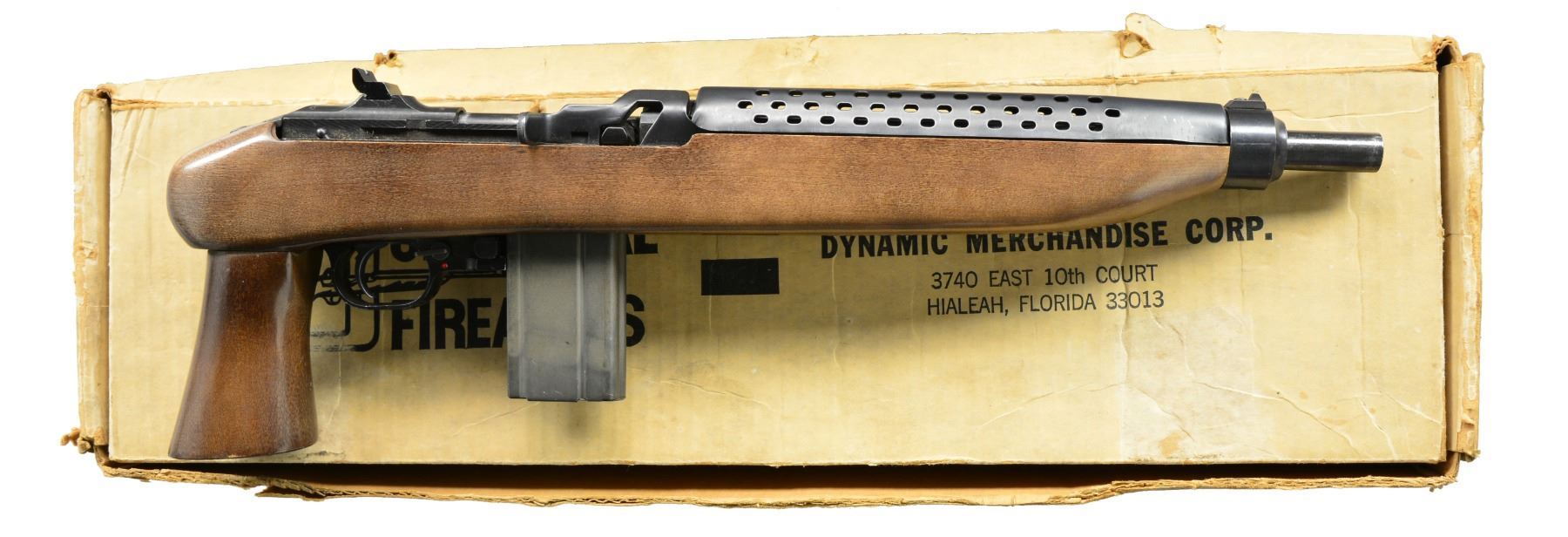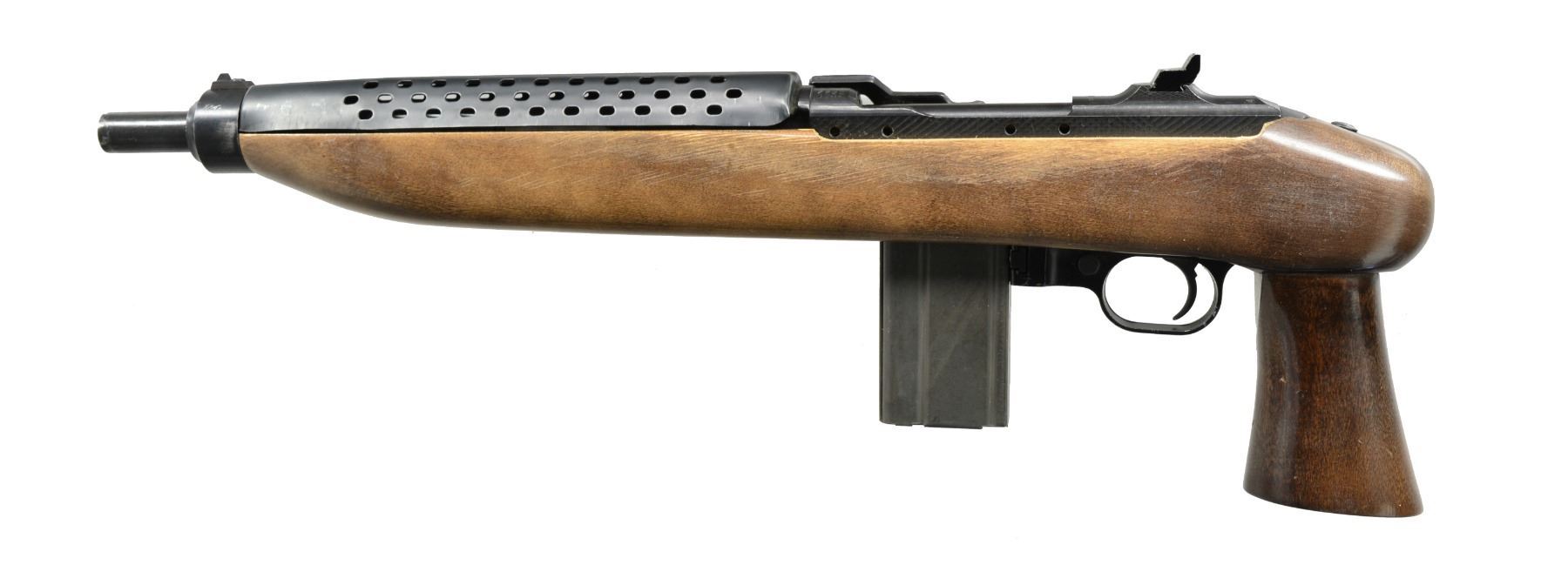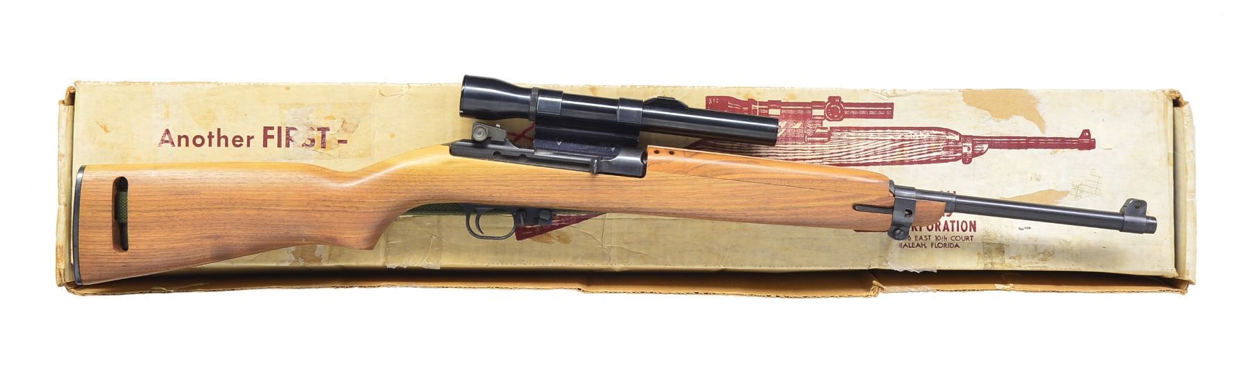 AUTO CARBINE. 1) UNIVERSAL ENFORCER PISTOL. Cal. 30 M1. S#411592. Bbl. 10". The Universal Enforcer is a unique pistol version of the popular M1 carbine. These have caused confusion over the years in relation to bbl. length laws on rifles. but since this is a pistol, such restrictions don't apply. Hardwood stock. Metal heat shield. Non adj. front sight. Rear dovetail sight. Forward of rear sight on top of receiver marked "ENFORCER". MAGS: 1-15 rd. UNATTACHED ACCESSORIES: original cardboard shipping box. After market Universal scope mt. set. CONDITION: good bore w/ strong rifling. Bbl. exhibits thinning finish towards muzzle. Endcap & front sight remains loose. Receiver has been drilled & tapped for scope mt. on left side. Wood stock has been customized by removing material to coincide w/ scope mt. Fire control mechanism appears to function correctly when cycled by hand. (19-5887/JZ). 2) UNIVERSAL M1 SEMI AUTO CARBINE. Cal. 30 Carb. S# 72986. Bbl. 18". Blued exposed metal surfaces. Blonde finished hardwood stock & handguard. Protected blade front sight. Elevation & windage adj. rear ramp peep. Receiver factory drilled & tapped w/ scope mt. on left side. Low magnification fixed power scope. Green canvas sling & oiler. MAGS: none. UNATTACHED ACCESSORIES: matching cardboard box. CONDITION: exterior very good to near excellent. Good bore w/ strong rifling. (19-5925/JZ). BOTH MODERN. $550-900.