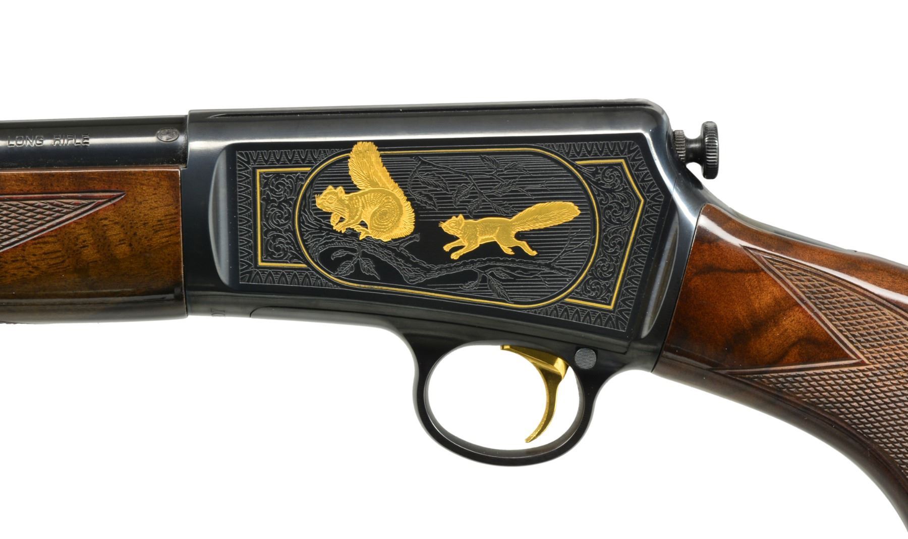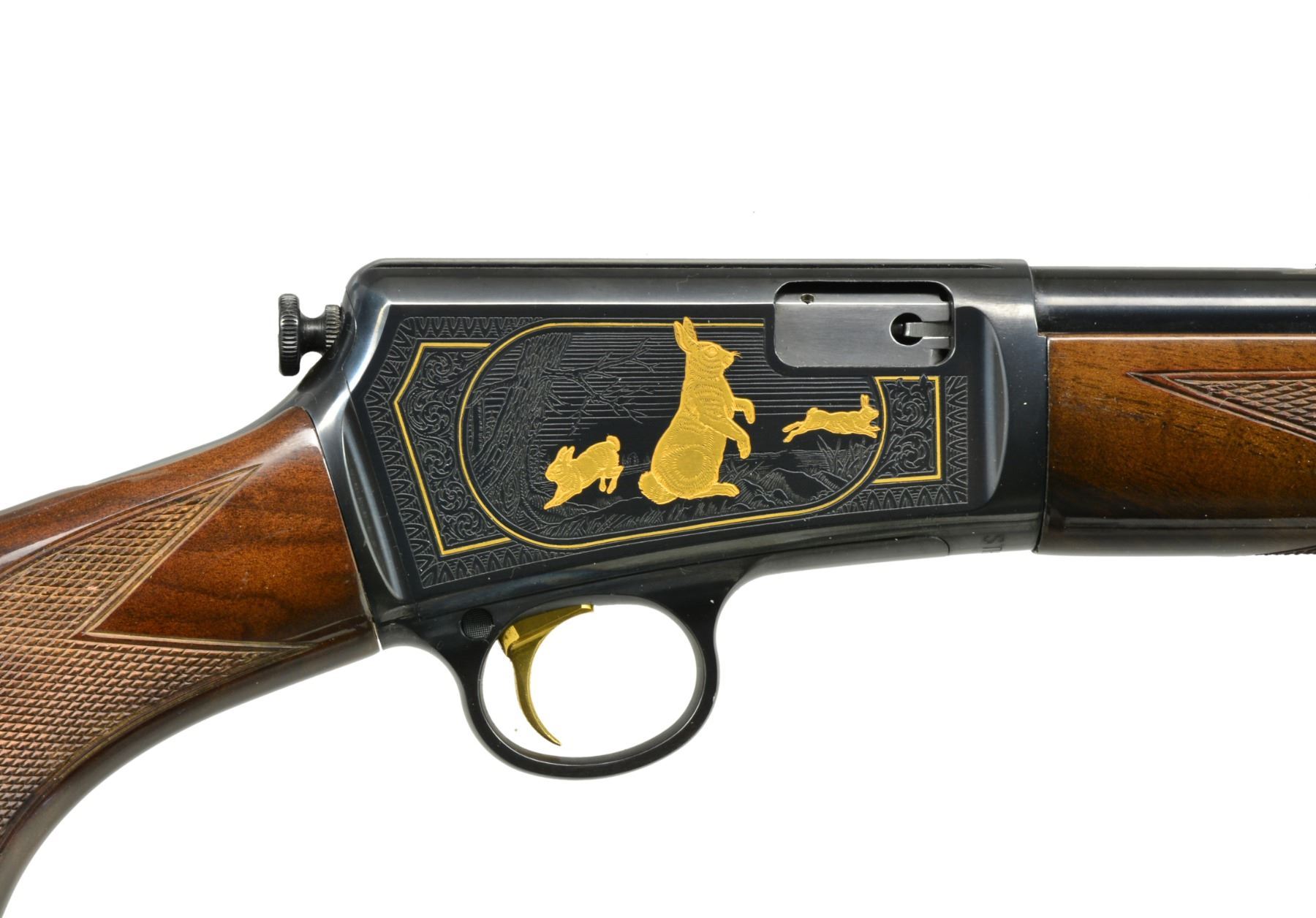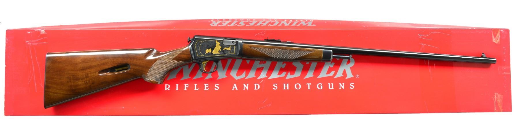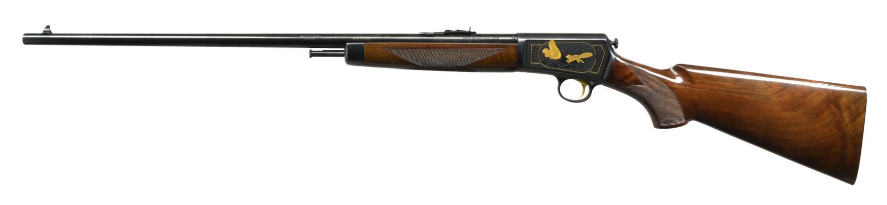 Cal. 22 LR. S# STH0907. Bbl. 23" rnd. w/ sporting sights. Blued receiver w/ grooved top & gold plated trigger. Action has Ulrich style engraving featuring vignettes of gold plated rabbits on right & squirrels on left. Scenes are surrounded by gold lines, foliate scroll highlights & fancy borders. Forearm & pistol grip stock of gloss finished fancy walnut w/ cut checkering. Mag. tube loads through steel buttplate. Limited Edition of 1,000 mfg. 1997. UNATTACHED ACCESSORIES: original box containing instruction manual. CONDITION: over 99% blue. Stock & forearm show some handling markings. Near excellent bore. (20-1384/DS). MODERN. $700-1,100.