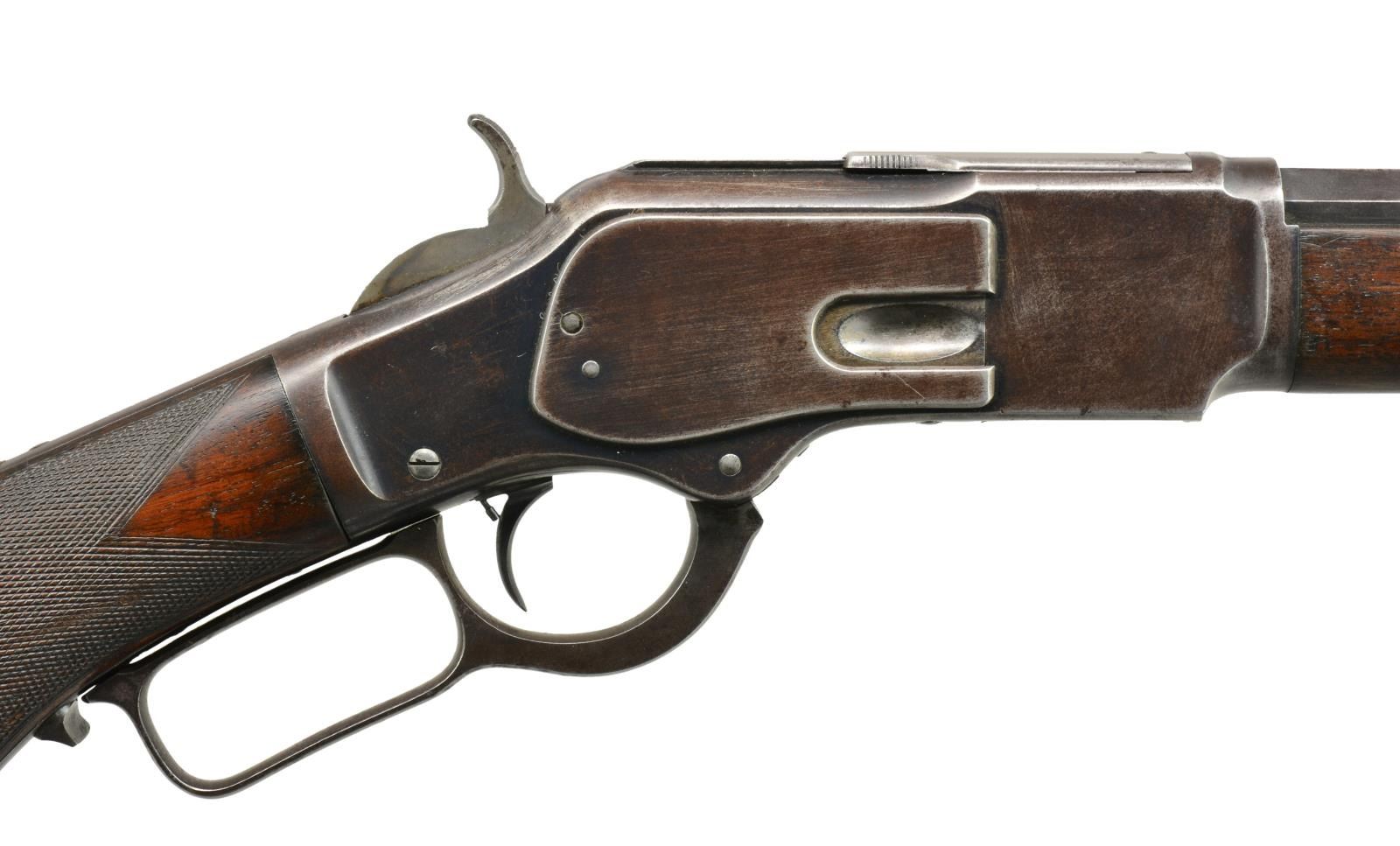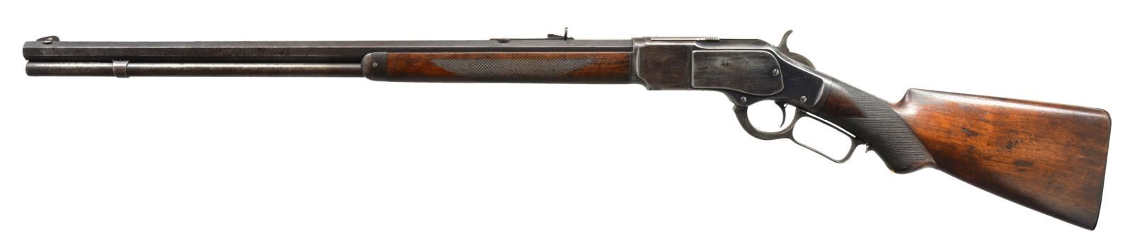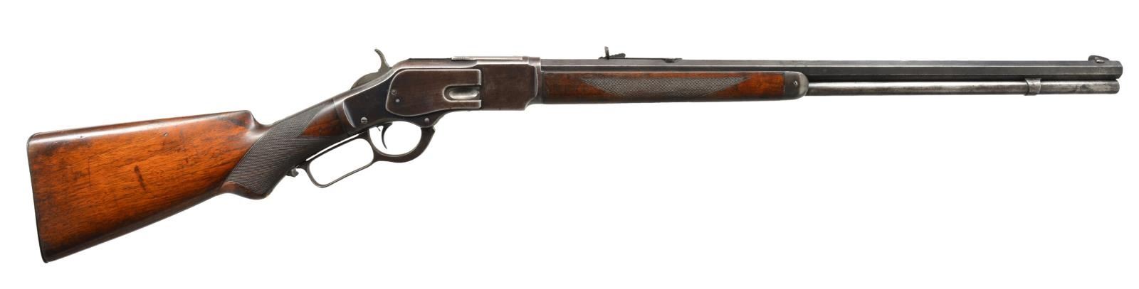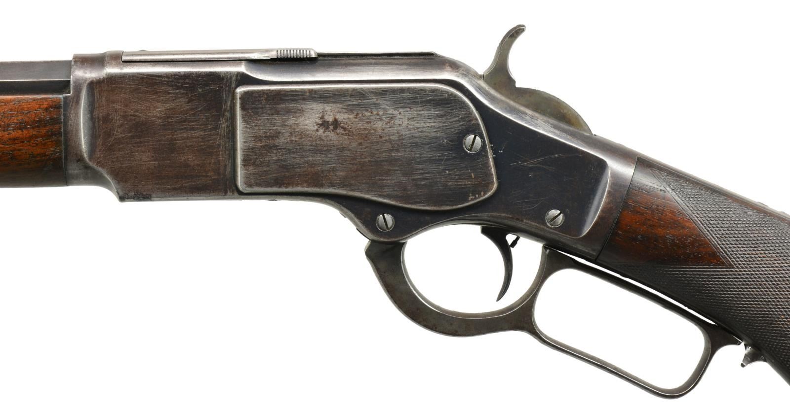 Cal. 38 WCF. NSN. Bbl. 24" oct. Rocky Mountain style front sight w/ semi buckhorn rear sight. Full length mag. tube. Third model rifle w/ blue finish having case colored hammer & lever. Single set trigger. Tang shows no S# indicating replacement. Walnut forearm & pistol grip stock w/ style H factory checkering & steel shotgun buttplate. Pistol grip has replacement synthetic ivory inlay. Top tang channel is marked w/ assembly #" 836". Action tangs bear no serial or assembly numbers. CONDITION: 60% dull fade blue showing areas of wear, corrosion & light pitting. Hammer & lever retain some lightly visible case colors. Stocks show moderate wear w/ scattered dents, scratches & handling marks. Bore retains sound rifling showing scattered very light pitting. (20-684/DS). CURIO. $8,000-12,000.