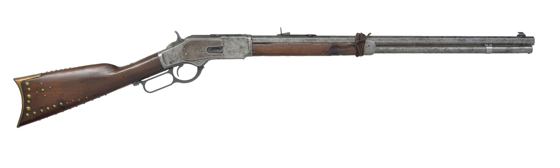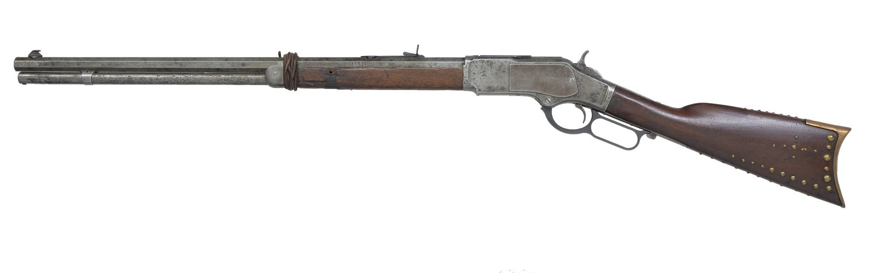 Cal. 38 WCF. S# 142769A. Bbl. 24" oct. Full length mag. Sheard front sight, semi buckhorn rear sight, dust cover, firing pin, lever, lifter & some screws are modern replacements. Walnut forearm & straight grip stock w/ replacement brass trapdoor buttplate. Stock is ornamented w/ a total of 60 brass tacks of various diameters. Forearm is held at front by leather thong. 1883 Mfg. CONDITION: bbl. & action have cleaned gray appearance showing areas of heavy pitting & numerous dents. Forearm has long chips missing along both sides w/ cracks, holes & smaller chips at front & rear areas. Stock is refinished & undersized showing numerous dents & handling marks. Dark pitted bore. (01-17623/DS). ANTIQUE. $600-800.