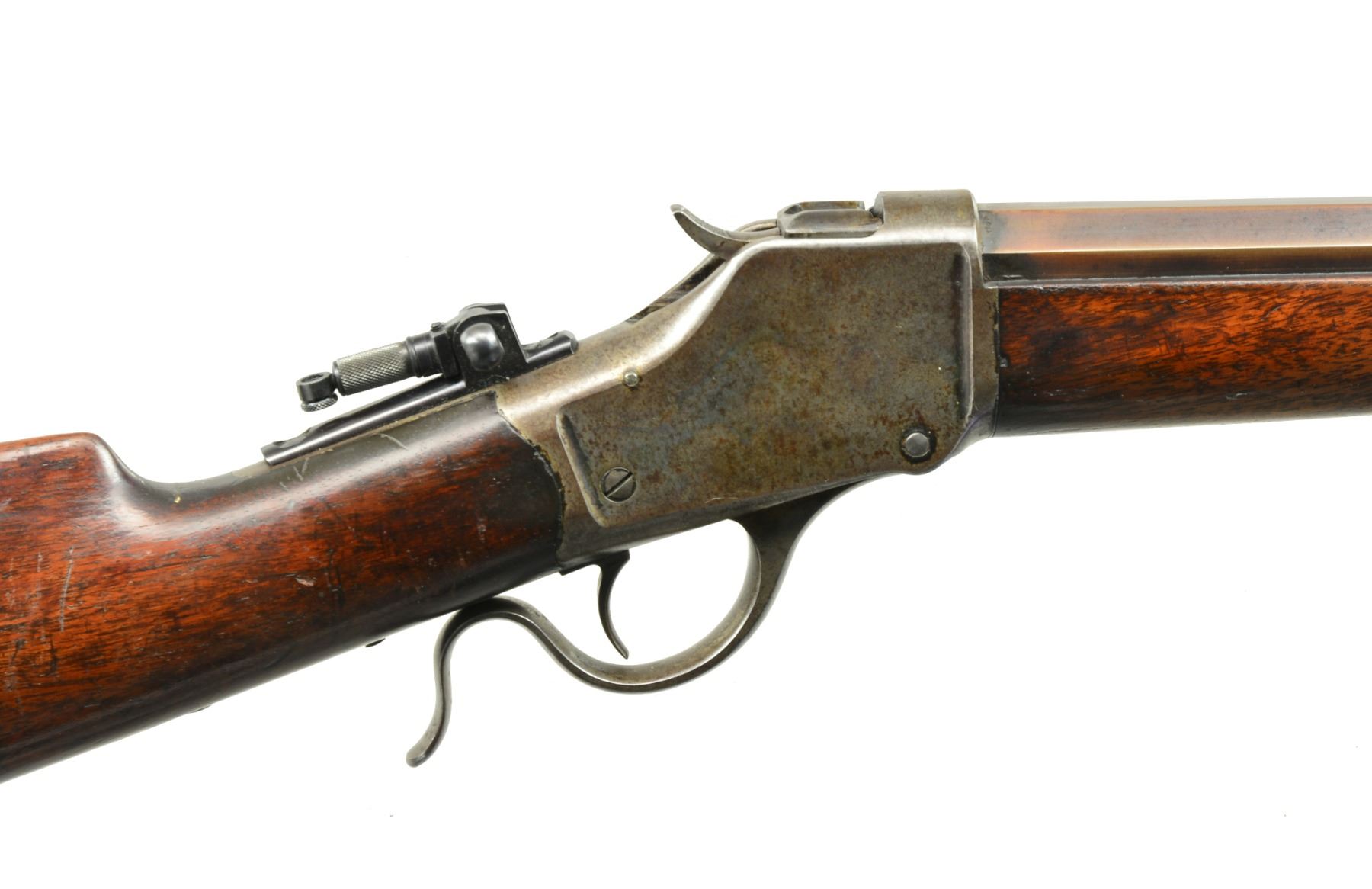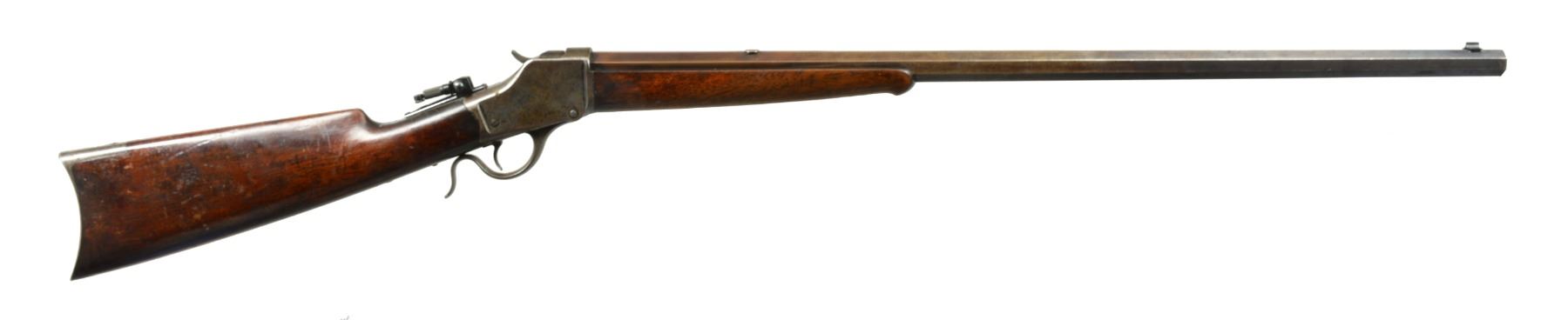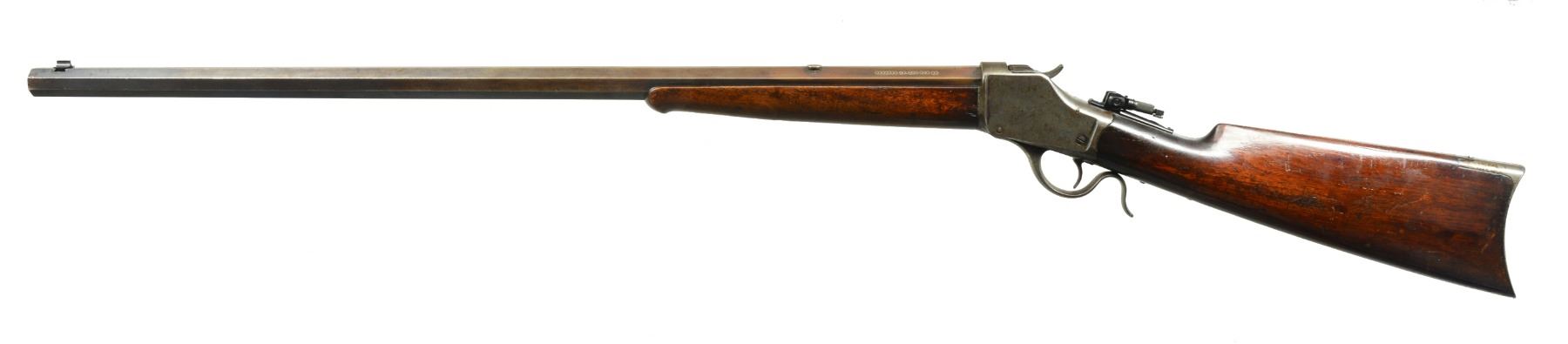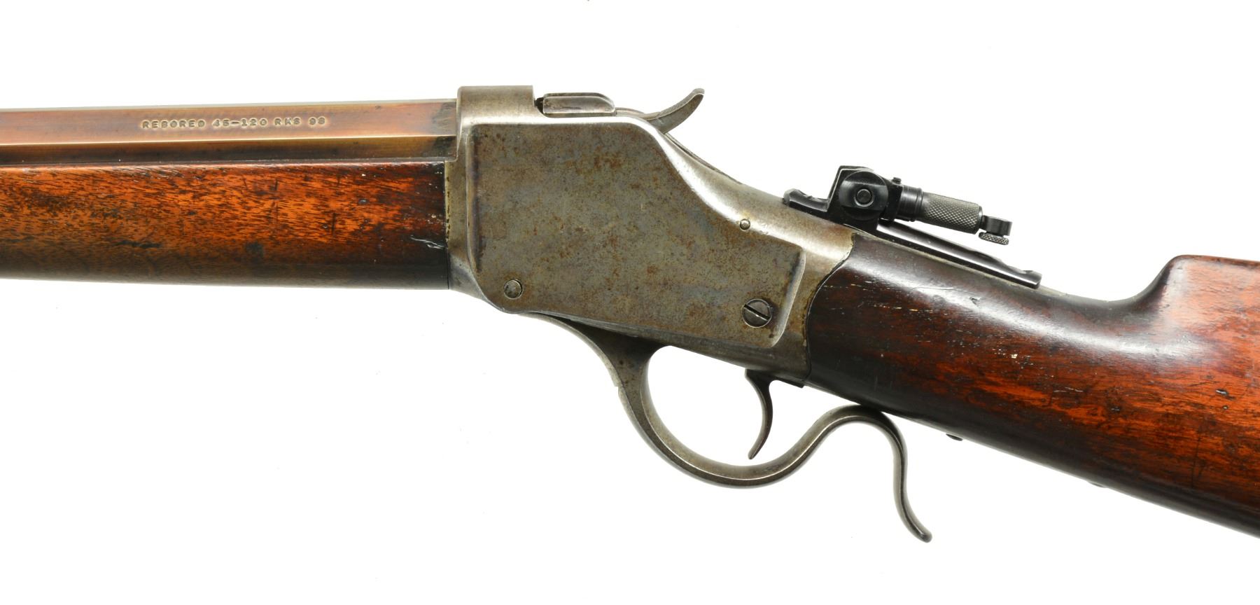 Cal. 45-120. S# 31468. Originally in 32-40, the 30” no. 3 weight full oct. bbl. marked “REBORED 45-120 RKS 98” on rear of top left flat. A slot blank is in rear dovetail. Casehardened action has no extra features. Top tang fitted w/ reproduction folding peep sight. Buttstock of plain American walnut measures 13 3/8” over crescent butt. Forend is of typical style w/ inset ebony tip. CONDITION: good. Metal parts retain traces of original finish, bbl. mostly brown. Action has traces of color & overall pinprick pitting. Stocks retain most of what appears to be their original finish w/ numerous marks, rubs, dings & a coat of added oil. Bore is very fine, sharp & shiny throughout. Mechanically fine. (01-17506/MGM117). ANTIQUE. $1,750-2,500).