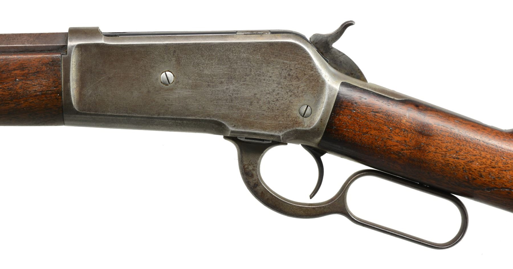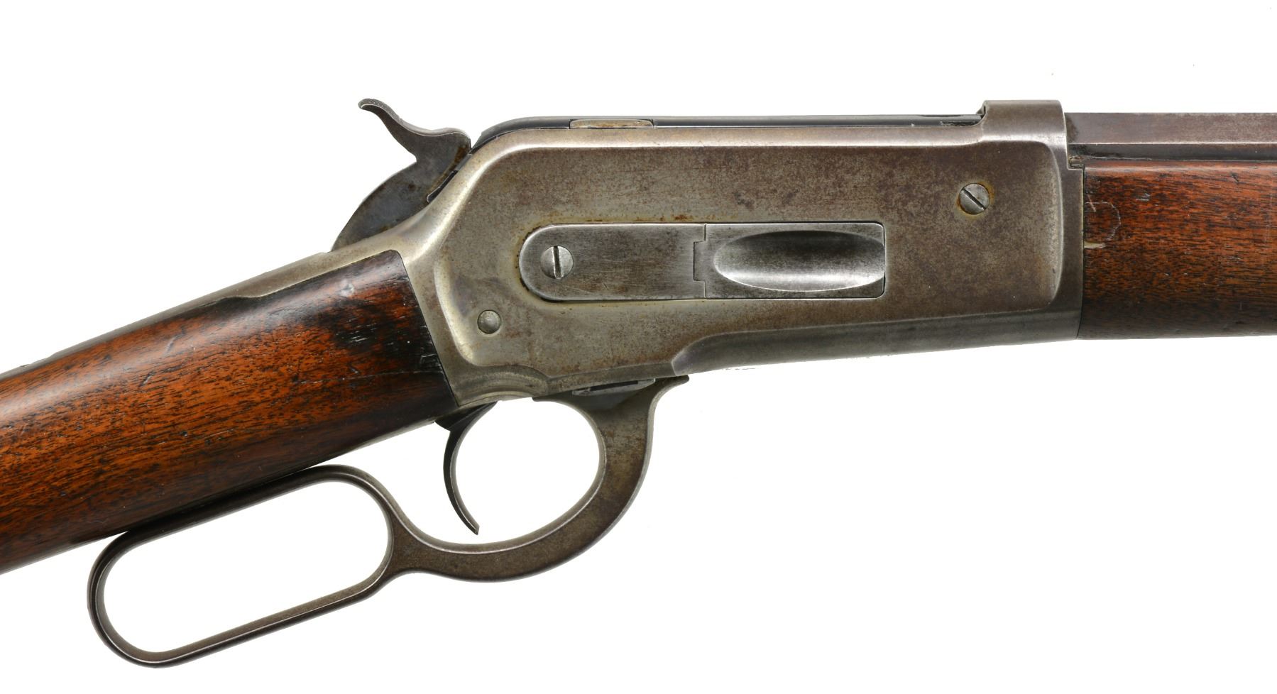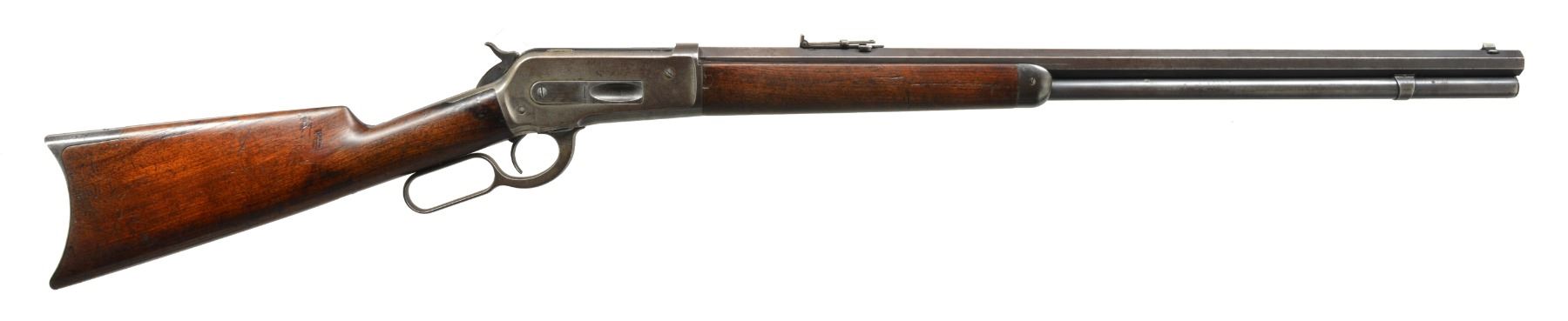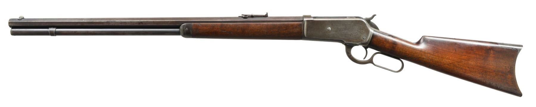 Cal. 45-70. S# 87840. Bbl. 26" oct. Sporting front sight w/ graduated leaf rear sight. Full length mag. Case colored action. Walnut forearm & straight grip stock w/ crescent steel buttplate. 1894 Mfg. CONDITION: bbl. & mag. tube retain some dull blue fading to patina & showing scattered spots of corrosion. Action retains faint traces of case colors w/ balance fading to gray. Stock & forearm have worn appearance showing numerous scratches & marks. Bore retains intact rifling w/ scattered light pitting & slightly darkened appearance. (01-17408/DS). ANTIQUE. $1,750-2,500.