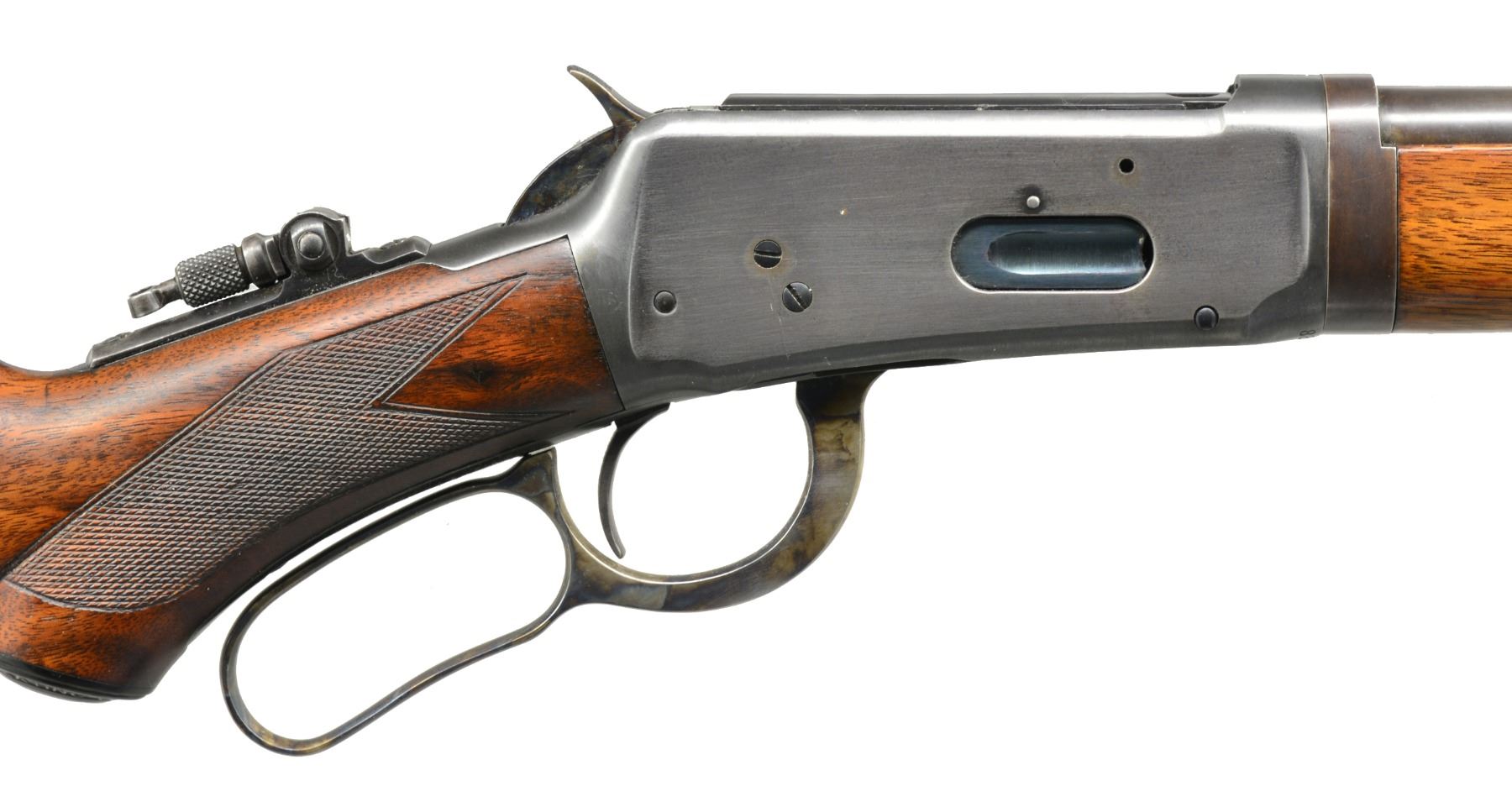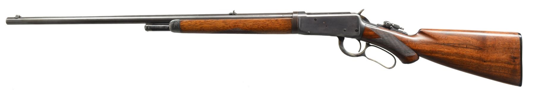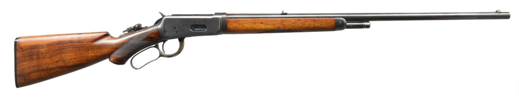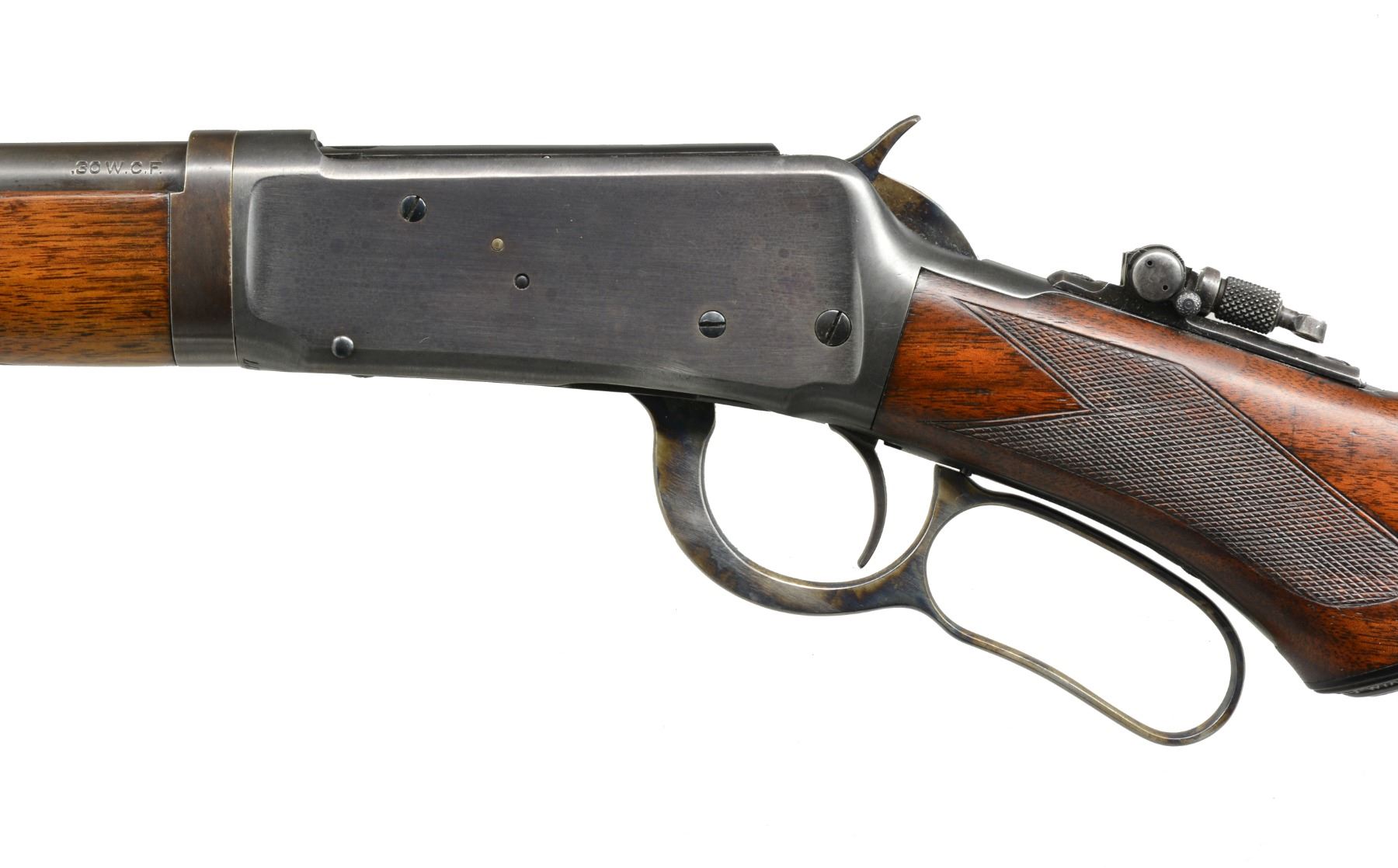 ACTION RIFLE. Cal. 30 WCF. S# 880277. Bbl. 26" rnd. w/ blade front sight, Lyman No. 6 folding leaf rear sight & combination tang sight. Half length takedown mag. Walnut forearm & capped pistol grip stock w/ hard rubber shotgun buttplate having style I factory checkering. 1920 Mfg. CONDITION: bbl., mag. tube & receiver retain 80% lightly faded reblued finish. Hammer, lever & forearm cap have added heat colored finish. Wood is sanded & refinished showing light handling marks w/ lightly freshened checkering. Bore retains sound rifling. (20-661/DS). CURIO. $2,000-3,000.