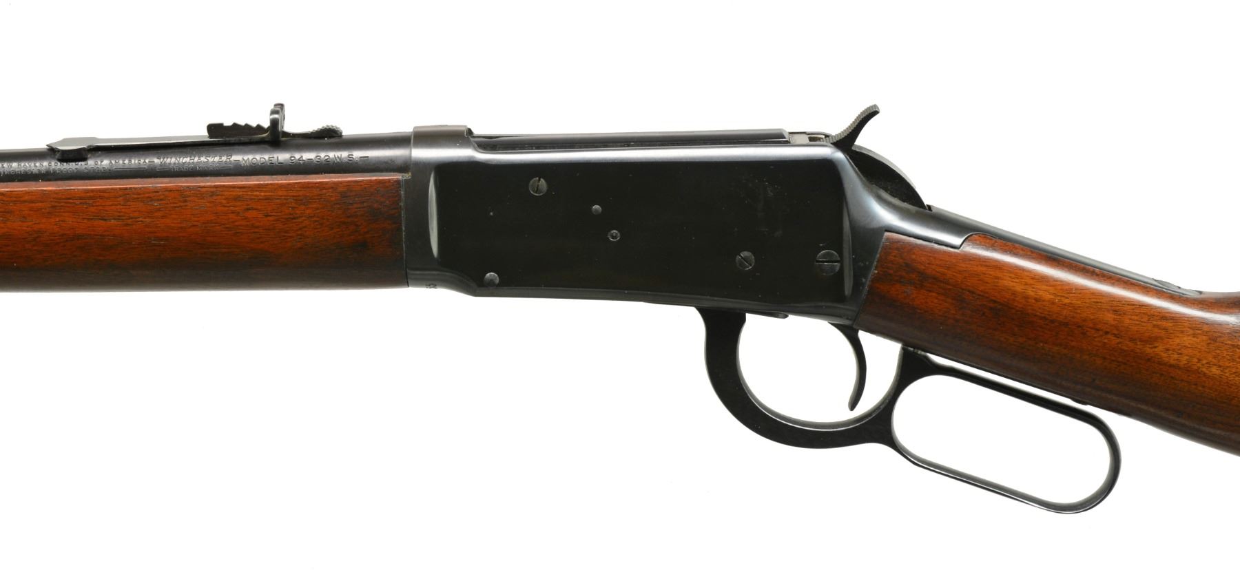 Cal. 32 Win. Spl. S# 1620155. Bbl. 20". Nice example of Pre 64 Model 94 Winchester Longwood forend mfg. 1949. Open sporting rear sight. Integral ramp front sight w/ gold colored bead & protective hood. Bbl. markings include “Winchester MODEL 94 32 W.S.”. Straight grooved hammer. Matching straight grip walnut stock set. Fine checkered steel buttplate. CONDITION: stock set has nice appearance w/ scattered sm. scratches & handling marks throughout. Metal has 95% blue w/ several sm. handling marks. Near excellent shiny bore. (20-760/RW). CURIO. $500-750.