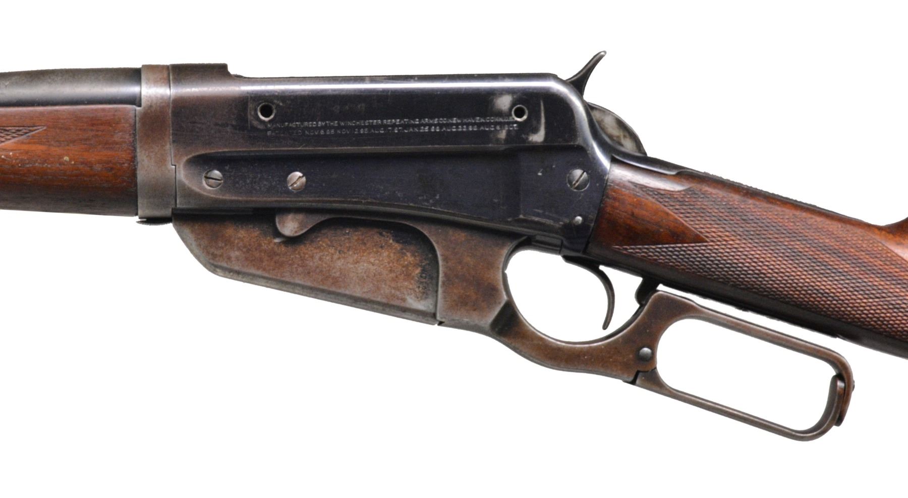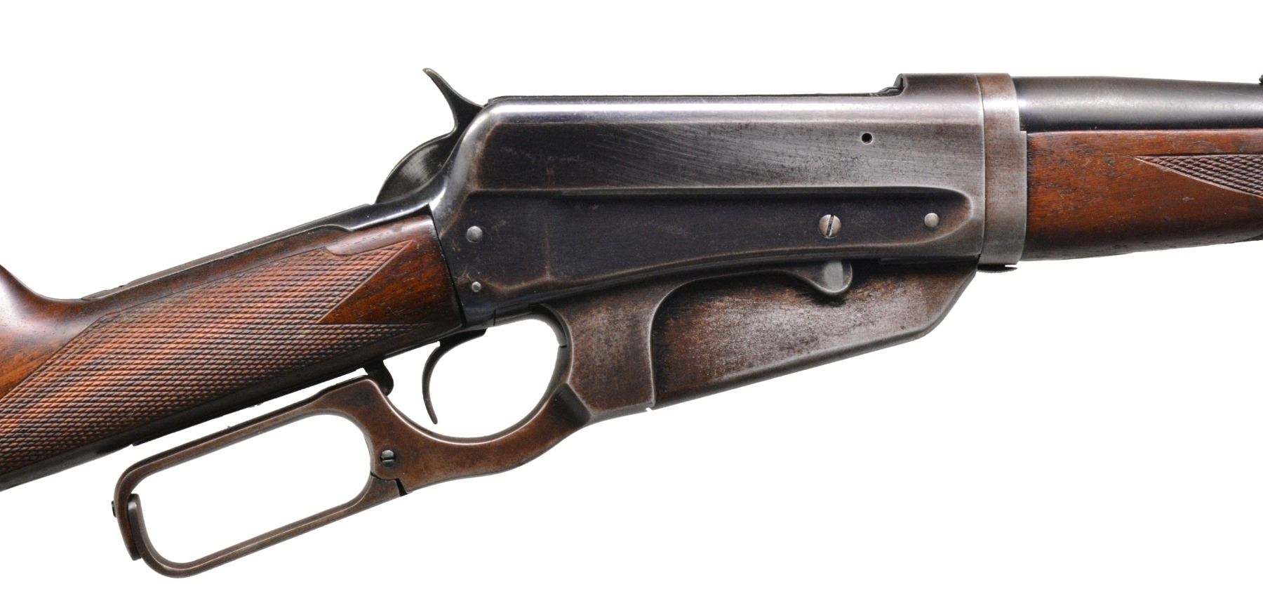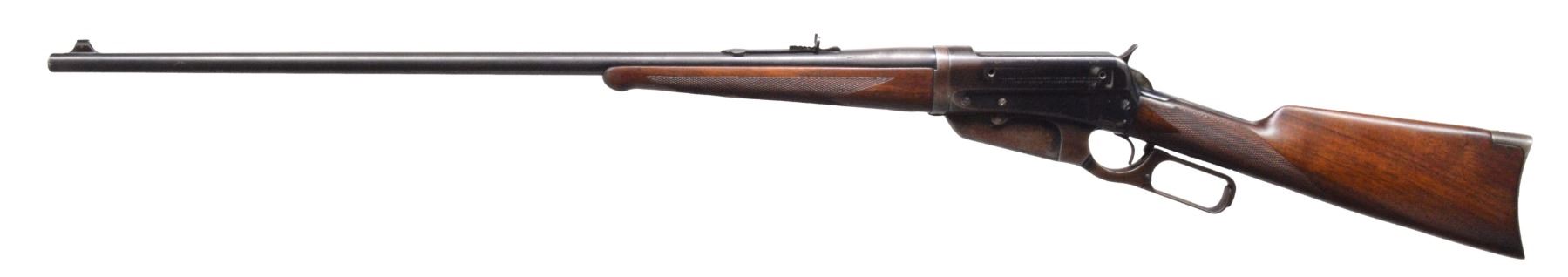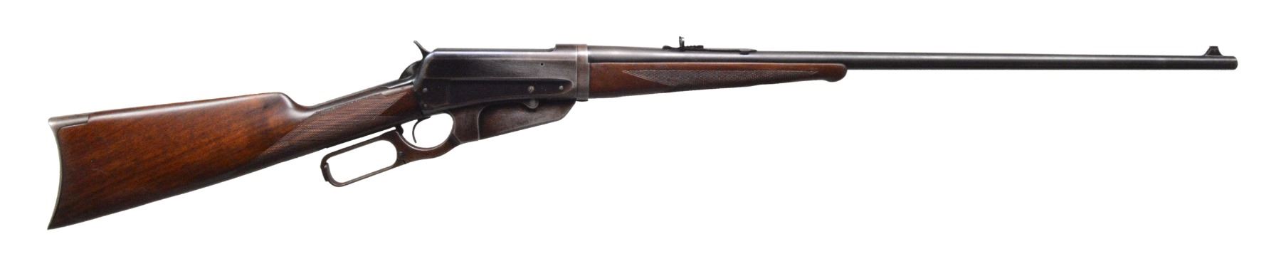Cal. 30 Army (30-40 Krag). S# 412326B. Bbl. 28" rnd. w/ pinned blade bead front sight & elevator adj. sporting rear sight. Blue finish. Left side of action has 2 added open holes for sight attachment. Schnabel tipped forearm w/ ebony insert & straight grip walnut stock w/ crescent steel buttplate. Stock & forearm have aftermarket point pattern checkering w/ German Silver elliptical inlays on bottom of forearm & toeline of stock. Mfg. 1924. CONDITION: 60% dull blue showing wear in carry areas of scattered areas of very light pitting. Consignor states the stock & forearm were sanded, refinished & nicely checkered by Byron “Bud” Chaples. Stock has sm. chips behind lower tang. Bore has strong rifling. (19-5971/DS). CURIO. $1,000-1,500.