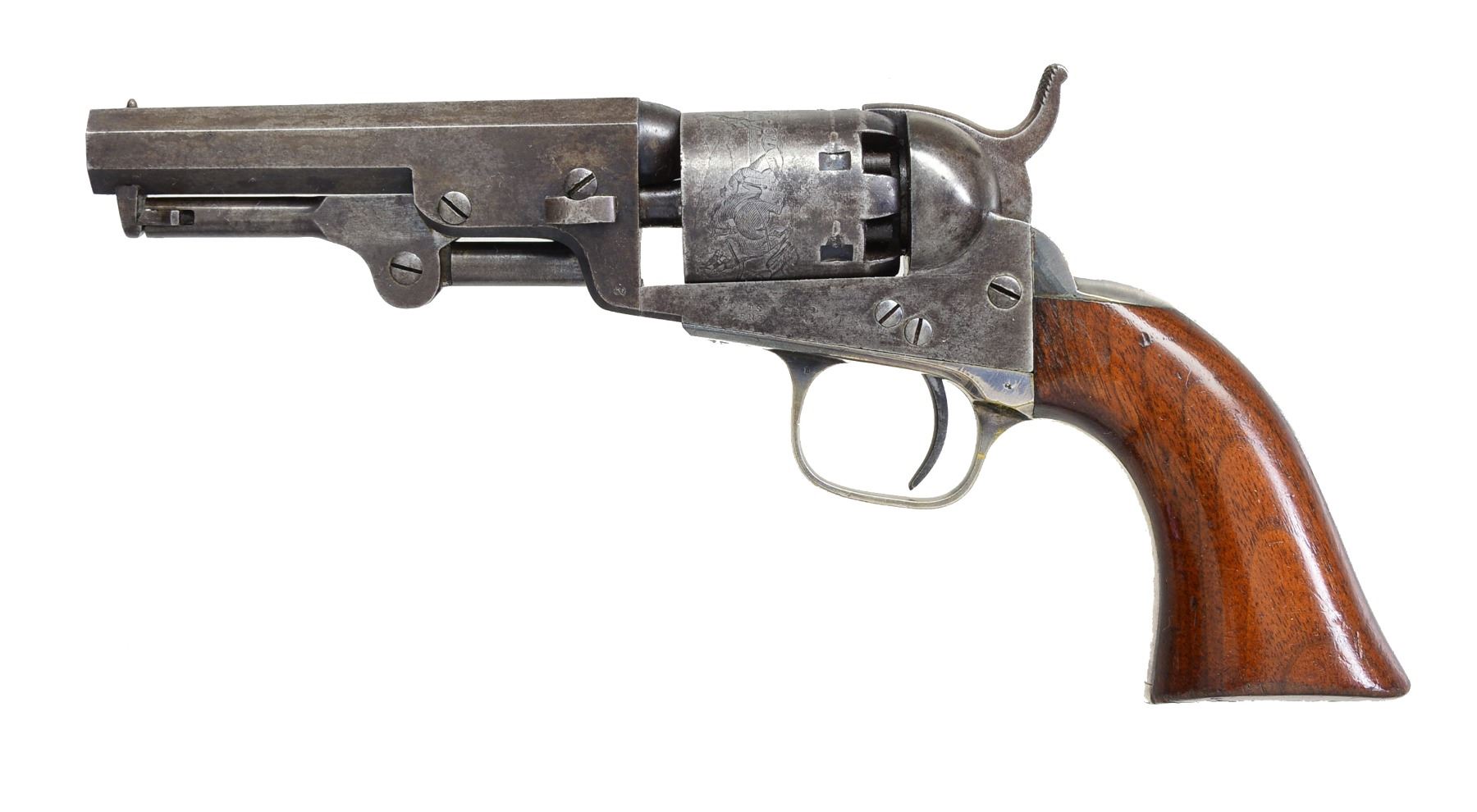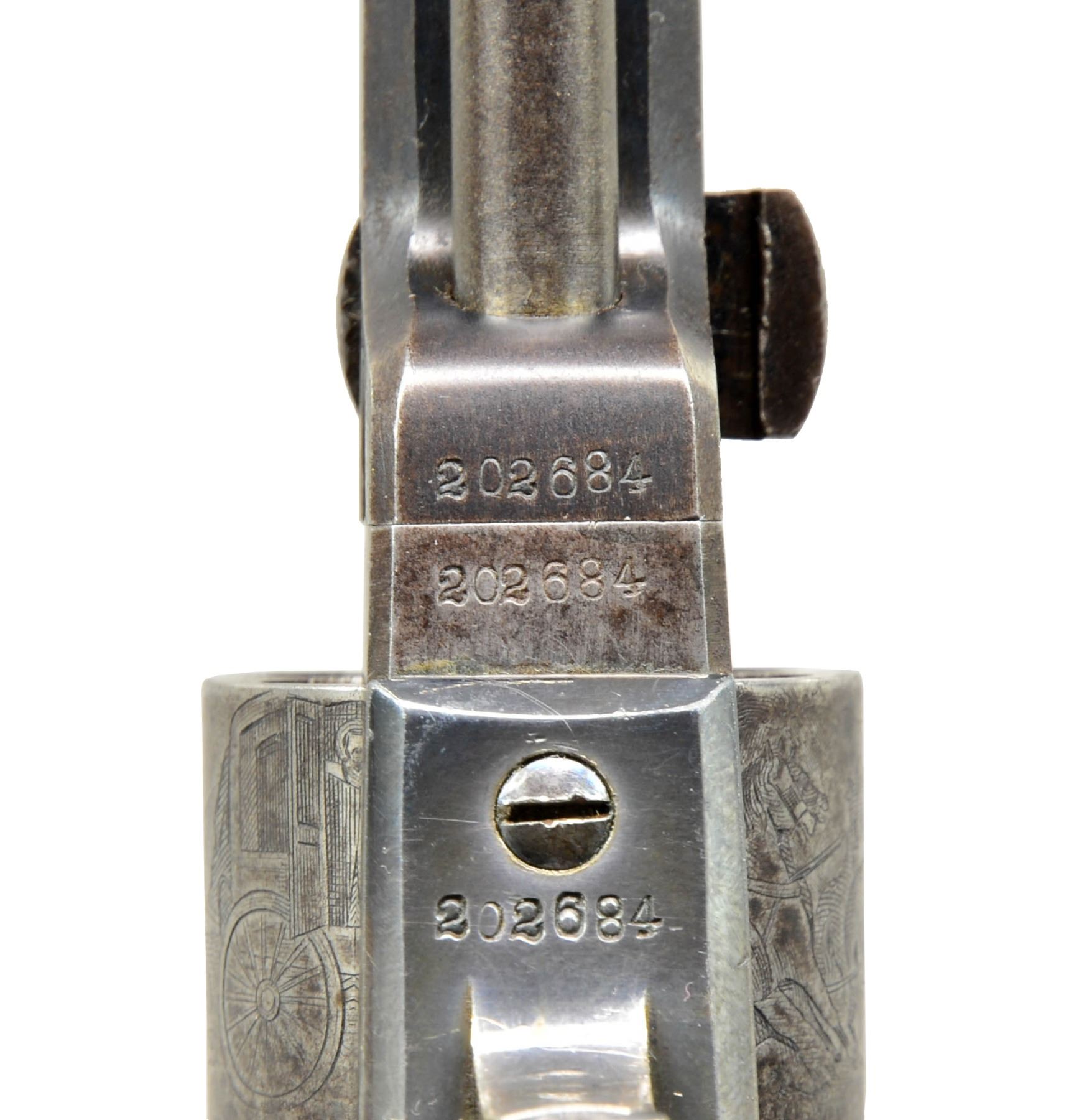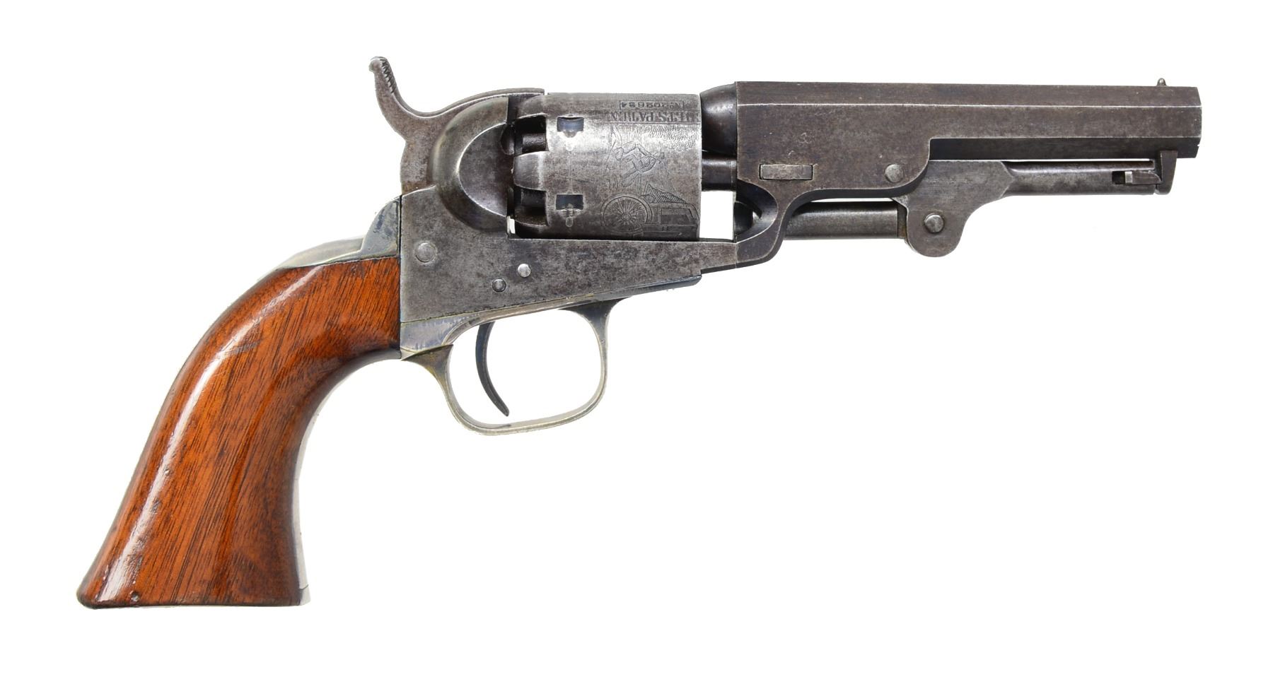 REVOLVER. Cal. 31. S# 202684. Made in 1862 at the peak of the Civil War. 4" Oct. bbl., brass pin front sight & standard 2-line Hartford address. Left side of frame marked "COLT'S PATENT" & has a 6 shot cyl. w/ stagecoach hold up scene roll marking. Silver plated brass trigger guard & backstrap contain a 1 piece varnished walnut grip. UNATTACHED ACCESSORIES: purple velvet lined mahogany case, partitioned for the revolver, 2 piece "Colt's Patent" brass mold, 2 sided eagle flask, Japanned cap tin & loose balls. CONDITION: very good overall. Strong traces of blue are found in protected areas. Rolled cyl. scene is crisp & easily discerned. Cyl. retains 5 crisp safety pins. Trigger guard & backstrap retain most of their silver plate. Well fit grips retain virtually all original factory varnish w/ moderate edge wear. Mechanics are fine w/ crisp frosted bore. Case is sound & solid w/ light scratches & blemishes. Accessories are good. (01-17286/JS). ANTIQUE. $2,000-3,000.