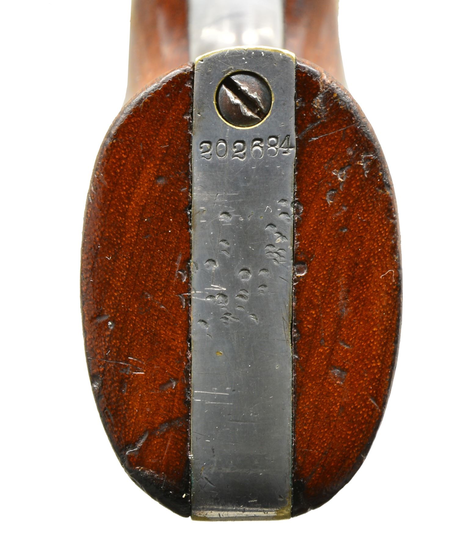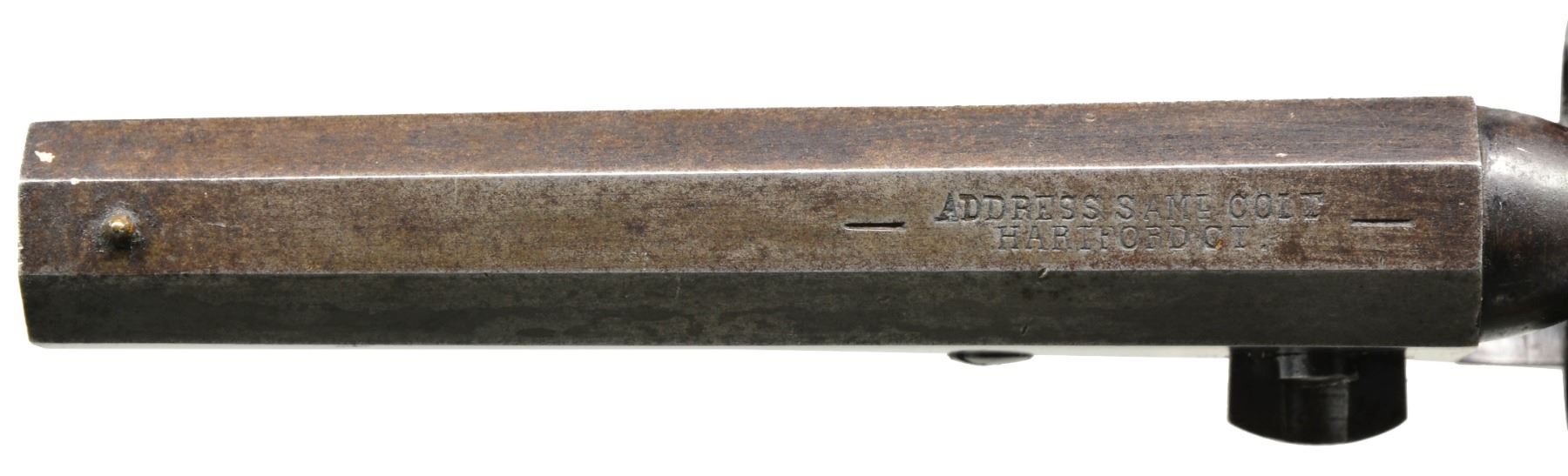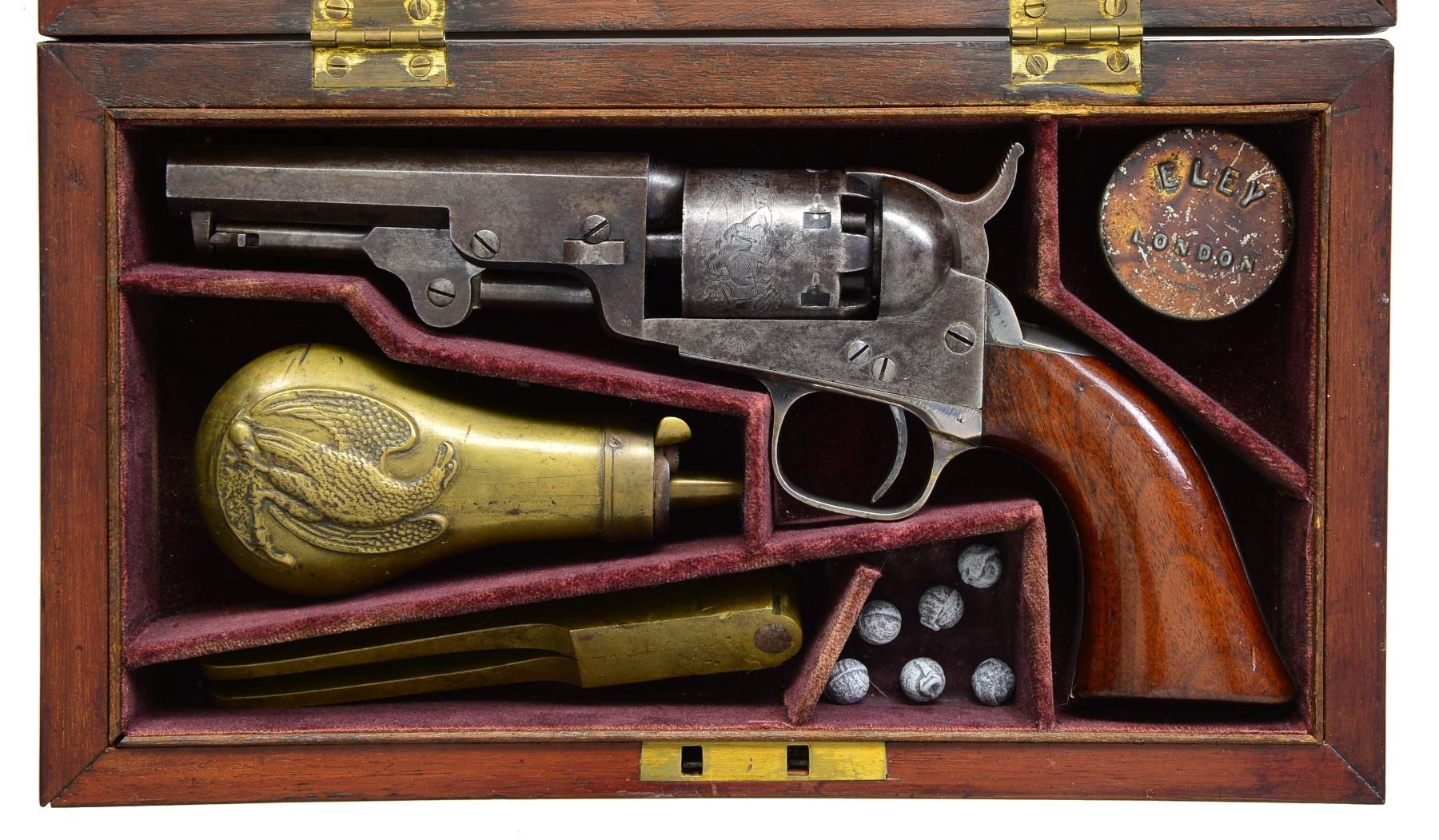 REVOLVER. Cal. 31. S# 202684. Made in 1862 at the peak of the Civil War. 4" Oct. bbl., brass pin front sight & standard 2-line Hartford address. Left side of frame marked "COLT'S PATENT" & has a 6 shot cyl. w/ stagecoach hold up scene roll marking. Silver plated brass trigger guard & backstrap contain a 1 piece varnished walnut grip. UNATTACHED ACCESSORIES: purple velvet lined mahogany case, partitioned for the revolver, 2 piece "Colt's Patent" brass mold, 2 sided eagle flask, Japanned cap tin & loose balls. CONDITION: very good overall. Strong traces of blue are found in protected areas. Rolled cyl. scene is crisp & easily discerned. Cyl. retains 5 crisp safety pins. Trigger guard & backstrap retain most of their silver plate. Well fit grips retain virtually all original factory varnish w/ moderate edge wear. Mechanics are fine w/ crisp frosted bore. Case is sound & solid w/ light scratches & blemishes. Accessories are good. (01-17286/JS). ANTIQUE. $2,000-3,000.