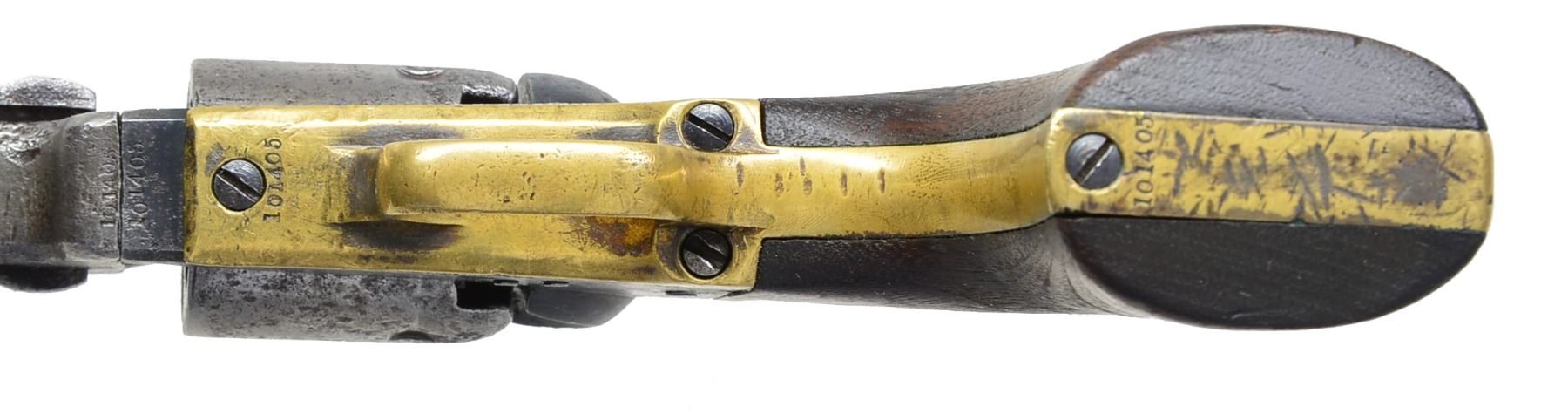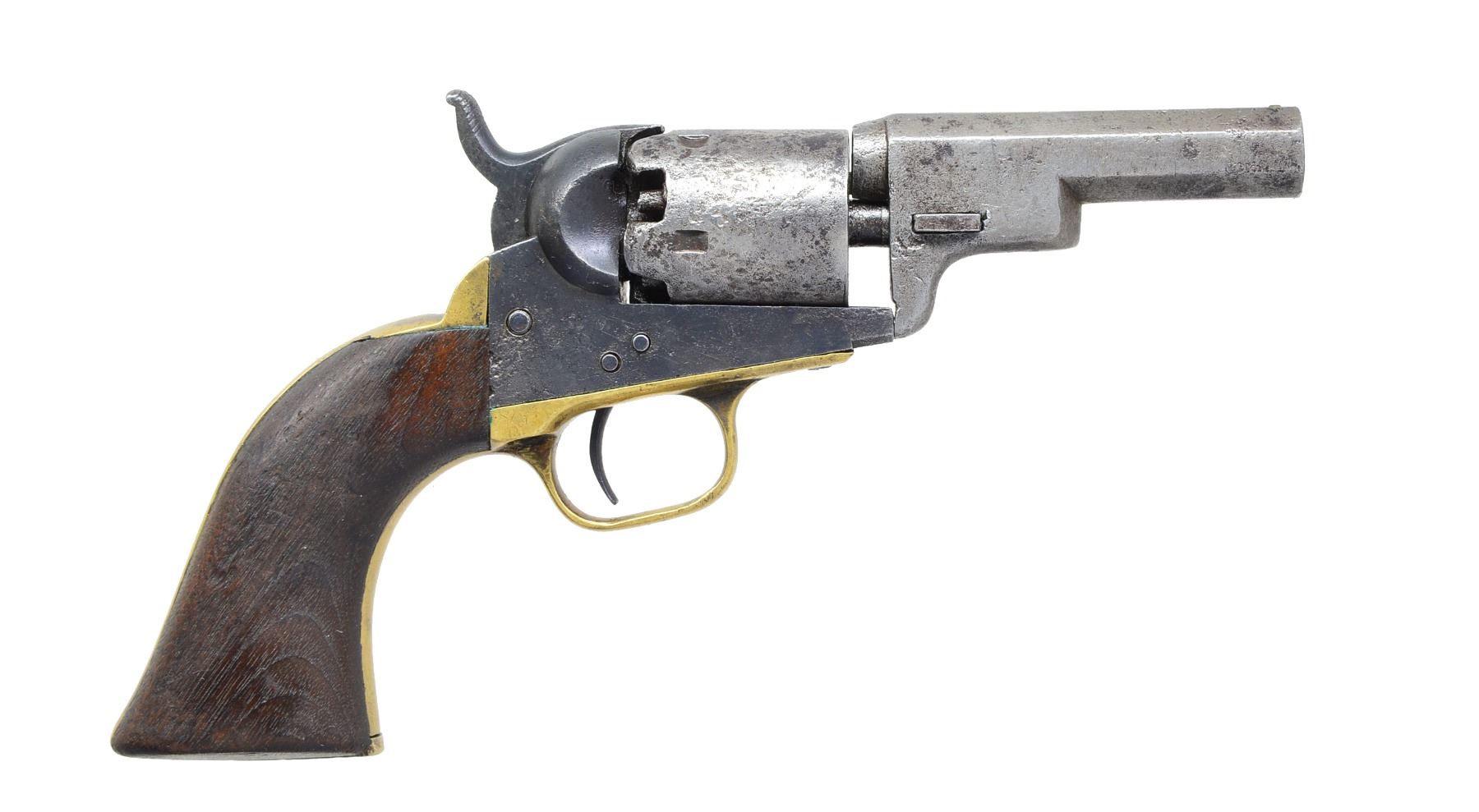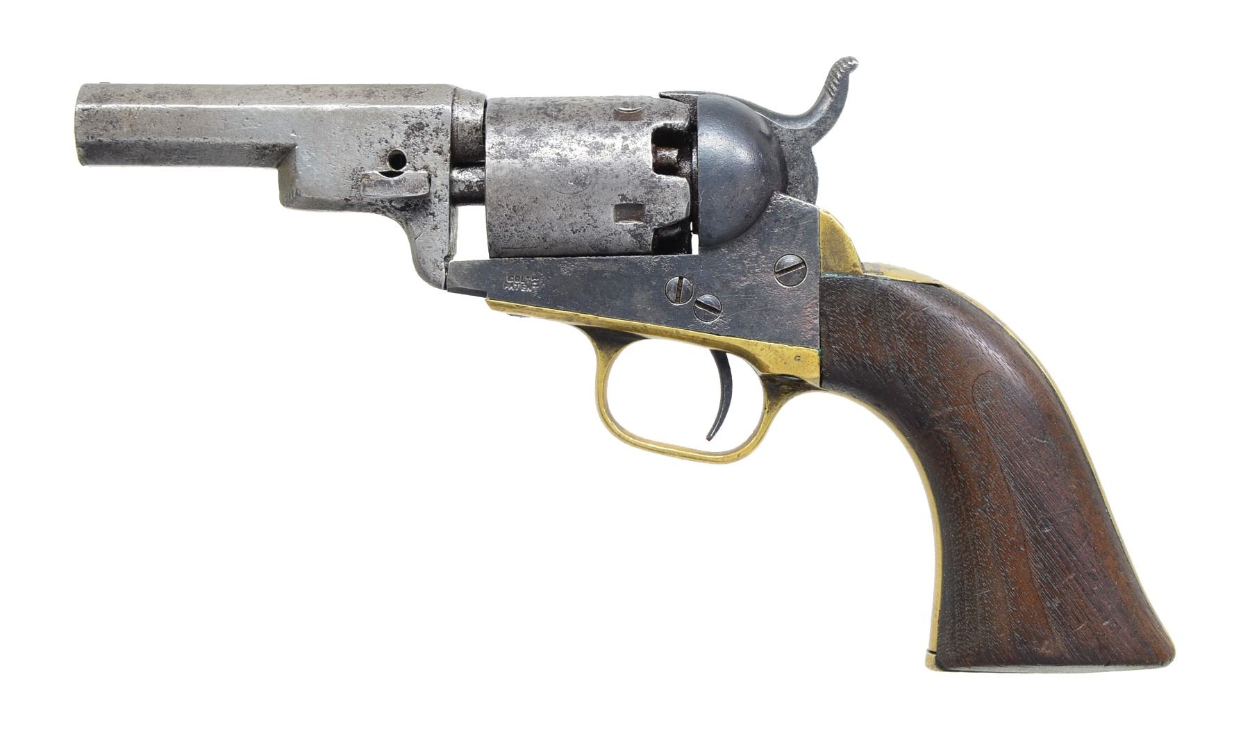 REVOLVER. Cal. 31. S# 101405. Bbl. 3" w/out loading assembly, brass cone shaped front sight, 2 line New York address, 5 shot cyl., left side of frame marked "Colts Patent". Brass trigger guard & butt w/ silver plating, 1 piece walnut grips. CONDITION: fair. All original & matching except wedge which is replaced, no finish, metal is overall gray w/ pitting, cyl. scene has faint traces, but matching S# easily read. Mechanics are functioning. Bore is good w/ pitting. (01-17258/JS). $800-1,200.