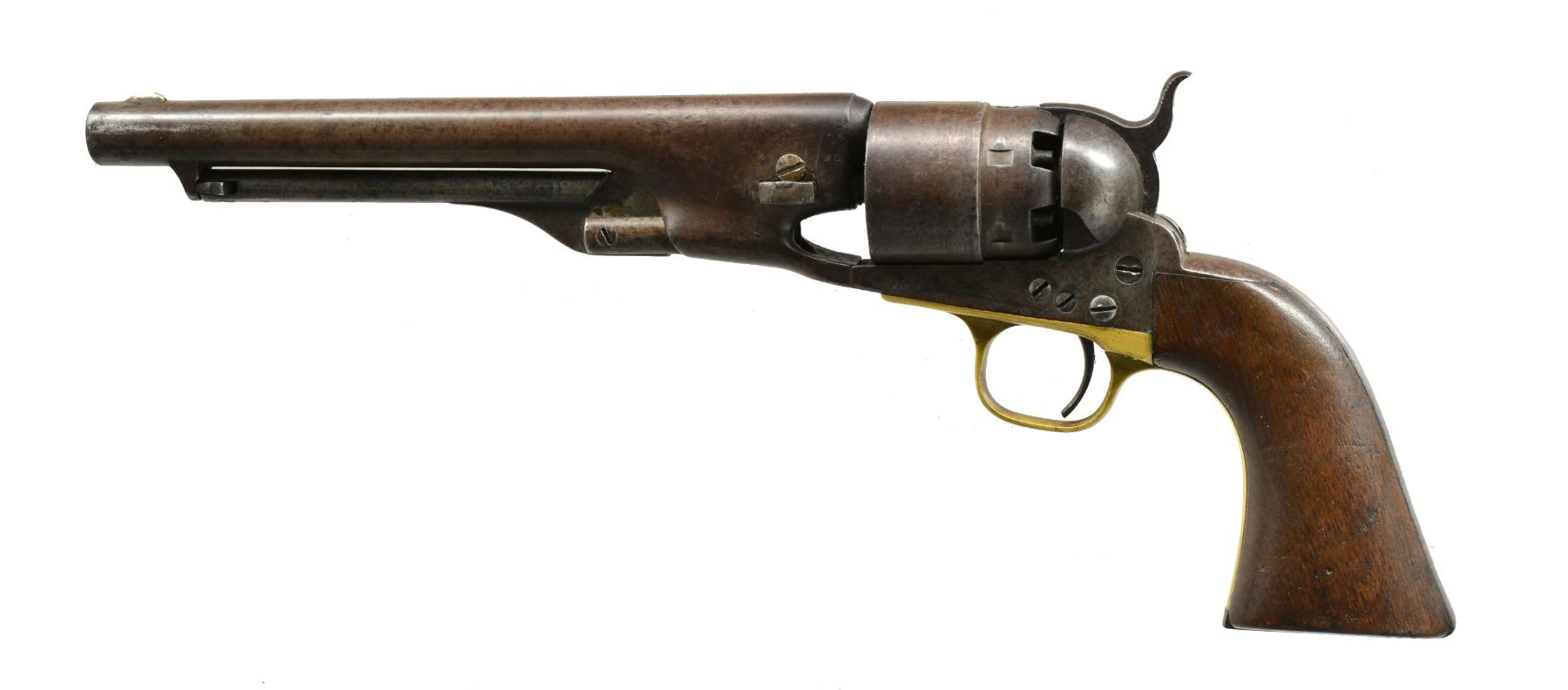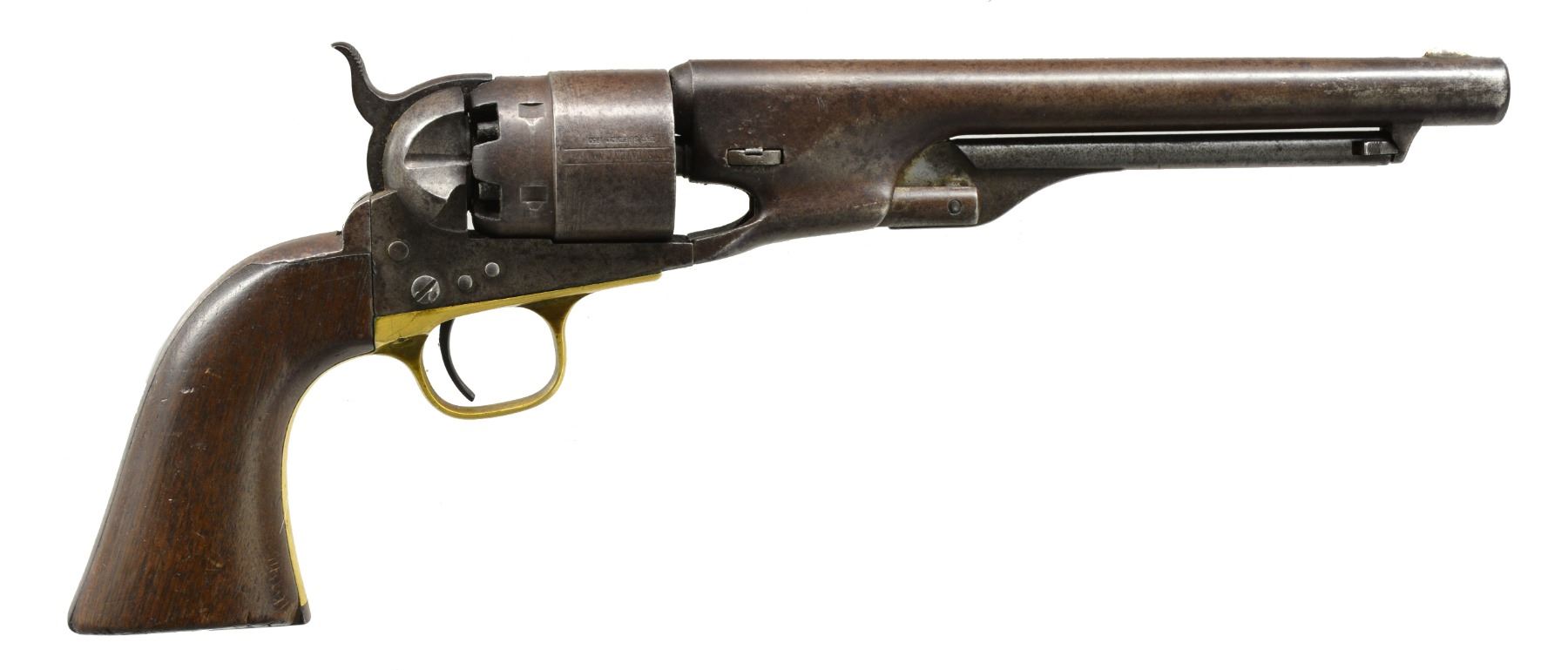 ASSOCIATION, FULLY LOADED. Cal. 44. S# 30690. This is a honest “as found” four screw Colt Army issued in 1861, carved on bottom of grips “MELVIN / IRVINE”. There is only one Union soldier listed in Union Army w/ last name Irvine & first initial M, database lists his name as Marvine. Irvine who enlisted in June 1864 at Camp Nelson KY, in the 114th Colored Troops as a private, no other information available. This gun as found is fully loaded w/ original Colt balls & bullets. CONDITION: good to very good overall, has a mottled gray patina w/ good markings including one line New York address & matching serial numbers though wedge is unnumbered but appears original. Exhibits moderate muzzle wear, cyl. retains 5 usable safety pins & much of its rolled cyl. seam is discernable. Grips have hand worn patina w/ cartouche visible in outline only on left side. Mechanically fine, w/ crisp rifled bore. (01-17119/JS). ANTIQUE. $1,200-1,800.