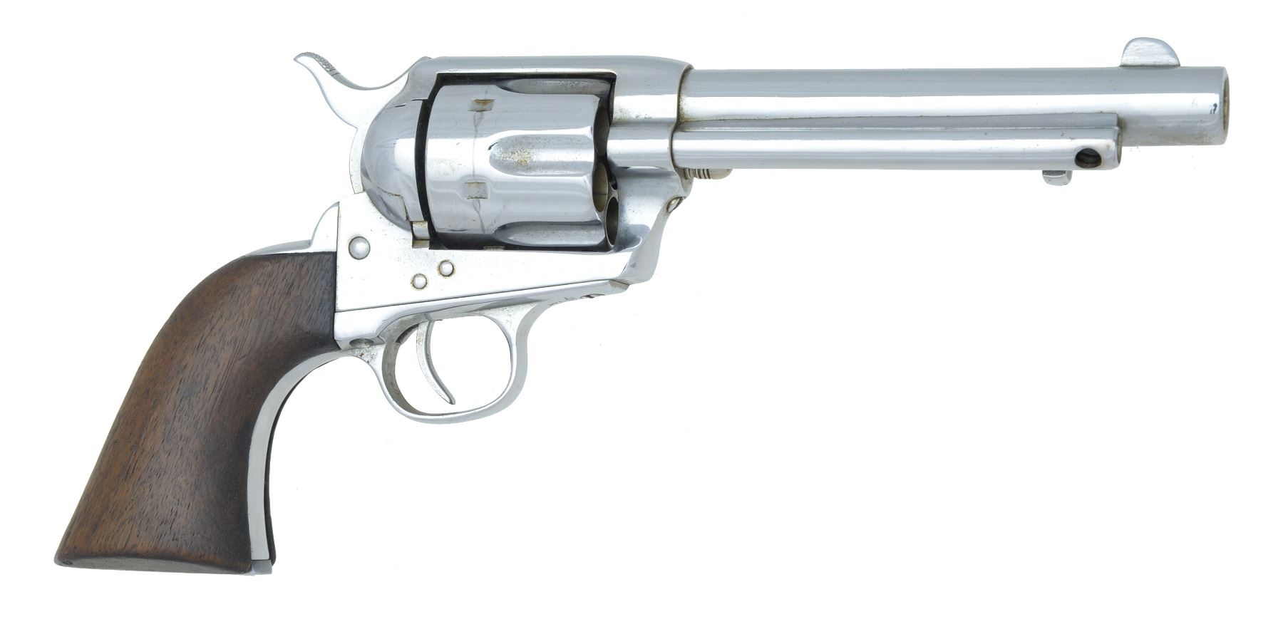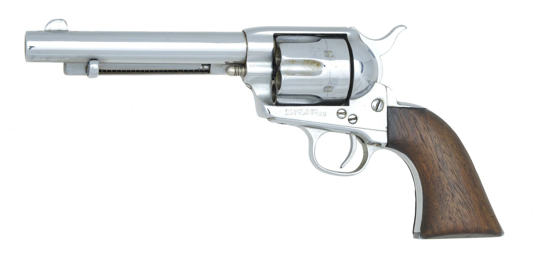 Cal. 45 Colt. S# 137602. Bbl. shortened to 5 1/2" w/ blade front sight. 6 Shot fluted cyl. Full added nickel finish. Frame is S# 137602, trigger guard is numbered 138482. Right side of frame behind patent dates is stamped "U.S". Bottom of frame has "RAC" inspection mark. Trigger guard has "K" inspection marks. Back strap has "L" inspection marks. 1 Piece walnut grips. CONDITION: over 95% added nickel finish over spots of pitting & handling marks. Sanded grips show heavy wear & handling marks w/ sm. chips at toe. Hammer is worn effecting position at full cock. Bore has dark frosted appearance over worn rifling. (01-17118/DS). ANTIQUE. $1,200-1,800.