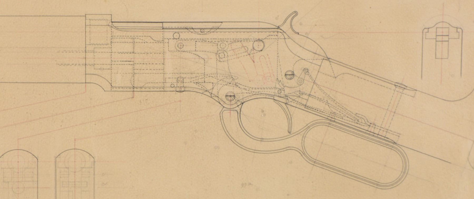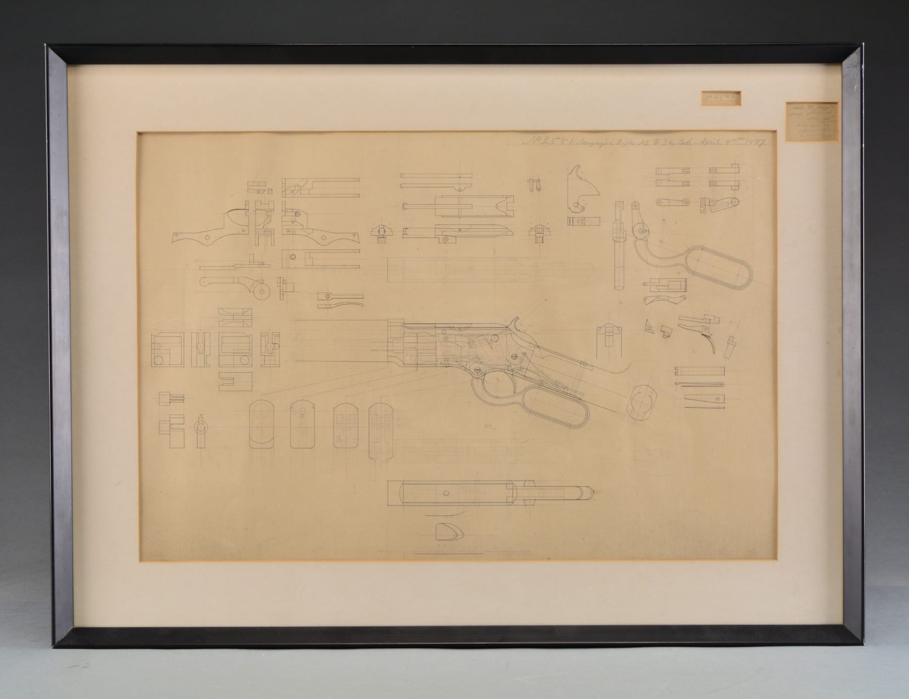 1873 .22 & .32 CAL. RIFLE MECHANISM. 31" x 23" Overall, drawing is dated April 4, 1889 & shows modifications to mechanism for smaller projectile ammunition. Highly detailed engineering drawings are rendered in pencil and black & red inks. For the Winchester .22 cal. collector who thought they had everything. CONDITION: very good overall, paper was not removed from frame but museum glass was used & details all discernable w/ light soiling. PROVENANCE: Ex Ray Bentley Collection; Vicente Sepulveda. (02-13626/JS). $1,000-1,500.