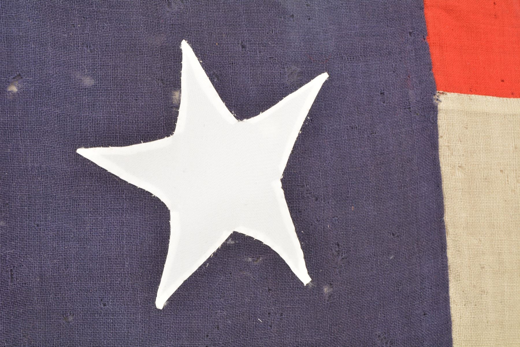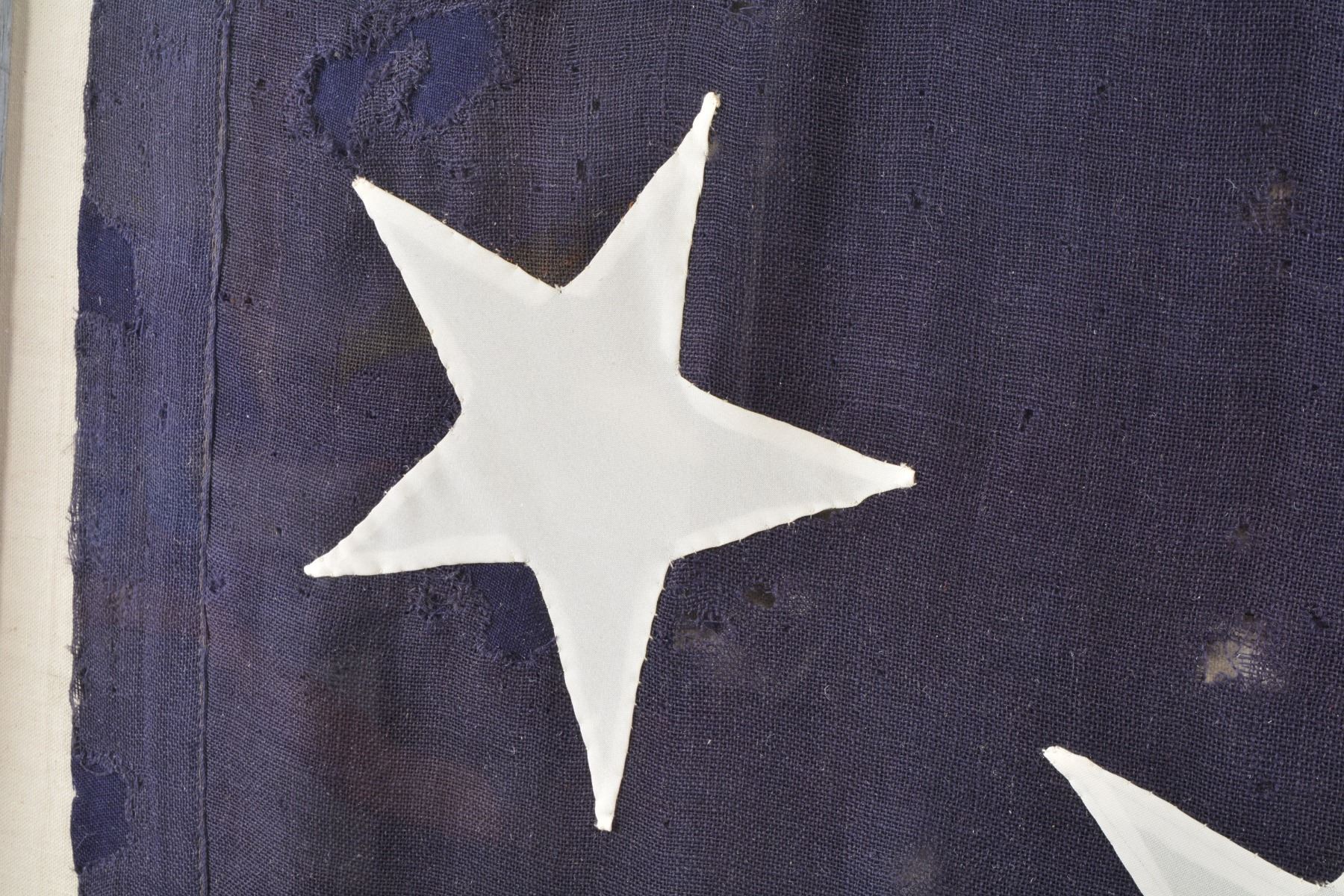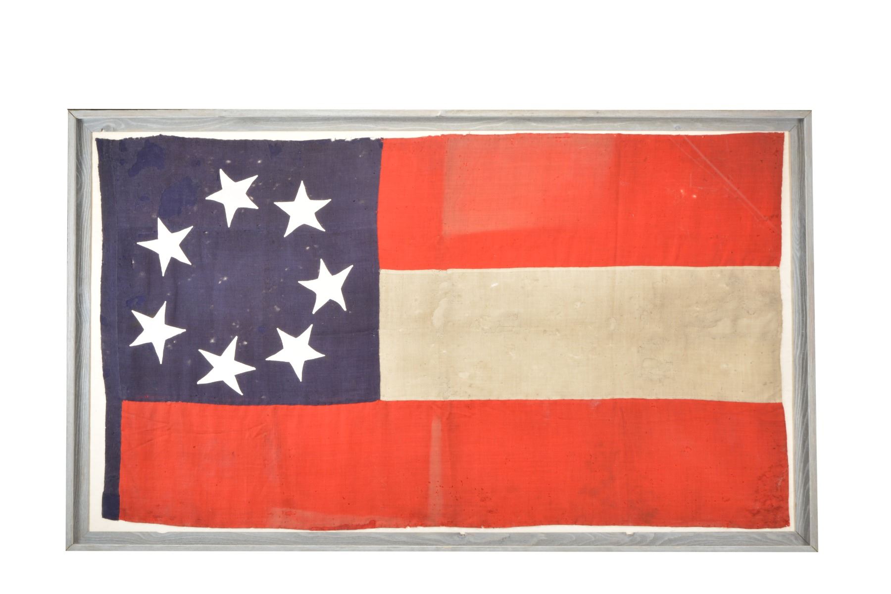 Typical early war "Stars & Bars" 1861. Measuring 69" long by 40" wide, two red bars & one white bar w/ blue canton & seven stars in circle in canton. Hoist consists of folded over blue bunting 1 3/4". Constructed of wool bunting, hand & machine stitched. Stitched to cotton backing & mounted in a gray wooden frame w/ plexiglass cover. Before his death, George Wray indicated that this flag had a Georgia provenance, perhaps carried to war in 1861 by a Georgia regiment. To date, after a thorough examination of his research files, no hard evidence of this association has been found. UNATTACHED ACCESSORIES: a copy of conservation report is included. CONDITION: flag has not been removed from its frame for thorough examination, but the following features are clearly evident. An approx. 16" by 10" rectangular section of the upper red bar shows considerable fading, along w/ 2 narrow strips on the lower red bar, an indication that the flag was folded & exposed to light in these areas. Creases from this folding are still evident. Flag is missing approximately 10–15% of its fabric, especially in the white bar. Missing sections have been replaced w/ appropriately colored backing cloth. All 7 stars are replaced w/ white silk fabric along w/ other conservation by Becky Sudsbury at the Museum of Early Southern Decorative Arts (“MESDA”) in Winston Salem, NC, 1983. PROVENANCE: Ex George Wray Collection; Atlanta History Center 2005. (02-12966/JS). $10,000-15,000.