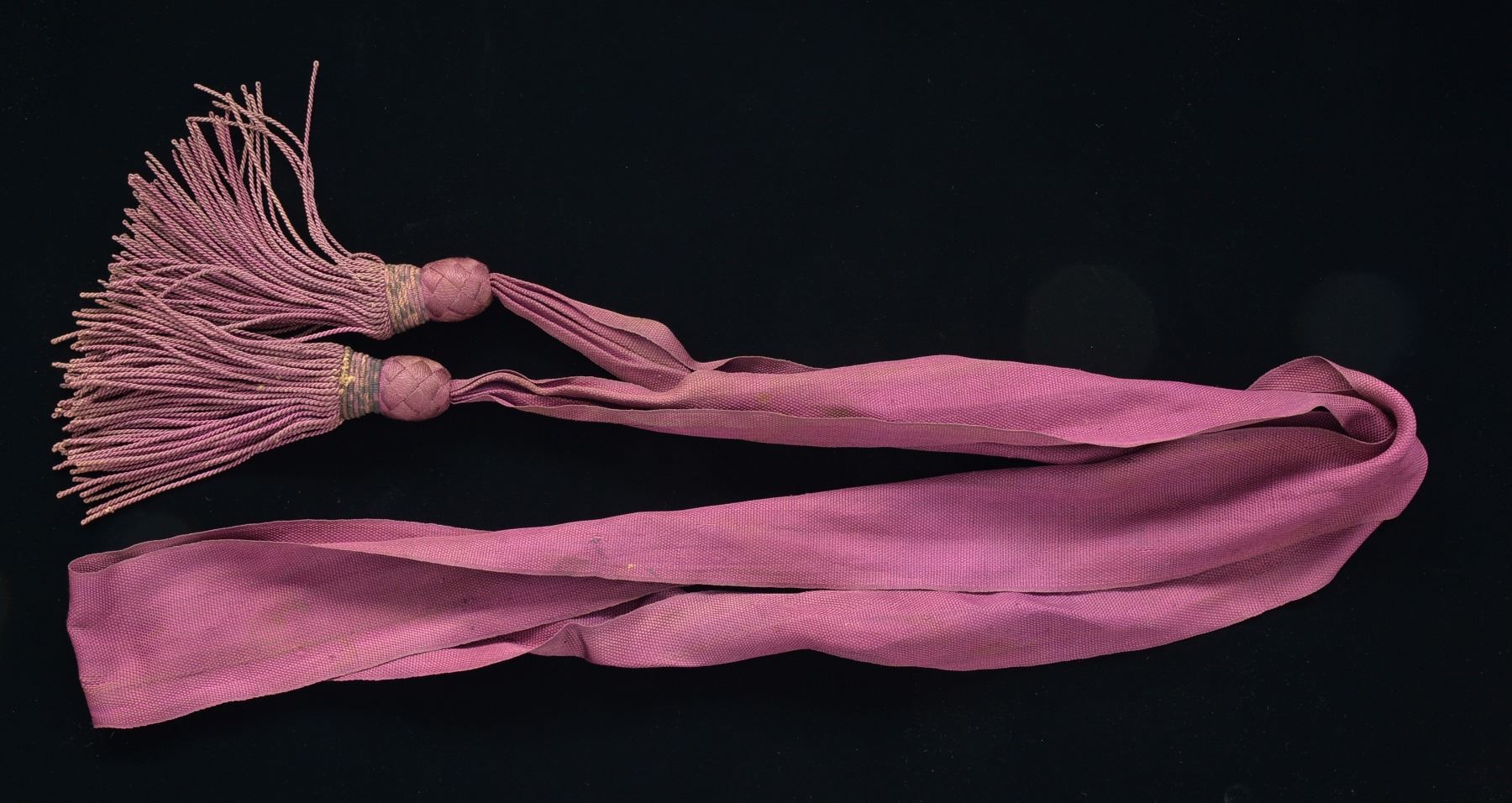 CAPTAIN CUTHBERT H. SLOCOMB OF THE WASHINGTON ARTILLERY. A fine crimson Confederate officer’s sash of silk or possibly cotton net fabric in a tabby weave. The sash was worn on the uniforms of Captain C.H. Slocomb serving with the Washington Artillery of New Orleans, Louisiana. The belt of the sash measures 3 1/4" wide and 94” long. At each end, is a ball and tassel measuring 7 5/8". The overall length of the entire sash is 109 1/4". The sash uses construction techniques indicative of Civil War period sashes. UNATTACHED ACCESSORIES: Les Jensen authentication letter. CONDITION: the sash remains exceptionally solid with light fading to the tassels and the tassel wraps. There are a few minor stains and pulls in the material that do not detract from the appearance of this fine historic sash. PROVENANCE: Abraham Lincoln Book Shop, Chicago, IL, to legendary collector George Markham in 1957 to the esteemed collection of Don and Judy Polifka in 1987. (02-13430/BF). $1,800-3,600.