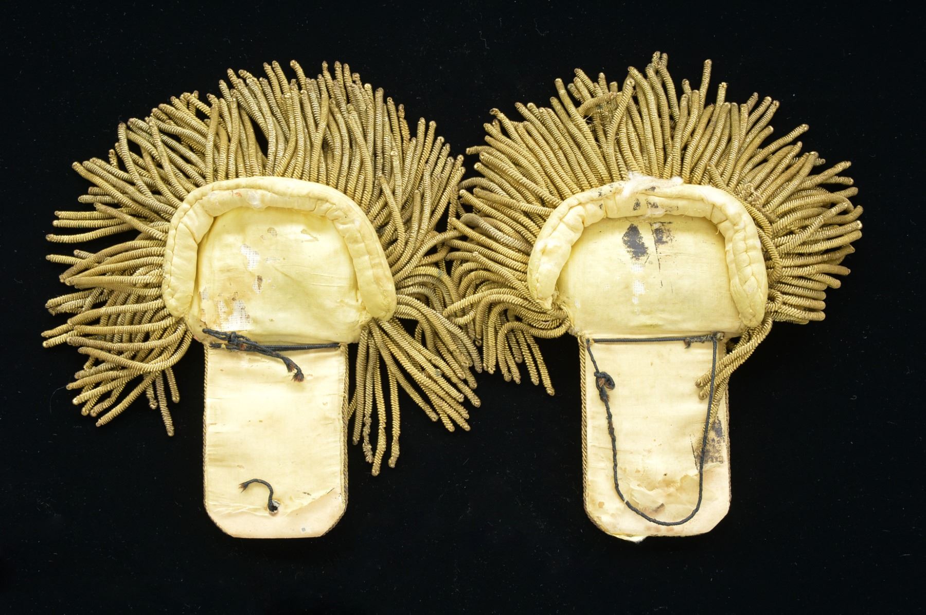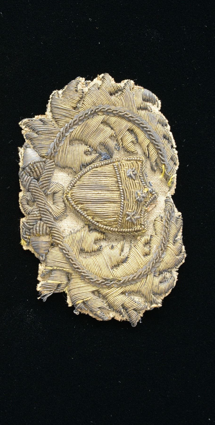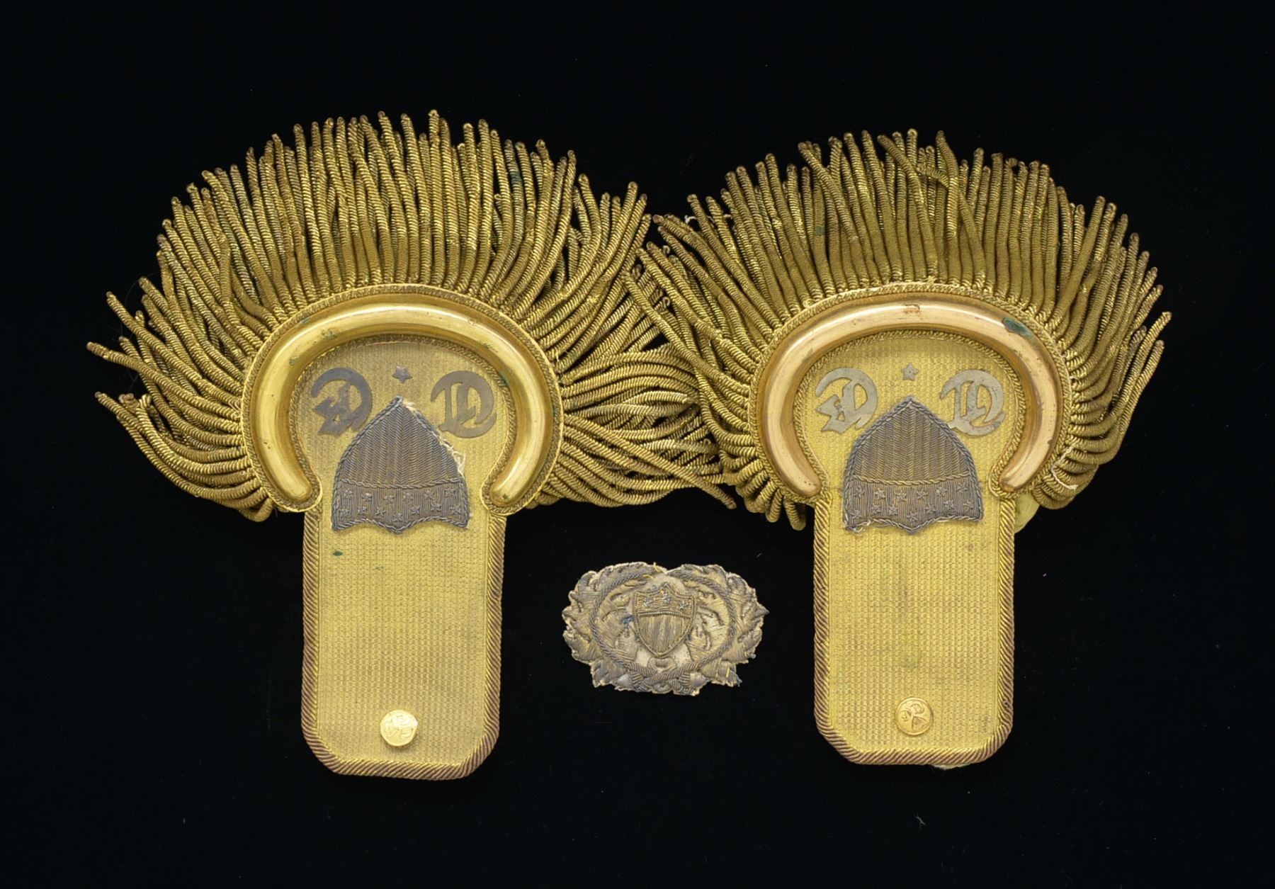 ENGINEER EPAULETS & HAT INSIGNIA. These were the epaulets Lieutenant M.L Smith wore in the Mexican War. They have 14mm topographical engineer buttons for attachment & gilted raised brass borders w/ gold braid edging. There is cut out silver letters in old English script "T" & "E" w/ a sm. silver star between. There is a metallic embroidered shield between the 2 letters measuring about 2" across. The embroidered hat insignia has same shield inside oak leaf & acorn wreath. CONDITION: good to very good overall. Minor reductions to one of the embroidered shields. Yellow silk backing & pillows have about 10% reductions & one pillow is loose. Insignia is very good & solid w/ minor reductions as seen in photos. PROVENANCE STATEMENT: Direct Family Descent. (02-13233/JS). 4,000-6,000.