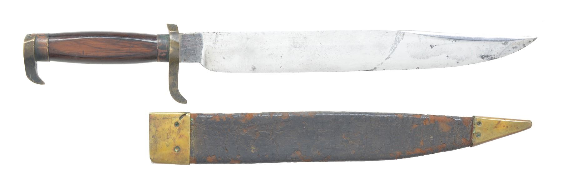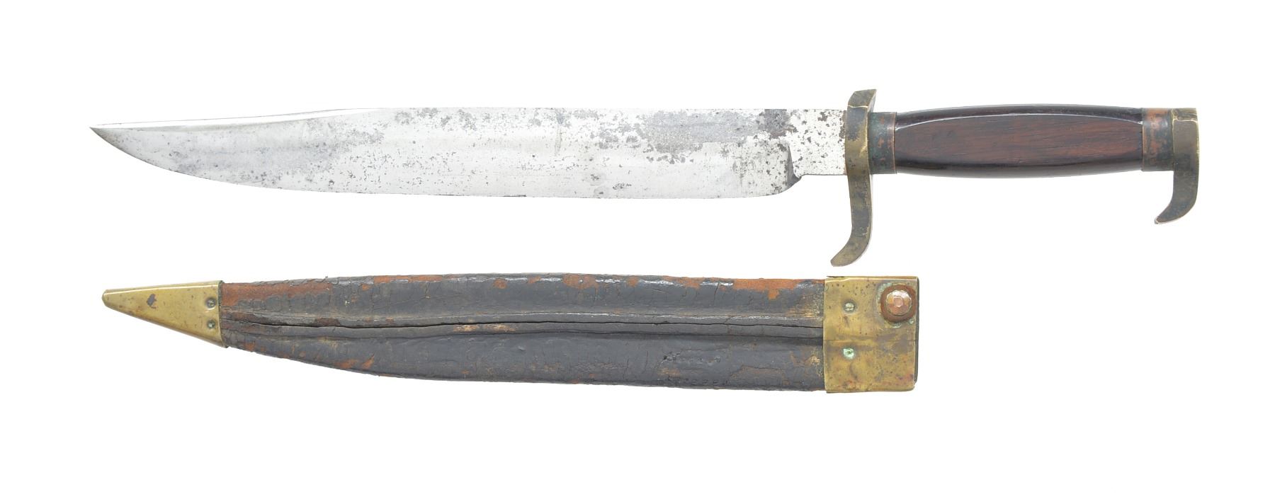 COOK & BROTHER OF NEW ORLEANS. This is a very fine example of a classic Confederate bowie originally made w/ 2 unfinished brass muzzle rings that have been removed. Well finished rosewood grip, 11 3/4" clip point blade & original brass mounted sheath. Norm Flayderman in his monumental text "The Bowie Knife" "the only mention of the term "Bowie-Bayonet" in literature leading up to the Civil War is made by U.S. admiral John Dahlgren who coined the term for his knife used on a navy rifle". His lesser known brother Confederate General Charles Dahlgren notes in early war telegrams that he wishes "Bowie knives put on guns, Cook in New Orleans can do it" & in a second telegram a few days later he wishes the bowie knives not get put on guns. This explains the reason for such variation in the "muzzle rings" or lack of muzzle rings plus filed muzzle rings. Rosewood is never seen on Confederate weapons w/ the exception of this genre of bowie. New Orleans is well known however for the use of rosewood, antebellum bowies & surgical tools. The use of "punch marks" & pins to secure scabbard mts. is also seen on marked Cook cutlass scabbards. It would be difficult to find a better complete example of this Confederate bowie retaining much of its original polish & luster. CONDITION: very good to fine overall; blade has light areas of sharpening retaining original finishing marks, luster w/ scattered staining & pitting, rosewood grip retains much of its original varnish, sheath is sound & solid w/ stitching loose, scuffing & craquelure. Sheath is shrunk & there is about a 1/2” gap between guard & throat, throat has cracking & sm. reductions, missing belt loop. Brass grip mts. have dirty chocolate/olive patina, sheath mts. have medium to dark mustard patina. (02-13618/JS). $3,000-4,000.