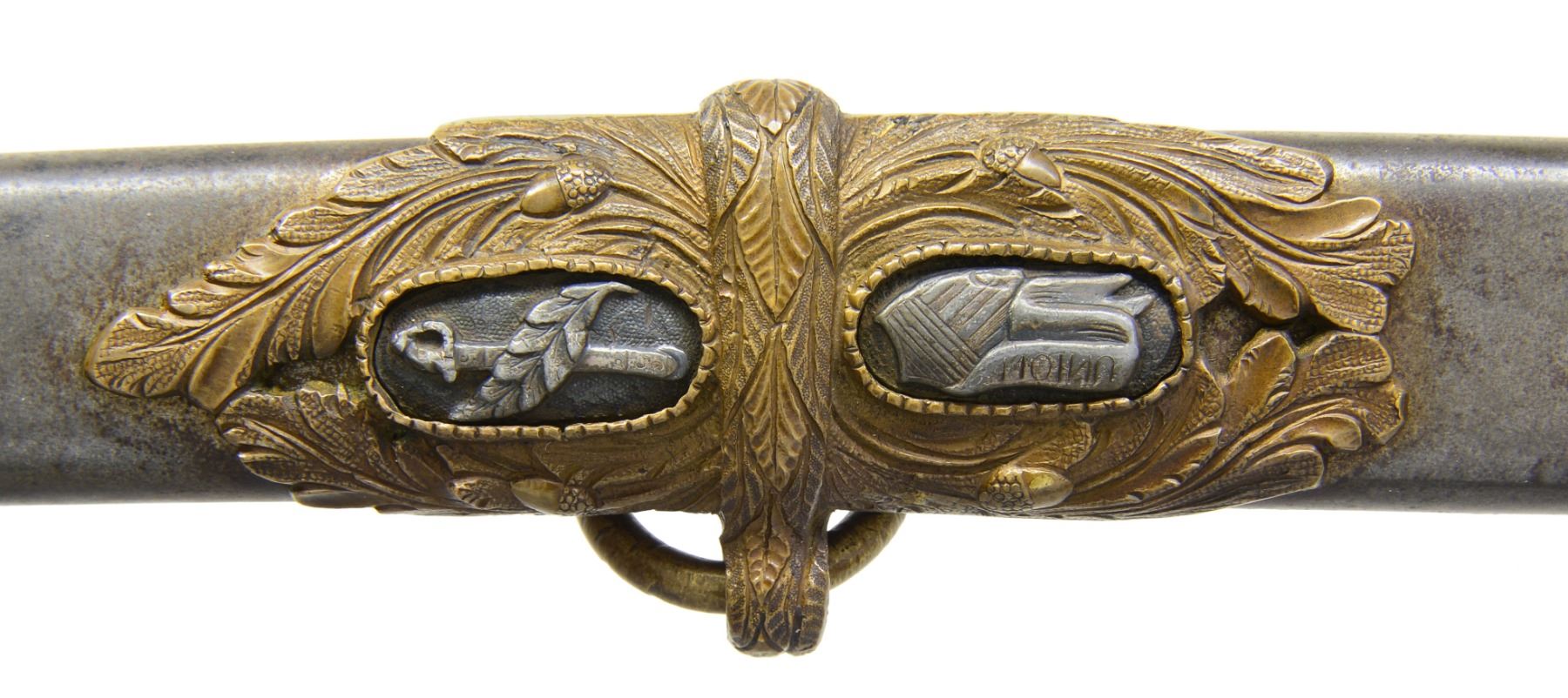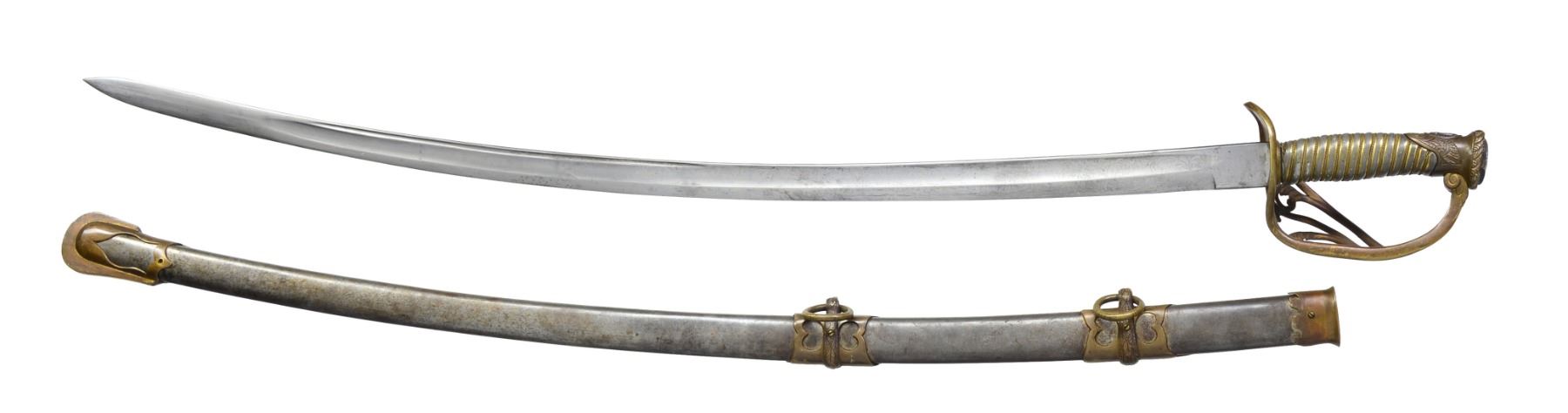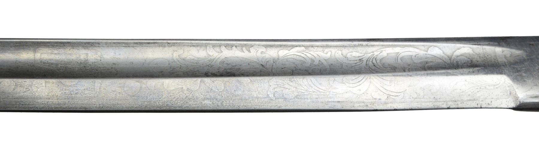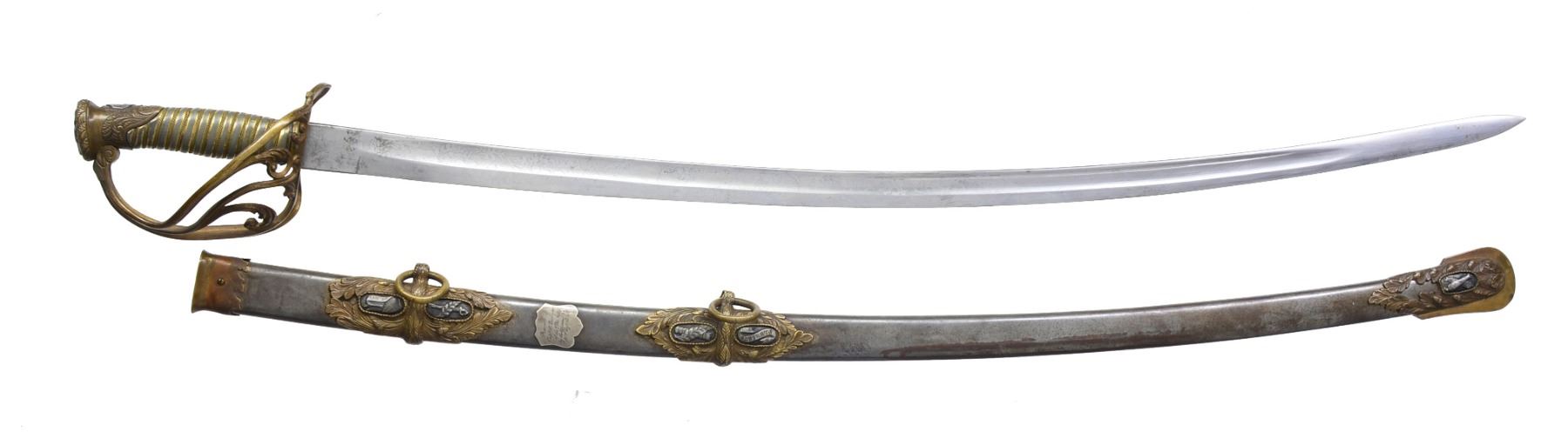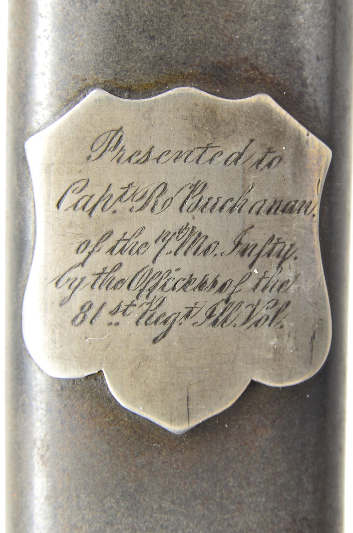 OFFICERS SABER BY SAUERBIER PRESENTED TO CAPTAIN ROBERT BUCHANAN. Overall length: 40 1/8". Blade length: 33". A rare Type 3 cavalry officers saber by Sauerbier from one of the most hard fought units of the Civil War. Captain Robert Buchanan led Company K of the 7th Missouri Infantry, also known as the "Irish 7th". Late in 1864, the 7th was combined w/ the 30th Missouri Infantry & became known as the Missouri Irish Brigade. The Irish Brigade was led by then Lt. Col. Robert Buchanan until his capture by Gen. Lyons, CSA at Nashville. Col. Buchanan was paroled & sent to Ft. Donelson. In late December of 1864, he reported to Benton Barracks, Missouri & commanded paroled soldiers there until the end of the war. The 7th was involved in many notable campaigns throughout the Western theater. Most noteworthy was the assault on Vicksburg in May of 1863. On May 22, 1863 the 7th Missouri & the 81st Illinois participated in the grand assault on Vicksburg w/ both regiments suffering very heavy losses. The 81st Illinois lost its Colonel & Major in the assault & Captain Buchanan took command of both regiments. The 81st Illinois presented this sword to Captain Buchanan for his "brave & gallant" leadership on the battle field that day. Captain Robert Buchanan & the 7th Missouri were immortalized w/ the dedication of a monument honoring their bravery on the Vicksburg battlefield. The monument reads, "US / CAPT ROBERT BUCHANAN / 7TH MISSOURI INFANTRY / COMMANDING REGIMENT / MAY 16 - JUNE 13, 1863 / MARKS ITS FARTHEST ADVANCE MAY 22 / KILLED 9, WOUNDED 93, TOTAL 102". Blade is etched over 2/3 of its length w/ various military, equine & foliate motifs. Engraving includes a horse's head w/ martingale below & 2 pistols, a sword & flags above. Blade is further engraved at the ricasso "H. Sauerbier. Newark, N.J.". Gilded brass hilt w/ highly decorated guard. Pommel has an inset oval bust in silver. Just below the pommel is a silver shield w/ "UNION" in a ribbon crossing the shield. Gilded brass grip w/ gilded brass wire wrap. The iron bodied scabbard has gilded brass mounts. Scabbard throat is engraved & stylized. Top & middle mounts are highly stylized acanthus leaves. Top mount has 2 inset silver lozenges; 1 depicting a crossed sword & leaf, the other features a shield flanked by a ribbon bearing the word "UNION". The middle mount also has 2 inset lozenges; 1 bearing a crossed leaf & Roman axe, the other features a ribbon inscribed "E PLURIBUS UNUM". The drag also has an acanthus leaf motif w/ a single inset silver lozenge featuring crossed cannons. An attached solid silver shield between the mounts reads "Presented to Capt. R Buchanan. of the 7th Mo. Infty. by the Officers of the 81st Regt. Ill. Vol.". UNATTACHED ACCESSORIES: included w/ the sword are hundreds of pages of documentation & material related to the sword including several photographs of sword details. There is a plethora of information on Lieutenant Colonel Buchanan's service, photos of him later in life & a framed chronology of his service. Also included are photographs from the Vicksburg National Military Park showing the unit's position & most notable, the monument dedicated to Captain Buchanan & the 7th Missouri attesting to their furthest advance on May 22, 1863. CONDITION: blade has a pleasing cleaned light gray finish. Etching remains quite sharp & maker's mark is easily legible. Hilt is slightly misshaped due to years of hard fought service. Traces of the original gilded finish remain. Grip shows substantial gilded finish in the recessed grooves. Wire is complete. Scabbard body is free from dents. The mounts show some wear but details remain quite crisp w/ traces of original gilding remaining. The iron body has a medium gray slightly mottled patina w/ minor areas of slight discoloration. Drag screw is missing. Presentation shield is extremely legible & has a mellow patina. (02-12984/BF). $6,000-9,000.