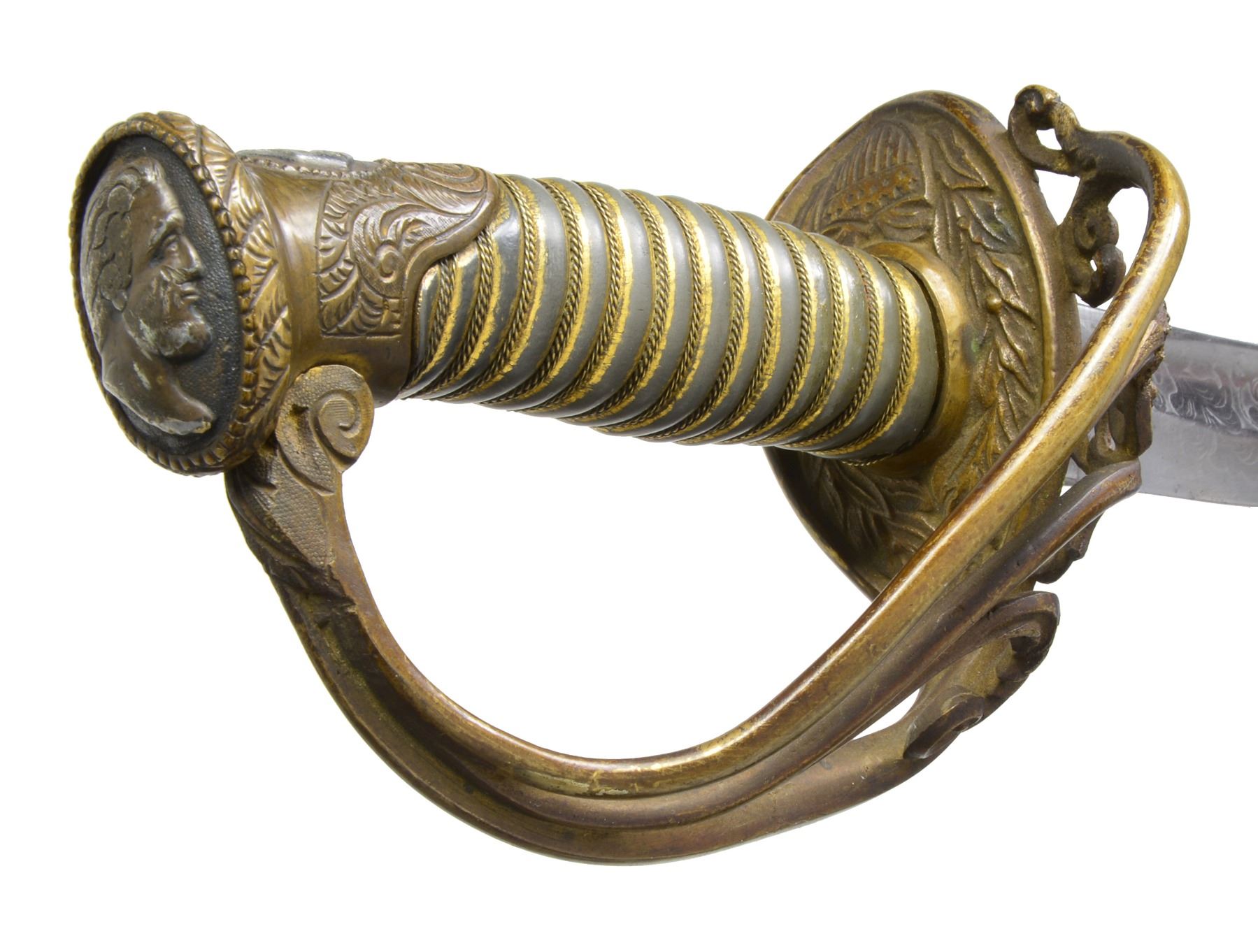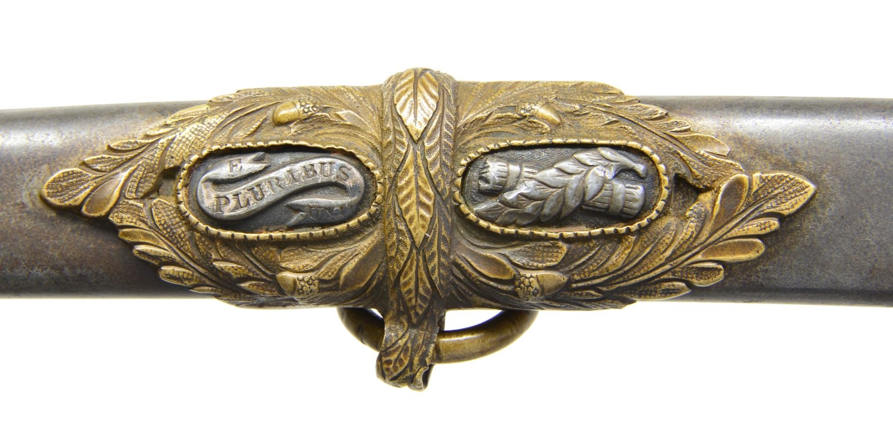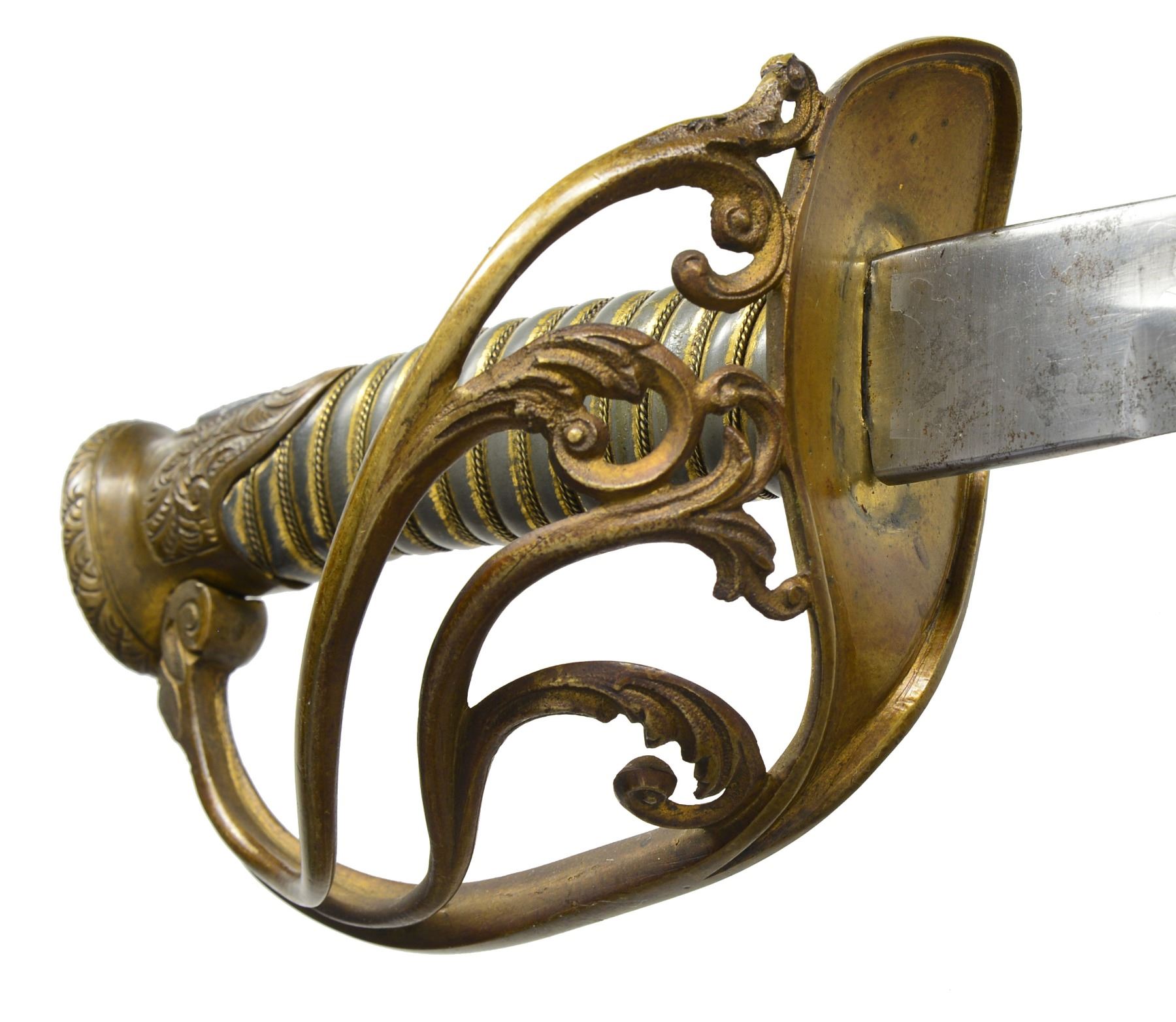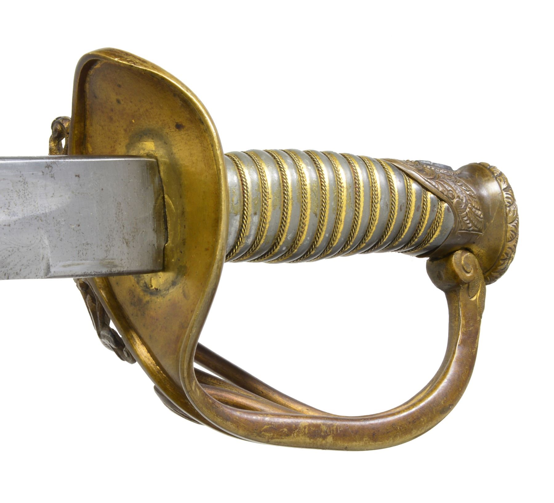 OFFICERS SABER BY SAUERBIER PRESENTED TO CAPTAIN ROBERT BUCHANAN. Overall length: 40 1/8". Blade length: 33". A rare Type 3 cavalry officers saber by Sauerbier from one of the most hard fought units of the Civil War. Captain Robert Buchanan led Company K of the 7th Missouri Infantry, also known as the "Irish 7th". Late in 1864, the 7th was combined w/ the 30th Missouri Infantry & became known as the Missouri Irish Brigade. The Irish Brigade was led by then Lt. Col. Robert Buchanan until his capture by Gen. Lyons, CSA at Nashville. Col. Buchanan was paroled & sent to Ft. Donelson. In late December of 1864, he reported to Benton Barracks, Missouri & commanded paroled soldiers there until the end of the war. The 7th was involved in many notable campaigns throughout the Western theater. Most noteworthy was the assault on Vicksburg in May of 1863. On May 22, 1863 the 7th Missouri & the 81st Illinois participated in the grand assault on Vicksburg w/ both regiments suffering very heavy losses. The 81st Illinois lost its Colonel & Major in the assault & Captain Buchanan took command of both regiments. The 81st Illinois presented this sword to Captain Buchanan for his "brave & gallant" leadership on the battle field that day. Captain Robert Buchanan & the 7th Missouri were immortalized w/ the dedication of a monument honoring their bravery on the Vicksburg battlefield. The monument reads, "US / CAPT ROBERT BUCHANAN / 7TH MISSOURI INFANTRY / COMMANDING REGIMENT / MAY 16 - JUNE 13, 1863 / MARKS ITS FARTHEST ADVANCE MAY 22 / KILLED 9, WOUNDED 93, TOTAL 102". Blade is etched over 2/3 of its length w/ various military, equine & foliate motifs. Engraving includes a horse's head w/ martingale below & 2 pistols, a sword & flags above. Blade is further engraved at the ricasso "H. Sauerbier. Newark, N.J.". Gilded brass hilt w/ highly decorated guard. Pommel has an inset oval bust in silver. Just below the pommel is a silver shield w/ "UNION" in a ribbon crossing the shield. Gilded brass grip w/ gilded brass wire wrap. The iron bodied scabbard has gilded brass mounts. Scabbard throat is engraved & stylized. Top & middle mounts are highly stylized acanthus leaves. Top mount has 2 inset silver lozenges; 1 depicting a crossed sword & leaf, the other features a shield flanked by a ribbon bearing the word "UNION". The middle mount also has 2 inset lozenges; 1 bearing a crossed leaf & Roman axe, the other features a ribbon inscribed "E PLURIBUS UNUM". The drag also has an acanthus leaf motif w/ a single inset silver lozenge featuring crossed cannons. An attached solid silver shield between the mounts reads "Presented to Capt. R Buchanan. of the 7th Mo. Infty. by the Officers of the 81st Regt. Ill. Vol.". UNATTACHED ACCESSORIES: included w/ the sword are hundreds of pages of documentation & material related to the sword including several photographs of sword details. There is a plethora of information on Lieutenant Colonel Buchanan's service, photos of him later in life & a framed chronology of his service. Also included are photographs from the Vicksburg National Military Park showing the unit's position & most notable, the monument dedicated to Captain Buchanan & the 7th Missouri attesting to their furthest advance on May 22, 1863. CONDITION: blade has a pleasing cleaned light gray finish. Etching remains quite sharp & maker's mark is easily legible. Hilt is slightly misshaped due to years of hard fought service. Traces of the original gilded finish remain. Grip shows substantial gilded finish in the recessed grooves. Wire is complete. Scabbard body is free from dents. The mounts show some wear but details remain quite crisp w/ traces of original gilding remaining. The iron body has a medium gray slightly mottled patina w/ minor areas of slight discoloration. Drag screw is missing. Presentation shield is extremely legible & has a mellow patina. (02-12984/BF). $6,000-9,000.