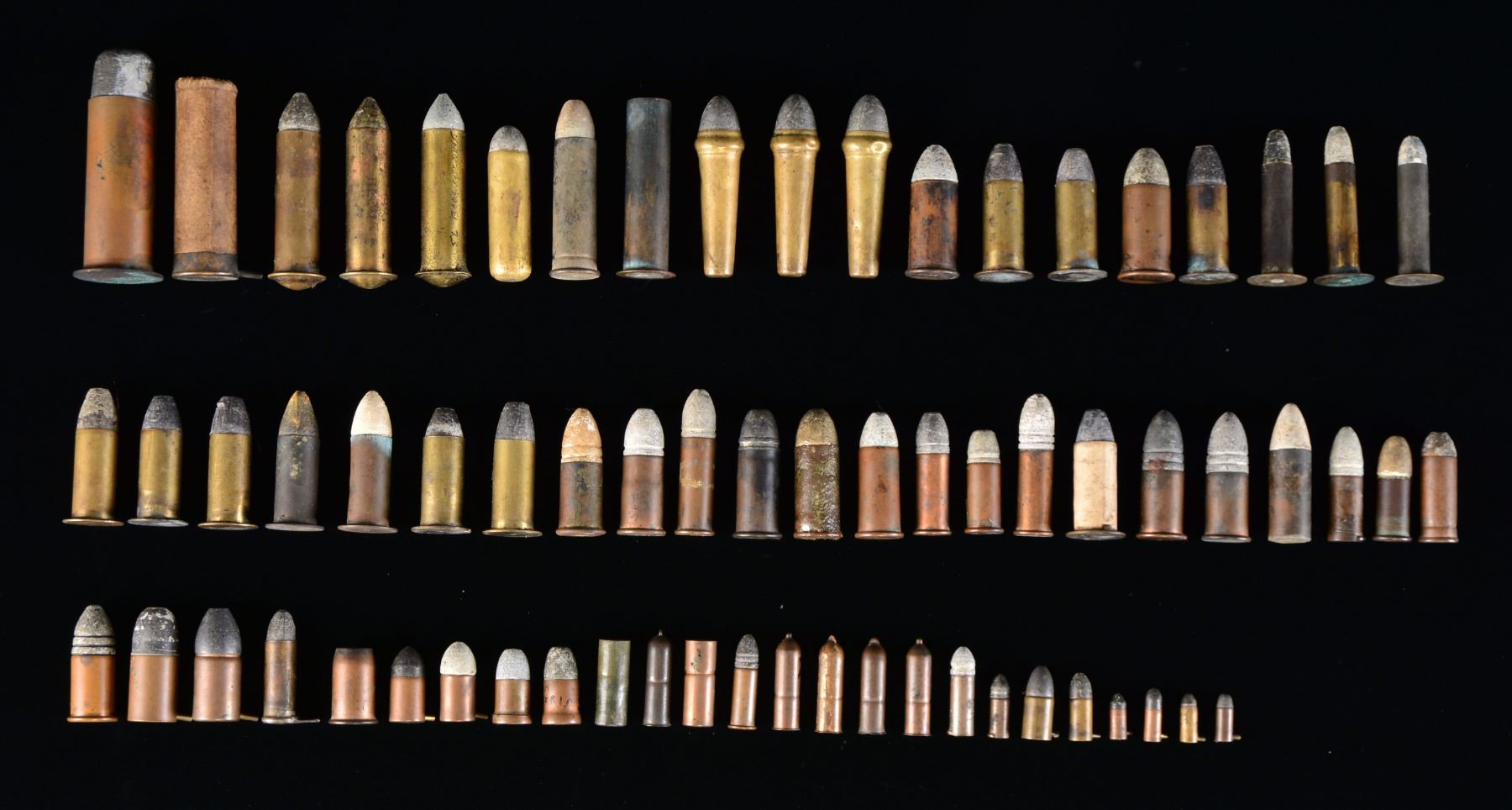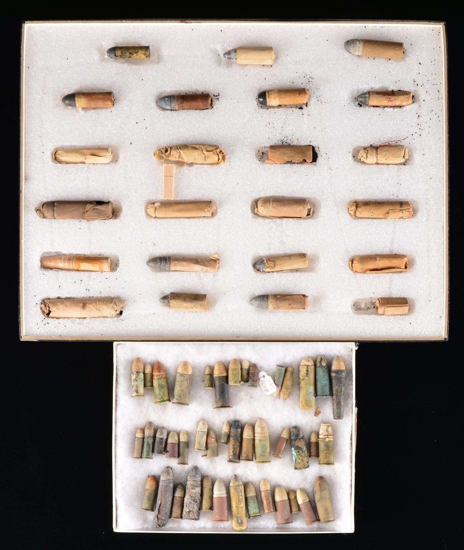 CARTRIDGES. There are 131 cartridges in this lot. Approx. 45 are excavated. Many of these excavated cartridges are very rare, in good condition as the corrosive powder in the ground ruins so many. Most excavated cartridges here appear solid, though some examples excavated brass & lead bullet "married together". Bullets range from the smallest 5mm pinfires to 10 Ga. RF shotgun slug. In between there are many rarities including rimfire 58 cal., numerous variations of most every teat-fire, Maynards, including rare Confederate mfg. 35 cal. Maynard variants & many more. Prospective bidders should inspect this lot as there are many rare variants & only one of these cartridges has identifying tag which states 46 cal. RF for Remington split breech carbine. There are 23 paper/organic wrapped balls which all appear different. We can identify several varieties of U.S. carbine bullets including 64 cal. Hall. There are several 58 & 69 cal. which are not known as Mr. Poppen had no notes on these. The only way to tell is x-ray in some cases, regardless, they are all different w/ most in nice condition. CONDITION: most of the paper cartridges are good to very good overall, though fragile as most survivors are. There are a 2 cartridges that are powder w/ no balls & another is a paper wrapped pack of caps that would accompany a paper wrapped pack of 10 cartridges. Brass cartridges of non excavated variety are very good to fine. Excavated cartridges are good to very good overall & as noted need to be viewed by prospective bidders as there are very scarce variants not described. PROVENANCE: Estate Collection of Dan Poppen. (02-13449-2/JS). $3,000-5,000.