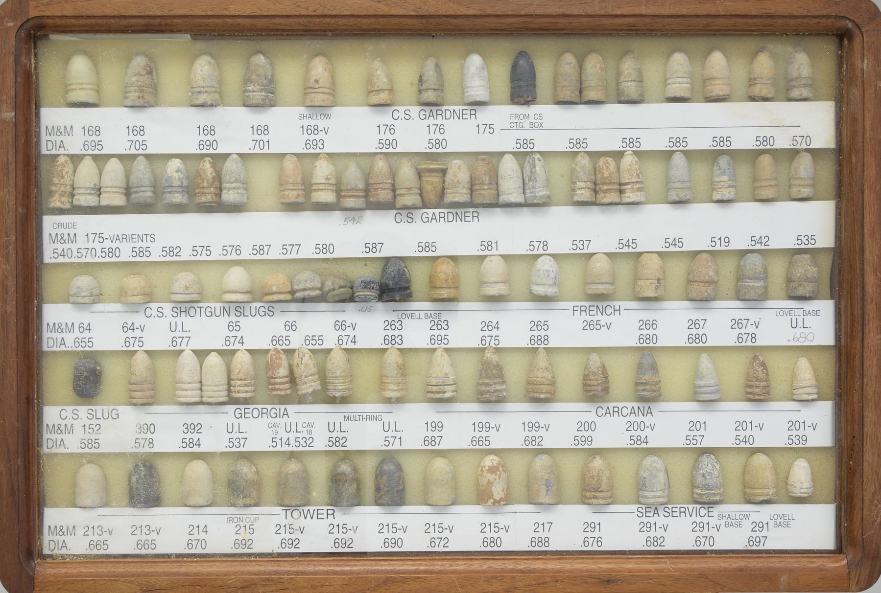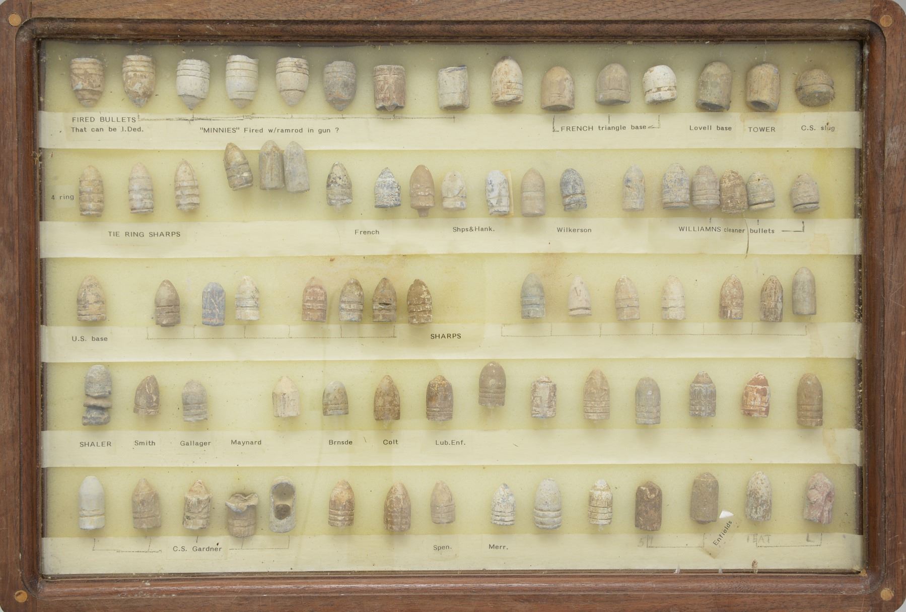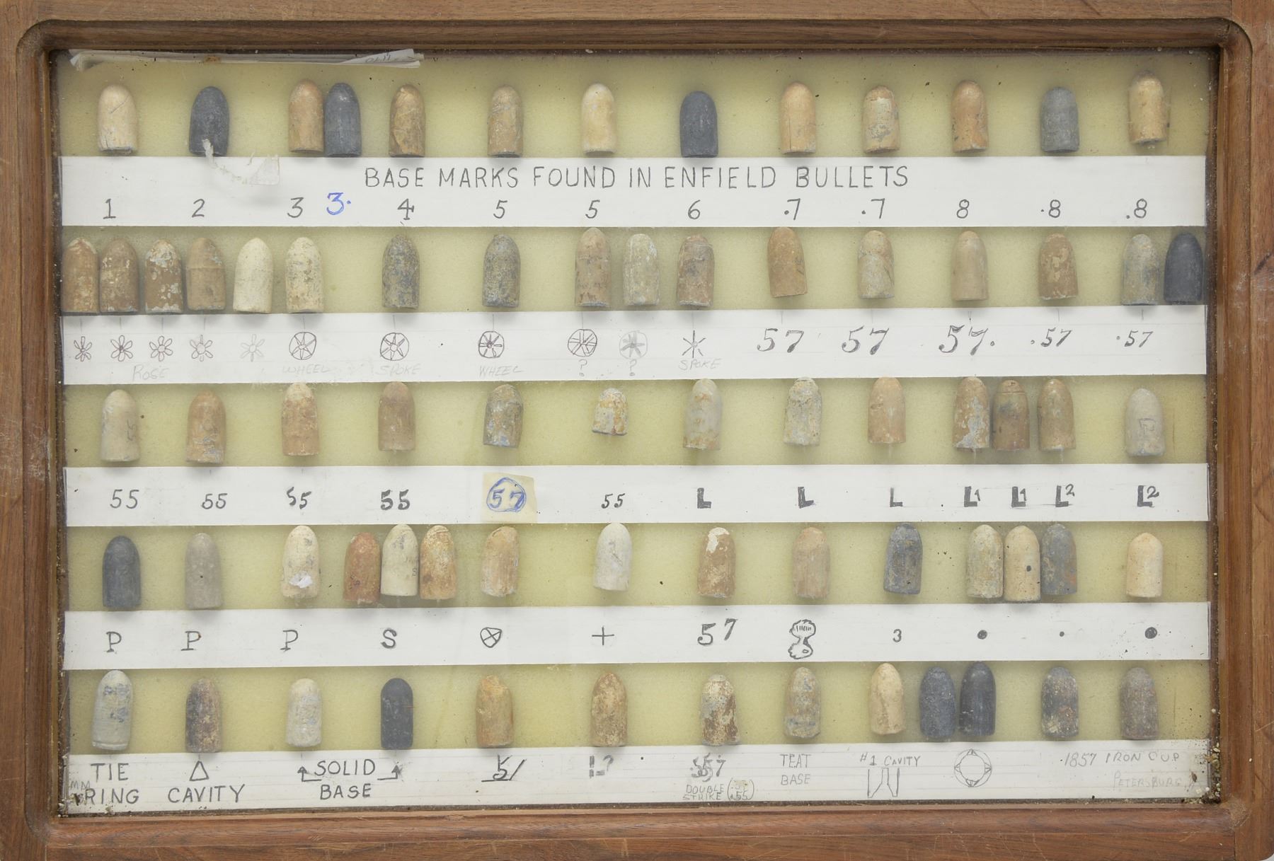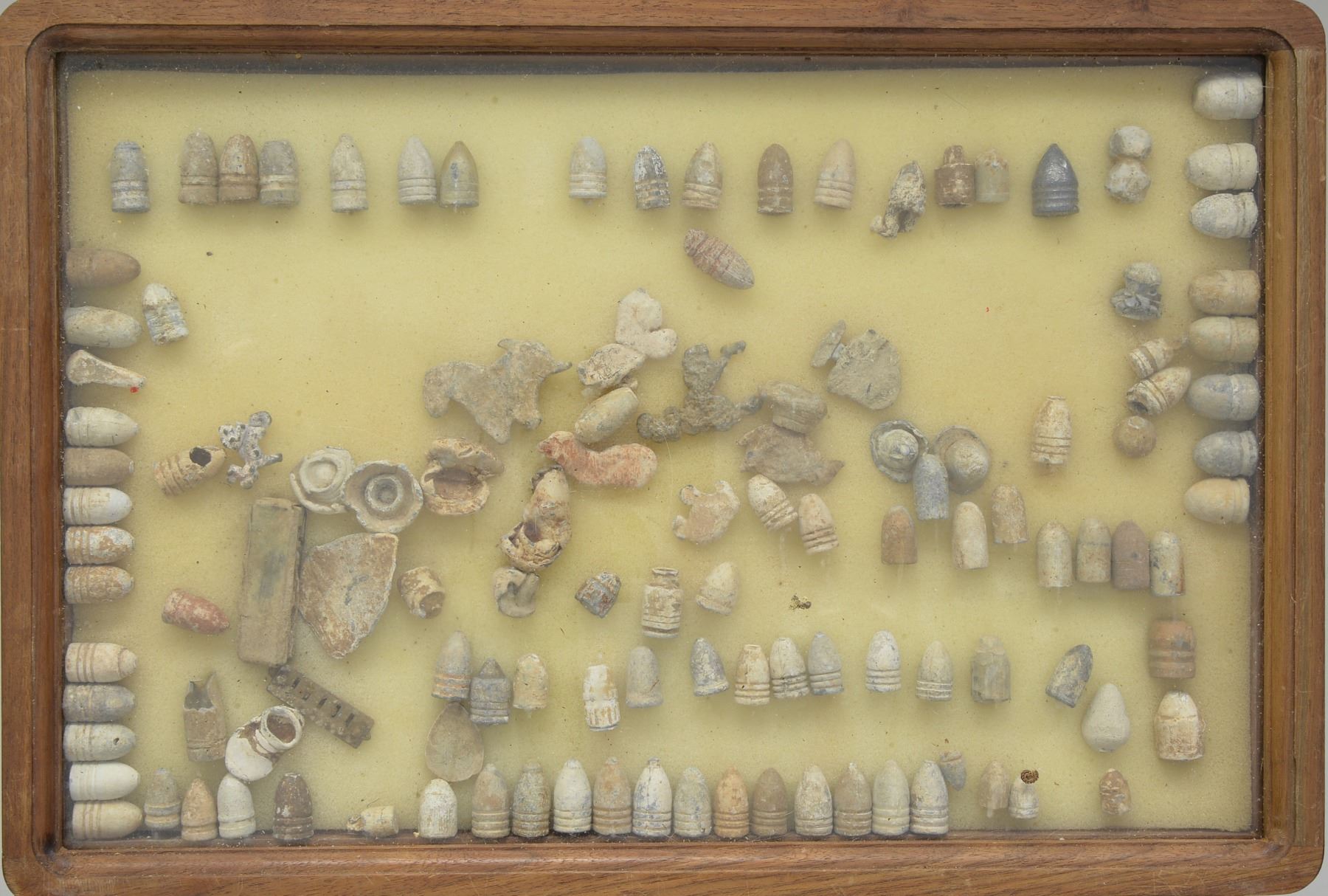ARMS PROJECTILES EVER ASSEMBLED. Dan Poppen compiled the single finest collection of Civil War excavated bullets from camps & battlefields for over 50 years, constantly upgrading. His displays have won numerous awards over the years. This collection is housed in eighteen 12" x 16" wooden cases w/ each projectile named with its caliber & characteristics. There are many unique variants. There are some extra-ordinary rarities, which very few are known and this collection has the finest condition. Among the distinctive rarities is the Confederate 69 cal. explosive, hexagonal & double end Whitworths, 4 piece Shaler, all 3 variations of the "Arkansas Hog" 69 cal. projectile. There are 9 variant Whitworths, 8 variant Shalers. There is every known base marking for Enfield projectiles. There is every known marking variety for various US arsenal minies. There are numerous varieties of Sharps, Dimmicks (Swiss Chasseur). There are numerous varieties of Gardner projectiles, CS shotgun slugs, French imported & Confederate copies. There is every variation of Confederate armory projectiles, Carcanos, both imported & Confederate copies, excavated 1" gatling gun projectile. The list goes on and on. In Mason & Mckee's last edition of their projectile book (1980) they list a total of 658 projectiles, this collection has over 1,300 projectiles of which 908 are distinct varieties. The other approximate 400 display projectiles are 2 displays containing 166 fired projectiles showing the numerous calibers & rifling different weapons had. Fired bullets are the most common relic from battlefields but you have to dig hundreds of bullets to find perfect projectiles that did not get badly distorted still showing fine rifling of different weapons. There are 2 flats containing over 200 projectiles showing oddities from the battlefield and camps such as bullets carved or whittled by soldiers, bullets still attached to worms or cleaning jags, a bullet fired w/ the ramrod still in the gun, a fired bullet w/ portion of ramrod still attached (in the heat of battle there are many accounts of soldiers firing their guns with the ramrods still in the muzzles), bullets chewed by humans, bullets chewed by animals, "blow throughs", casting flaws, melted in the field. There are 2 sets of fused bullets, bullets that hit each other & fused as 1. There is a most interesting display of an exploded Confederate Boreman 12 lb. cannon ball with its fragments, fuse & 42 bullets that were contained and used as case shot. Of these 42 bullets are several variations including 69 cal. Tower, 69 cal. 3 ring, Carcano, Sugarloaf, Gardners .54 cal. & 58 cal., Confederate 3 ringers. As noted in the biography in the front of this catalog, Dan Poppen loved Civil War small arms projectiles which he first started collecting in the 1950s. Dan was an early friend of Mac Mason & encouraged his interest in Civil War bullets & helped him with his book, of which many of these projectiles are photographed & pictured in the classic Mason & McKee "Civil War Projectiles" from 1966 & the last 1980 edition with addendum. CONDITION: projectiles are very good to fine overall. Excavated lead patina. PROVENANCE: Estate Collection of Dan Poppen. (02-13448/JS). $40,000-60,000.