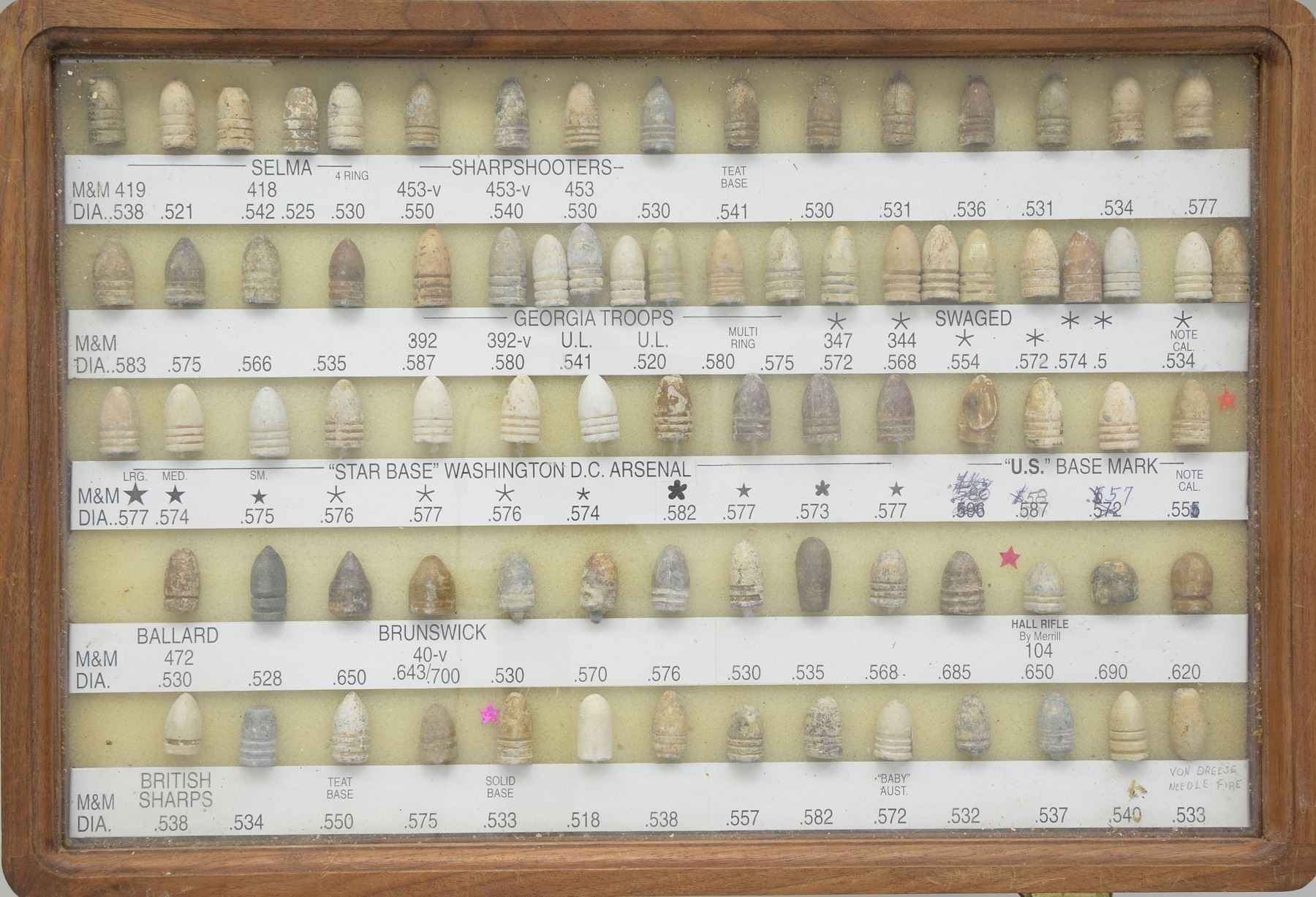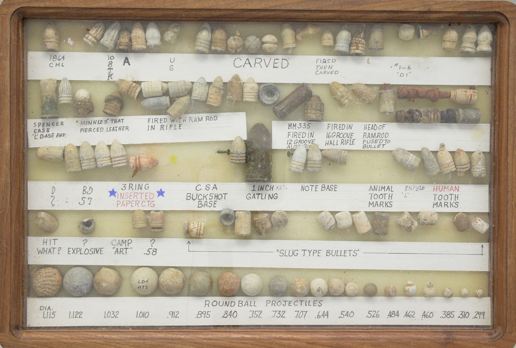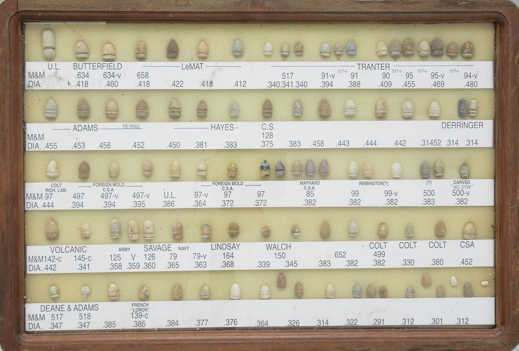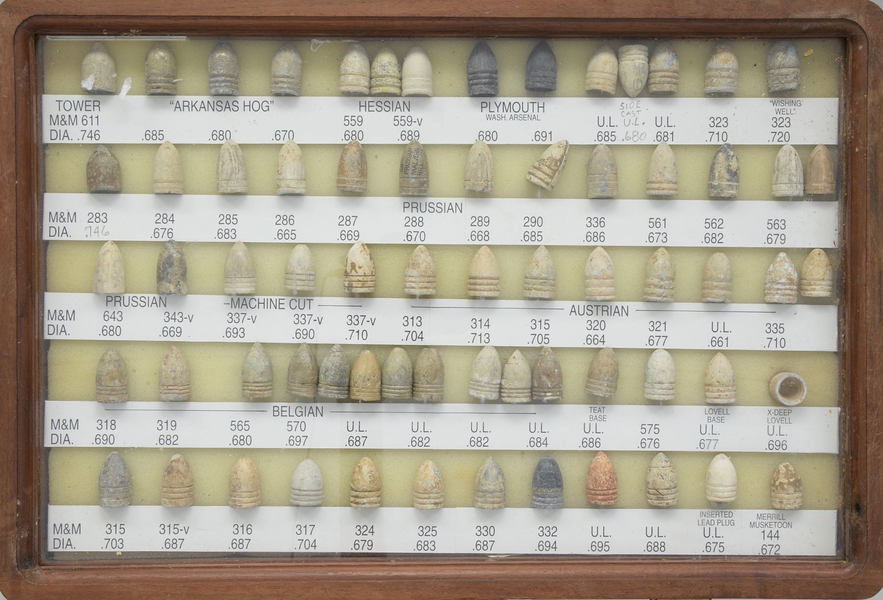 ARMS PROJECTILES EVER ASSEMBLED. Dan Poppen compiled the single finest collection of Civil War excavated bullets from camps & battlefields for over 50 years, constantly upgrading. His displays have won numerous awards over the years. This collection is housed in eighteen 12" x 16" wooden cases w/ each projectile named with its caliber & characteristics. There are many unique variants. There are some extra-ordinary rarities, which very few are known and this collection has the finest condition. Among the distinctive rarities is the Confederate 69 cal. explosive, hexagonal & double end Whitworths, 4 piece Shaler, all 3 variations of the "Arkansas Hog" 69 cal. projectile. There are 9 variant Whitworths, 8 variant Shalers. There is every known base marking for Enfield projectiles. There is every known marking variety for various US arsenal minies. There are numerous varieties of Sharps, Dimmicks (Swiss Chasseur). There are numerous varieties of Gardner projectiles, CS shotgun slugs, French imported & Confederate copies. There is every variation of Confederate armory projectiles, Carcanos, both imported & Confederate copies, excavated 1" gatling gun projectile. The list goes on and on. In Mason & Mckee's last edition of their projectile book (1980) they list a total of 658 projectiles, this collection has over 1,300 projectiles of which 908 are distinct varieties. The other approximate 400 display projectiles are 2 displays containing 166 fired projectiles showing the numerous calibers & rifling different weapons had. Fired bullets are the most common relic from battlefields but you have to dig hundreds of bullets to find perfect projectiles that did not get badly distorted still showing fine rifling of different weapons. There are 2 flats containing over 200 projectiles showing oddities from the battlefield and camps such as bullets carved or whittled by soldiers, bullets still attached to worms or cleaning jags, a bullet fired w/ the ramrod still in the gun, a fired bullet w/ portion of ramrod still attached (in the heat of battle there are many accounts of soldiers firing their guns with the ramrods still in the muzzles), bullets chewed by humans, bullets chewed by animals, "blow throughs", casting flaws, melted in the field. There are 2 sets of fused bullets, bullets that hit each other & fused as 1. There is a most interesting display of an exploded Confederate Boreman 12 lb. cannon ball with its fragments, fuse & 42 bullets that were contained and used as case shot. Of these 42 bullets are several variations including 69 cal. Tower, 69 cal. 3 ring, Carcano, Sugarloaf, Gardners .54 cal. & 58 cal., Confederate 3 ringers. As noted in the biography in the front of this catalog, Dan Poppen loved Civil War small arms projectiles which he first started collecting in the 1950s. Dan was an early friend of Mac Mason & encouraged his interest in Civil War bullets & helped him with his book, of which many of these projectiles are photographed & pictured in the classic Mason & McKee "Civil War Projectiles" from 1966 & the last 1980 edition with addendum. CONDITION: projectiles are very good to fine overall. Excavated lead patina. PROVENANCE: Estate Collection of Dan Poppen. (02-13448/JS). $40,000-60,000.