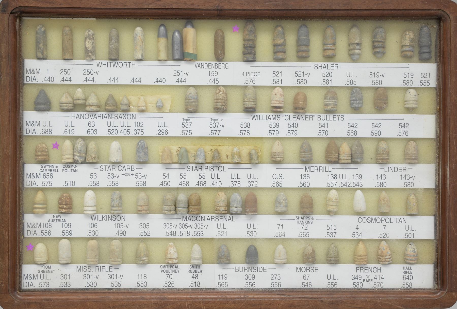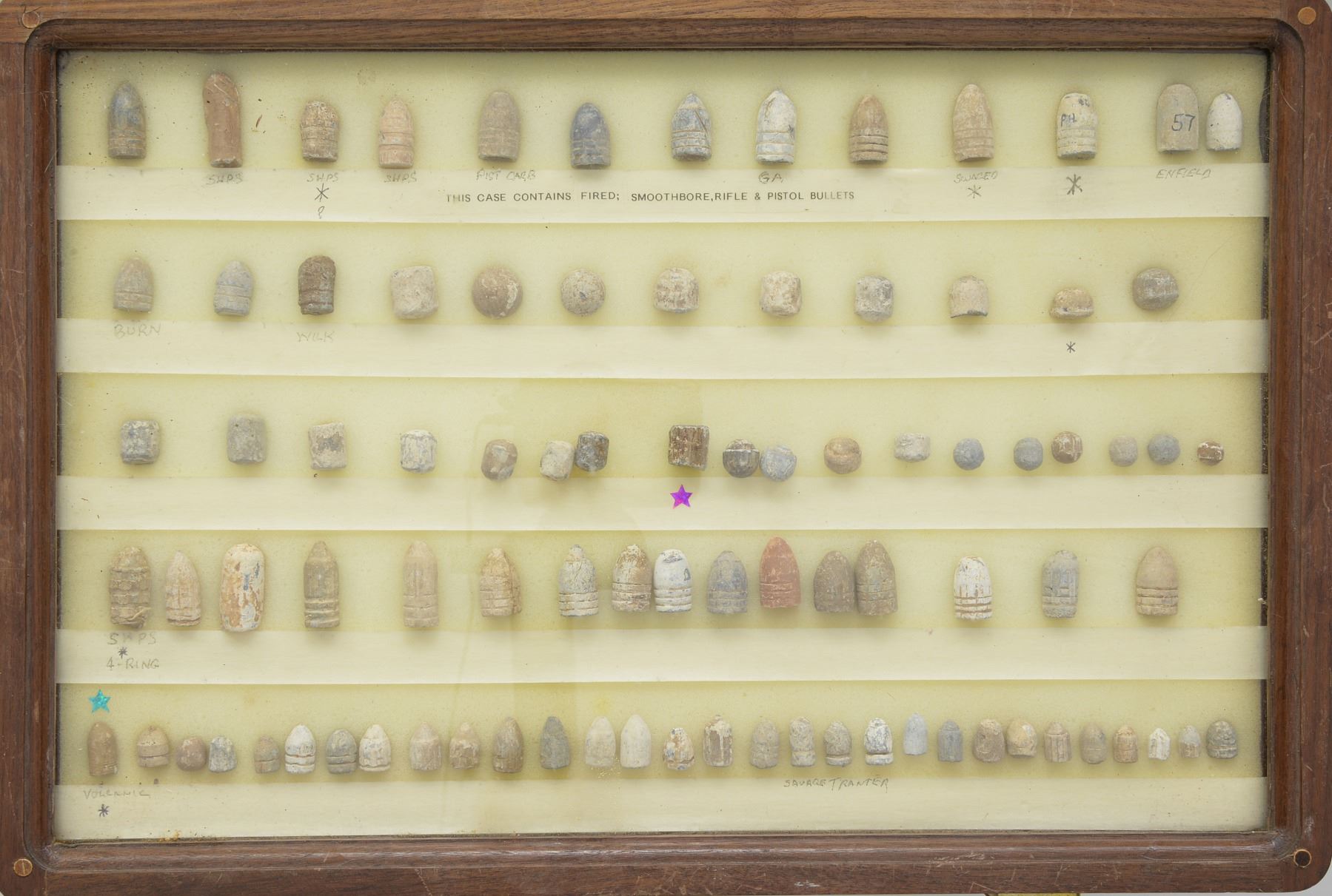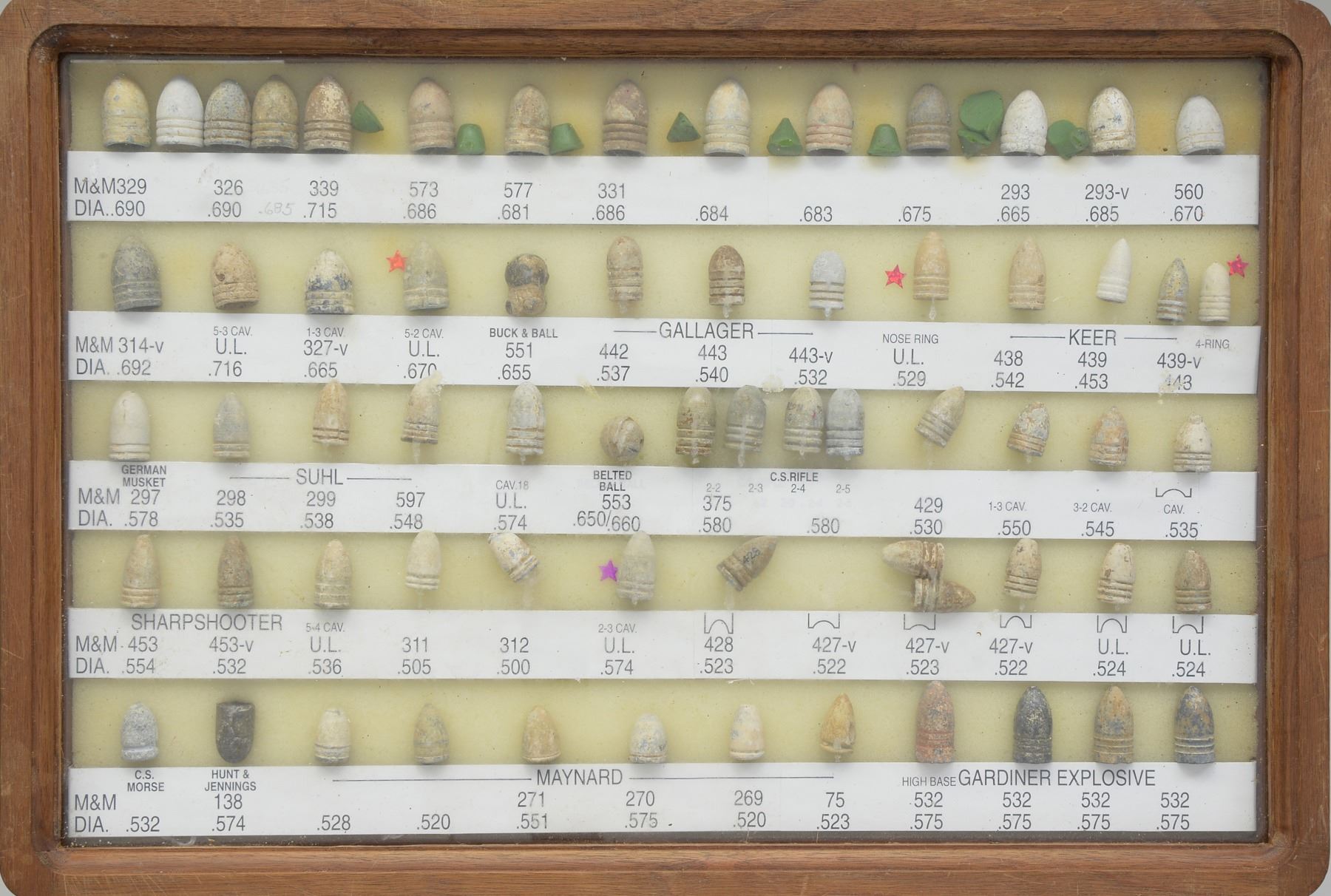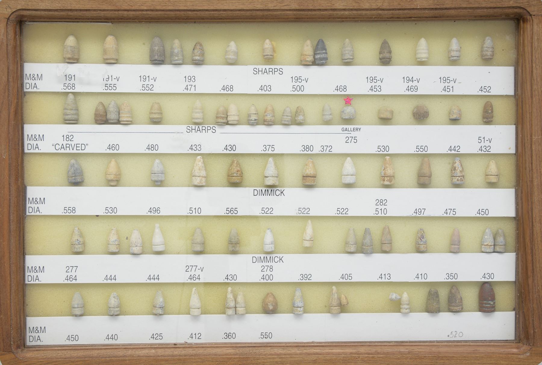 ARMS PROJECTILES EVER ASSEMBLED. Dan Poppen compiled the single finest collection of Civil War excavated bullets from camps & battlefields for over 50 years, constantly upgrading. His displays have won numerous awards over the years. This collection is housed in eighteen 12" x 16" wooden cases w/ each projectile named with its caliber & characteristics. There are many unique variants. There are some extra-ordinary rarities, which very few are known and this collection has the finest condition. Among the distinctive rarities is the Confederate 69 cal. explosive, hexagonal & double end Whitworths, 4 piece Shaler, all 3 variations of the "Arkansas Hog" 69 cal. projectile. There are 9 variant Whitworths, 8 variant Shalers. There is every known base marking for Enfield projectiles. There is every known marking variety for various US arsenal minies. There are numerous varieties of Sharps, Dimmicks (Swiss Chasseur). There are numerous varieties of Gardner projectiles, CS shotgun slugs, French imported & Confederate copies. There is every variation of Confederate armory projectiles, Carcanos, both imported & Confederate copies, excavated 1" gatling gun projectile. The list goes on and on. In Mason & Mckee's last edition of their projectile book (1980) they list a total of 658 projectiles, this collection has over 1,300 projectiles of which 908 are distinct varieties. The other approximate 400 display projectiles are 2 displays containing 166 fired projectiles showing the numerous calibers & rifling different weapons had. Fired bullets are the most common relic from battlefields but you have to dig hundreds of bullets to find perfect projectiles that did not get badly distorted still showing fine rifling of different weapons. There are 2 flats containing over 200 projectiles showing oddities from the battlefield and camps such as bullets carved or whittled by soldiers, bullets still attached to worms or cleaning jags, a bullet fired w/ the ramrod still in the gun, a fired bullet w/ portion of ramrod still attached (in the heat of battle there are many accounts of soldiers firing their guns with the ramrods still in the muzzles), bullets chewed by humans, bullets chewed by animals, "blow throughs", casting flaws, melted in the field. There are 2 sets of fused bullets, bullets that hit each other & fused as 1. There is a most interesting display of an exploded Confederate Boreman 12 lb. cannon ball with its fragments, fuse & 42 bullets that were contained and used as case shot. Of these 42 bullets are several variations including 69 cal. Tower, 69 cal. 3 ring, Carcano, Sugarloaf, Gardners .54 cal. & 58 cal., Confederate 3 ringers. As noted in the biography in the front of this catalog, Dan Poppen loved Civil War small arms projectiles which he first started collecting in the 1950s. Dan was an early friend of Mac Mason & encouraged his interest in Civil War bullets & helped him with his book, of which many of these projectiles are photographed & pictured in the classic Mason & McKee "Civil War Projectiles" from 1966 & the last 1980 edition with addendum. CONDITION: projectiles are very good to fine overall. Excavated lead patina. PROVENANCE: Estate Collection of Dan Poppen. (02-13448/JS). $40,000-60,000.