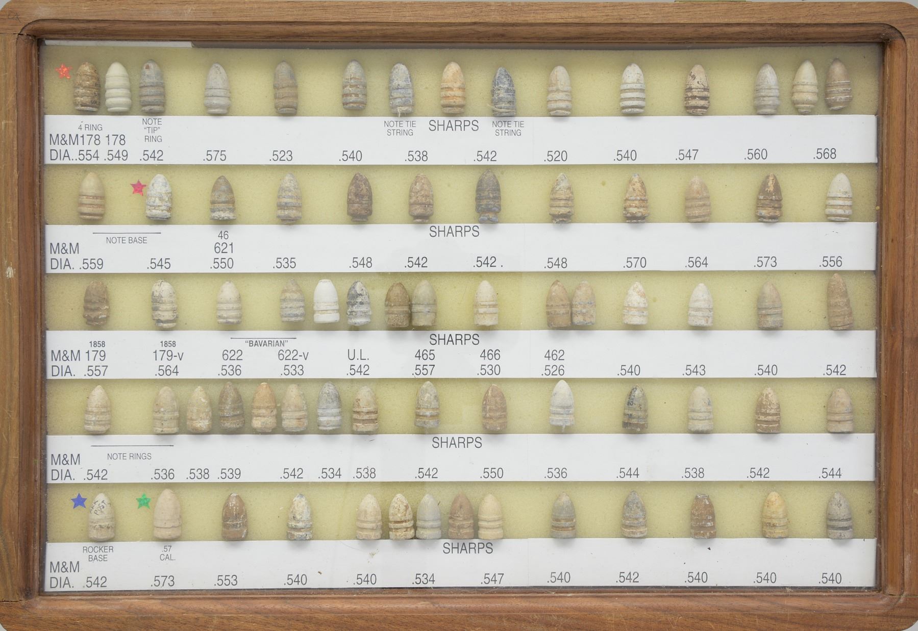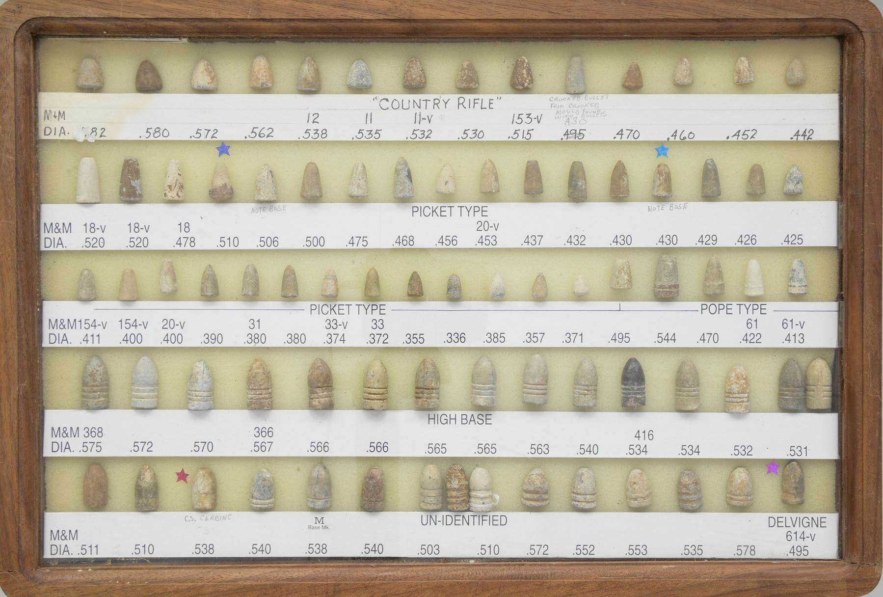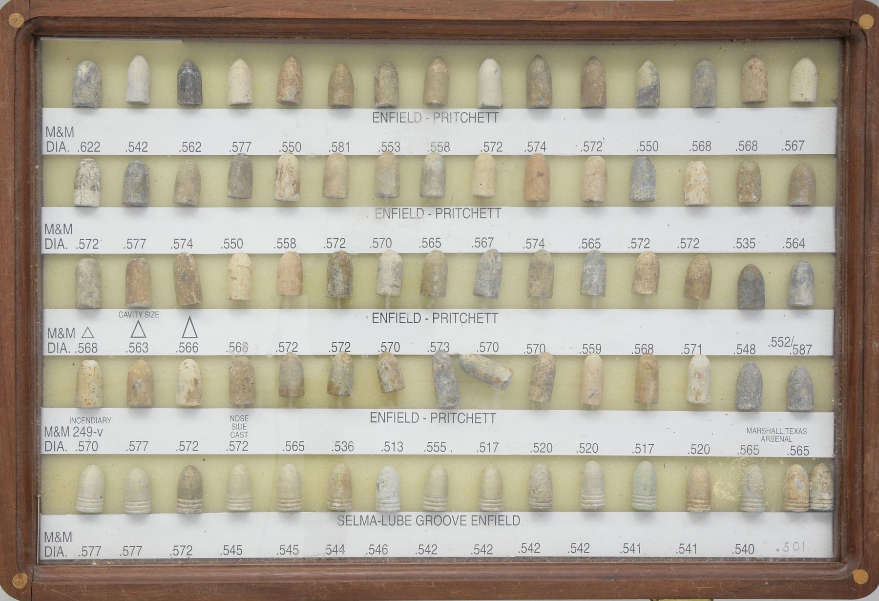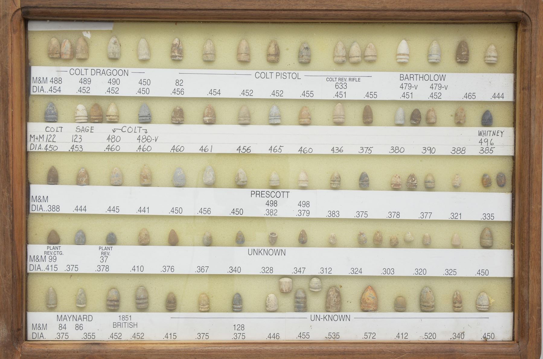ARMS PROJECTILES EVER ASSEMBLED. Dan Poppen compiled the single finest collection of Civil War excavated bullets from camps & battlefields for over 50 years, constantly upgrading. His displays have won numerous awards over the years. This collection is housed in eighteen 12" x 16" wooden cases w/ each projectile named with its caliber & characteristics. There are many unique variants. There are some extra-ordinary rarities, which very few are known and this collection has the finest condition. Among the distinctive rarities is the Confederate 69 cal. explosive, hexagonal & double end Whitworths, 4 piece Shaler, all 3 variations of the "Arkansas Hog" 69 cal. projectile. There are 9 variant Whitworths, 8 variant Shalers. There is every known base marking for Enfield projectiles. There is every known marking variety for various US arsenal minies. There are numerous varieties of Sharps, Dimmicks (Swiss Chasseur). There are numerous varieties of Gardner projectiles, CS shotgun slugs, French imported & Confederate copies. There is every variation of Confederate armory projectiles, Carcanos, both imported & Confederate copies, excavated 1" gatling gun projectile. The list goes on and on. In Mason & Mckee's last edition of their projectile book (1980) they list a total of 658 projectiles, this collection has over 1,300 projectiles of which 908 are distinct varieties. The other approximate 400 display projectiles are 2 displays containing 166 fired projectiles showing the numerous calibers & rifling different weapons had. Fired bullets are the most common relic from battlefields but you have to dig hundreds of bullets to find perfect projectiles that did not get badly distorted still showing fine rifling of different weapons. There are 2 flats containing over 200 projectiles showing oddities from the battlefield and camps such as bullets carved or whittled by soldiers, bullets still attached to worms or cleaning jags, a bullet fired w/ the ramrod still in the gun, a fired bullet w/ portion of ramrod still attached (in the heat of battle there are many accounts of soldiers firing their guns with the ramrods still in the muzzles), bullets chewed by humans, bullets chewed by animals, "blow throughs", casting flaws, melted in the field. There are 2 sets of fused bullets, bullets that hit each other & fused as 1. There is a most interesting display of an exploded Confederate Boreman 12 lb. cannon ball with its fragments, fuse & 42 bullets that were contained and used as case shot. Of these 42 bullets are several variations including 69 cal. Tower, 69 cal. 3 ring, Carcano, Sugarloaf, Gardners .54 cal. & 58 cal., Confederate 3 ringers. As noted in the biography in the front of this catalog, Dan Poppen loved Civil War small arms projectiles which he first started collecting in the 1950s. Dan was an early friend of Mac Mason & encouraged his interest in Civil War bullets & helped him with his book, of which many of these projectiles are photographed & pictured in the classic Mason & McKee "Civil War Projectiles" from 1966 & the last 1980 edition with addendum. CONDITION: projectiles are very good to fine overall. Excavated lead patina. PROVENANCE: Estate Collection of Dan Poppen. (02-13448/JS). $40,000-60,000.