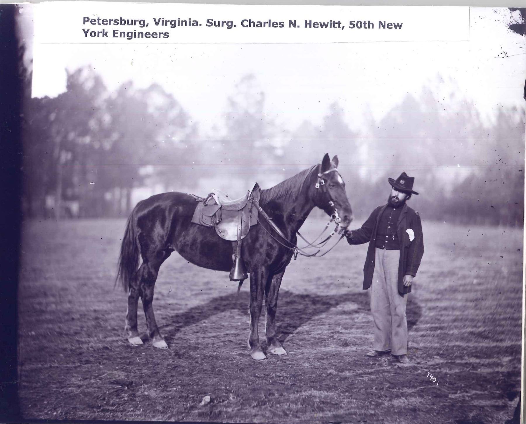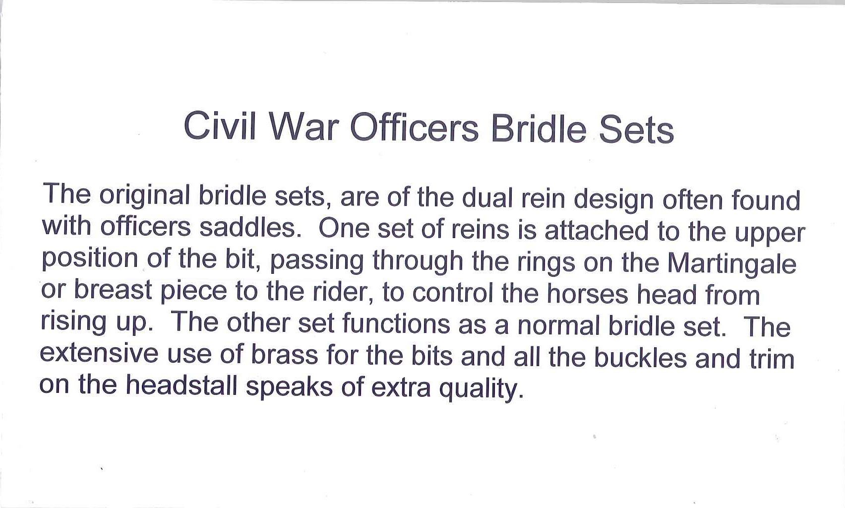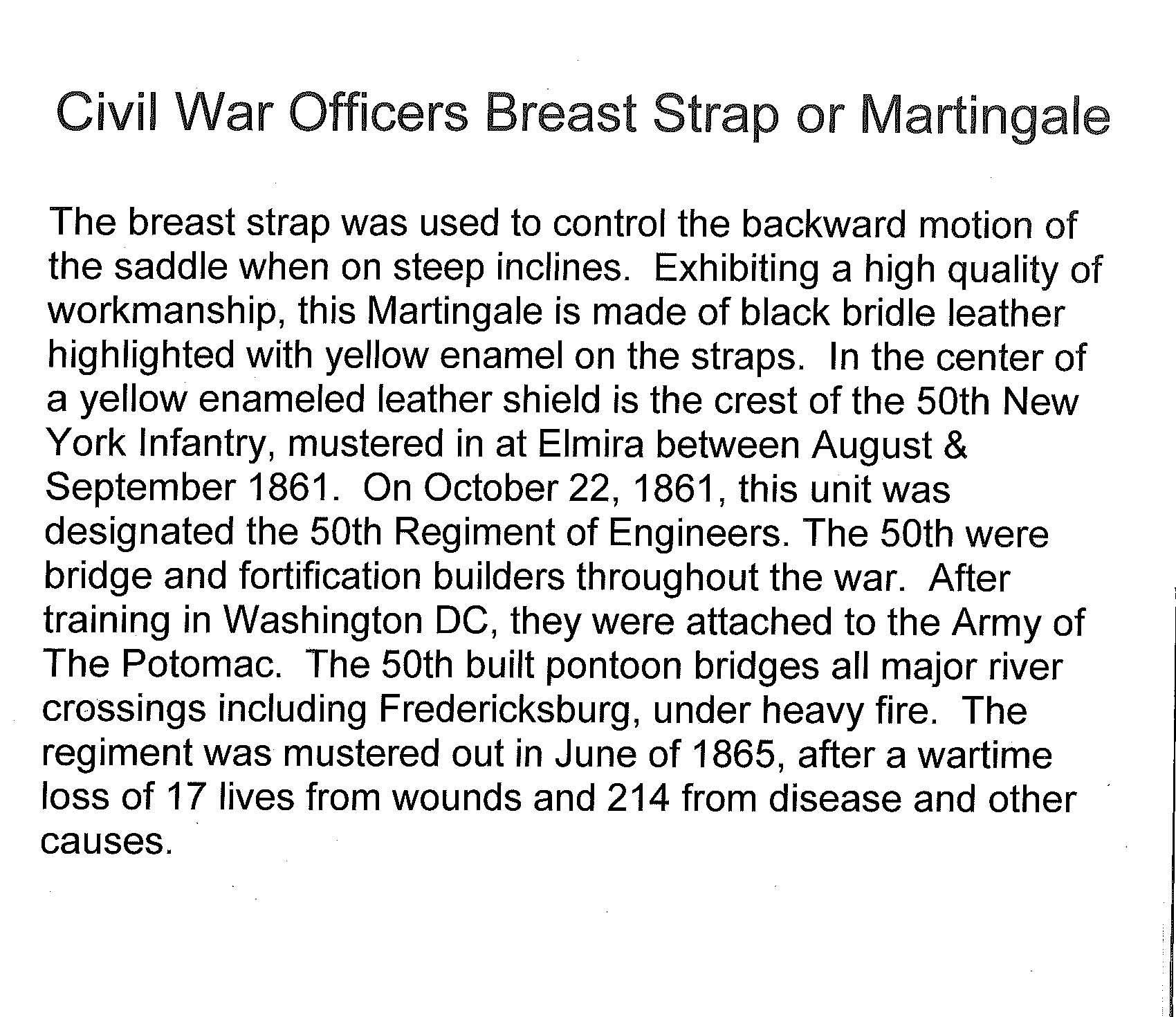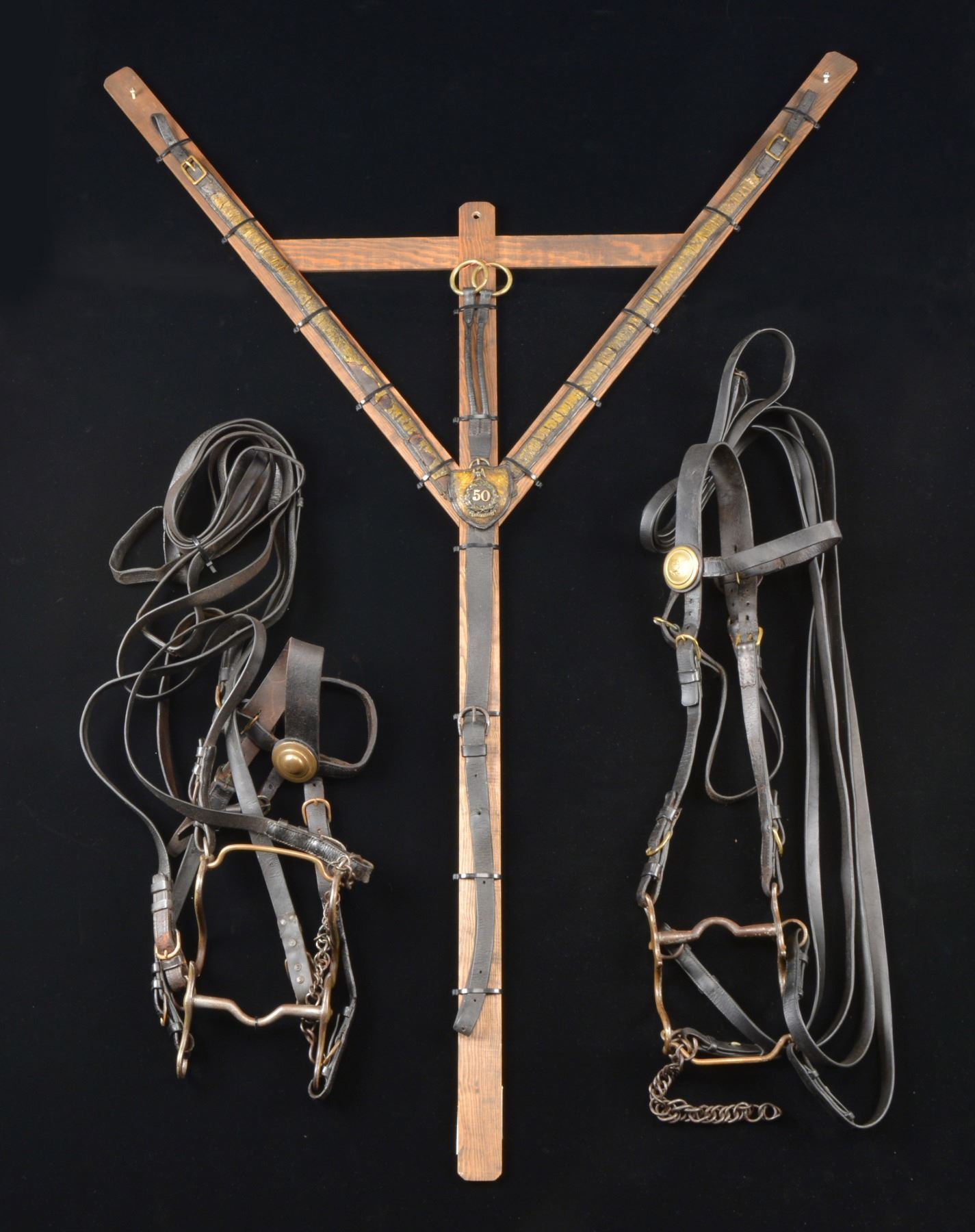 WAR CAVALRY ERA BRIDLE SETS. The breast strap or martingale exhibits high quality workmanship & unique yellow enameled leather shield w/ the crest of the 50th New York Infantry. The 50th New York mustered in at Elmira, NY in the summer of 1861 & would soon be designated the 50th Regiment of Engineers. The 50th were bridge & fortification builders throughout the war attached to the Army of the Potomac. They built pontoon bridges on all major river crossings including at battle of Fredericksburg, under heavy fire. The regiment served the entire war mustering out in June 1865 w/ death from wounds & disease totaling 231 men. These 2 bridle sets are of the dual rein design often found w/ officer saddles. One set of reins is attached to the upper position of the bit, passing through the rings on the martingale to the rider, to control the horses head from rising up. The other set functions as a normal bridle set w/ embossed eagle rosettes. The extensive use brass for these bits & trim of the headstalls show of high quality private purchase. CONDITION: martingale brass insignia is fair to good overall w/ medium dark mustard patina. The yellow enameled surface of martingale & straps is heavily crazed, cracked & about 10% missing, there are breaks in 2 of the straps at martingale, but are displayed nicely on a custom branched wood display to hold each strap. Both bridle sets are good to very good overall, complete & well preserved. PROVENANCE: Herbert "Bert" Murch Collection. (02-12860/JS). $1,500-2,000.
