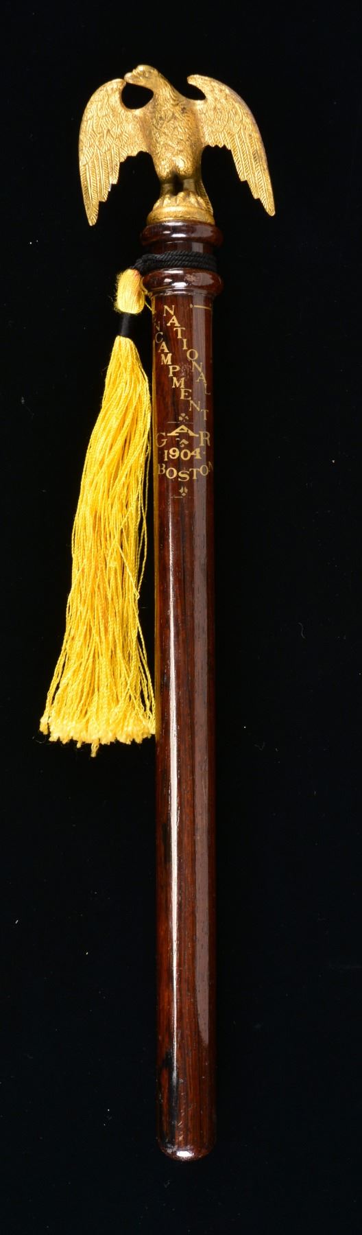 Baton measures 20” in length & is topped by a gilded eagle similar to a flag pole top. Written in gold letters on the finely finished wooden shaft is, “NATIONAL ENCAMPMENT GAR 1904 BOSTON”. An attractive yellow tassel is tied around the top. CONDITION: there is a bit of tarnish on the eagle. Gold lettering is slightly worn. Finish on baton is nearly complete. (02-13508/BF). $300-500.