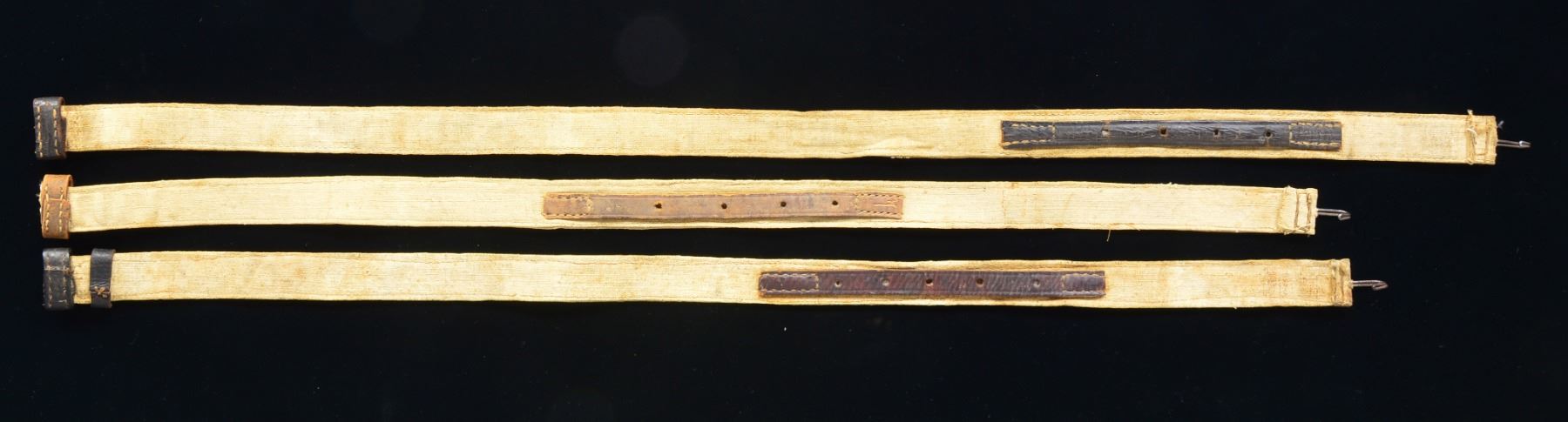 3 Heavy cotton or cotton linen slings, all of different lengths but each approx. 1.75" wide (32.5", 33.25" & 37.5" each). Each sling has iron wire hook at one end & approx. .75" wide flat leather sling loop at the other. Sewn onto reverse side of each sling is a leather strip, slings leather start about 4", 6" & 10" from hook, leather strips range 8" – 10" long w/ holes designed to receive the hook. CONDITION: very good overall. 1 Sling has additional leather adjuster. Fabric soiled & stained. Scuffs & crazing to leather strips, but complete. PROVENANCE: Atlanta History Center 2005. (02-12949, 02-12952, 02-12961/JS). $1,200-1,800.