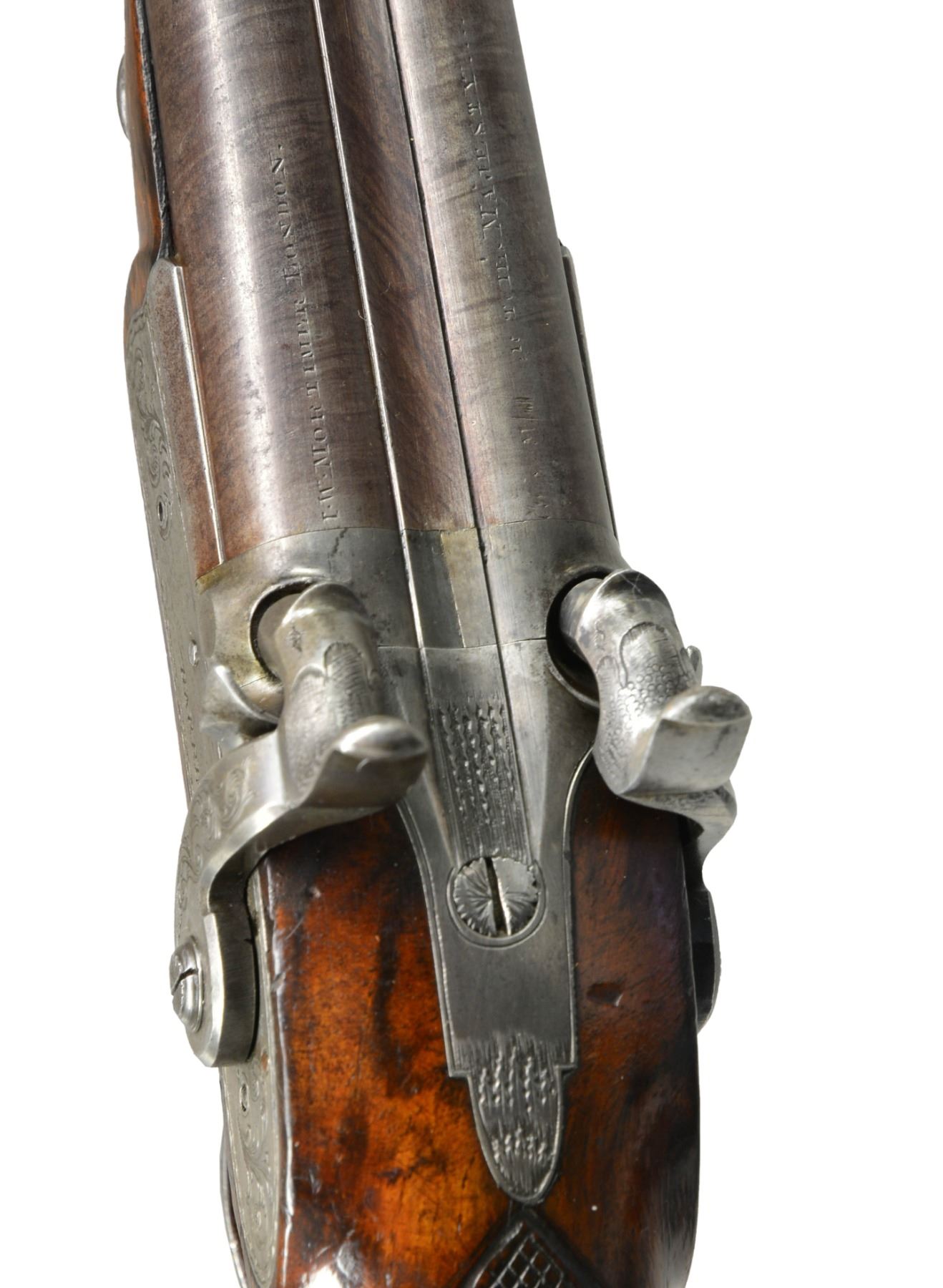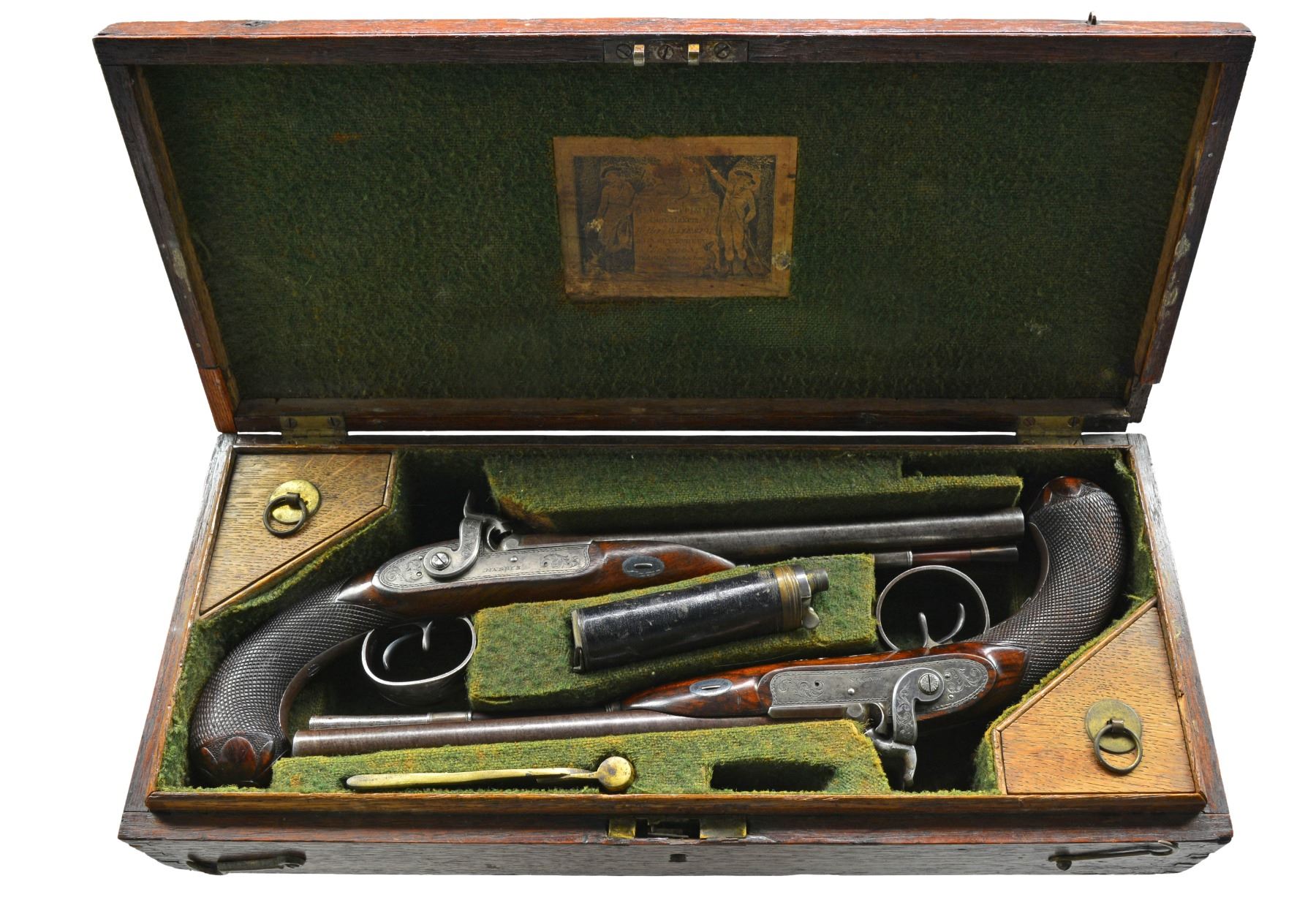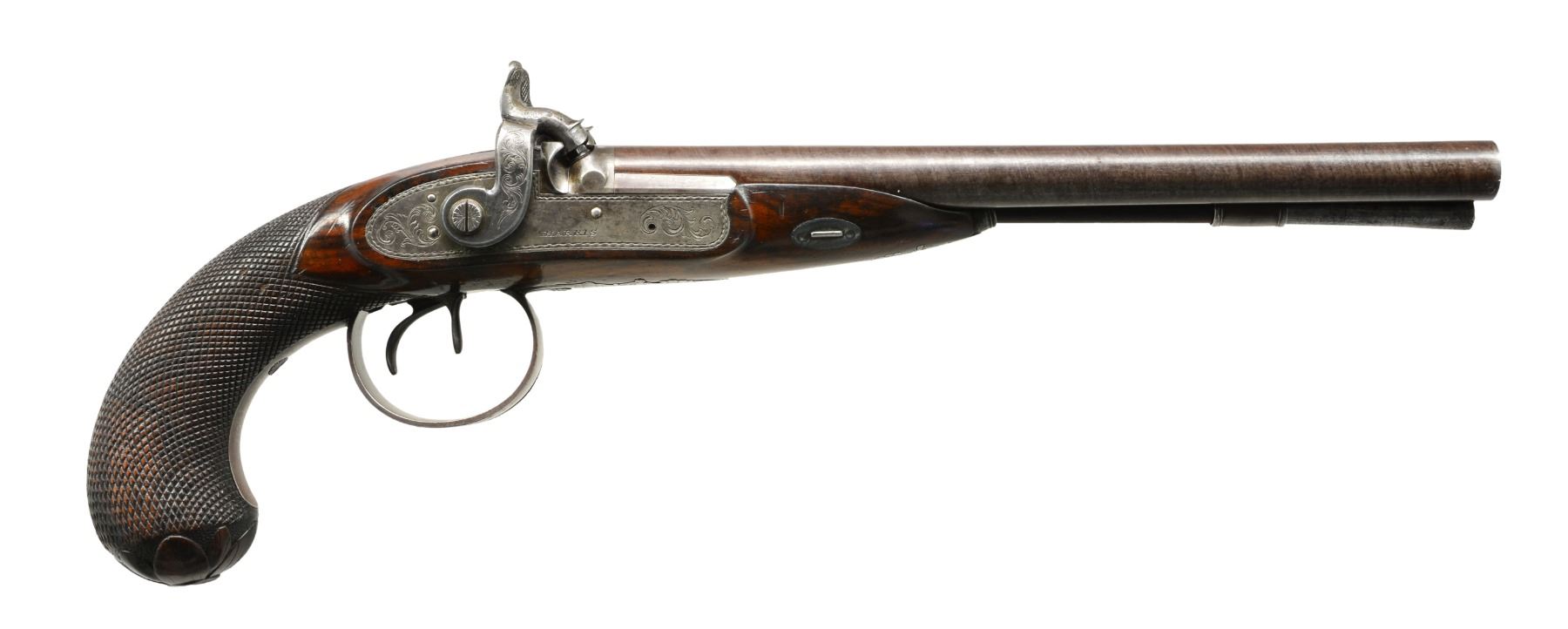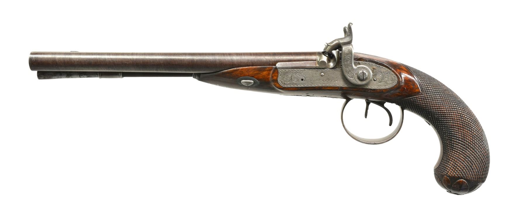 DOUBLE BARREL HOWDAH PISTOLS OF ADMIRAL SCOTT. Cal. 26 bore (approx .56 cal.). Smooth bore. 9 3/4" Twisted bbls. w/ central ribs are engraved “H. W. MORTIMER LONDON / GUN MAKER TO HIS MAJESTY”. Iron mounted w/ percussion conversion locks marked “HARRIS” lightly engraved w/ dbl. line scalloped borders, hammers are engraved en suite. European walnut stocks w/ checkered bag grips are steel mounted & attach to bbls. w/ single keys through oval silver escutcheons. Trigger guards have panoplies of arms engraved on bows & have stylized pineapple finials. Tailpipes have similar pineapple themed engraving. Butts are elegantly carved as 8-leaved flowers. Guns retain their original ramrods, 1 w/ a steel powder measure, the other horn tipped w/ iron worm. The only Admiral Scott that seems to possibly fit the inscription is Sir James Scott (1790-1872), a long serving British naval officer. He entered British service in 1803 retiring in 1865, he had good service as a captain in the American Revolutionary war, he attained the rank of admiral in 1854, possibly about the date these guns were converted to percussion. UNATTACHED ACCESSORIES: mahogany case w/ inlet D ring handle engraved “ADMIRAL SCOTT”, key lock closure, is lined in green baize & contains a leather covered 3 compartment flask & a brass scissor mold. CONDITION: very good. Metal overall is gray patina w/ traces of finish in protected areas stocks are sound & solid retaining some original varnish. Mechanics are fine w/ smooth clean bores. Case is sound w/ a 1” x 1/2" corner piece missing & some repairs & varnish. Interior cloth is worn w/ reductions. (01-17229/JS). ANTIQUE. $6,000-8,000.