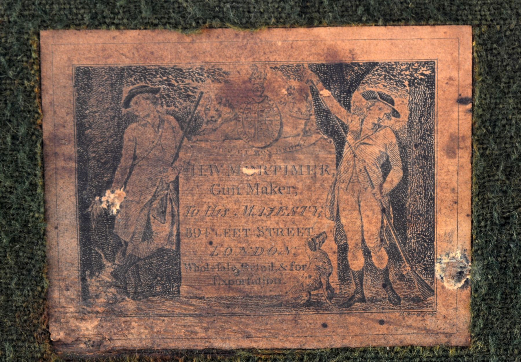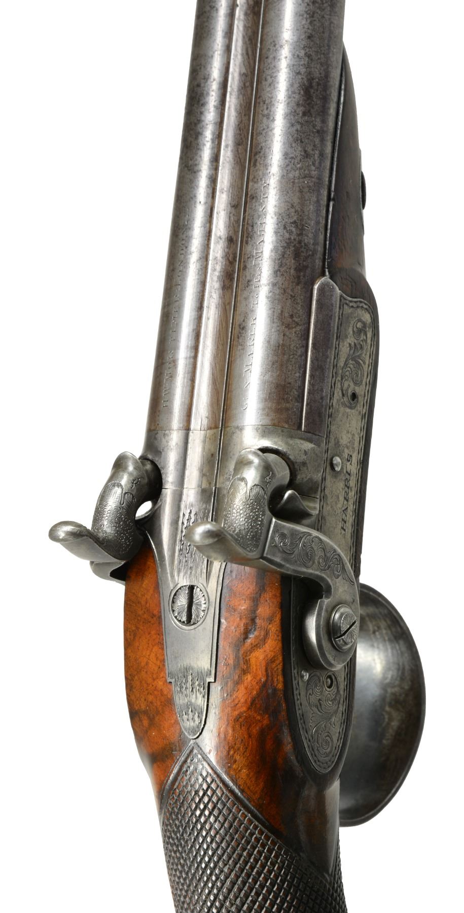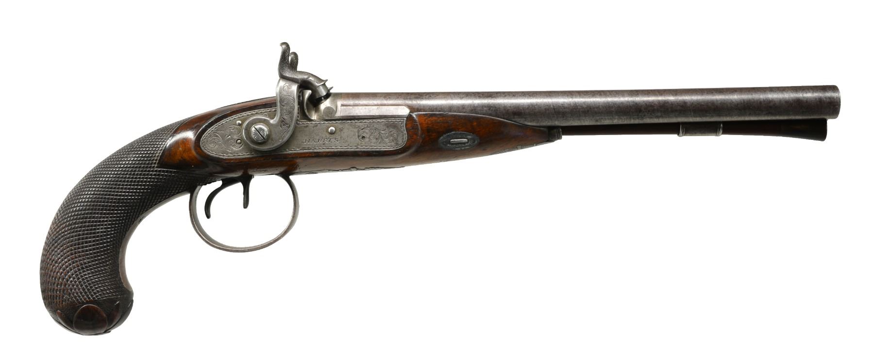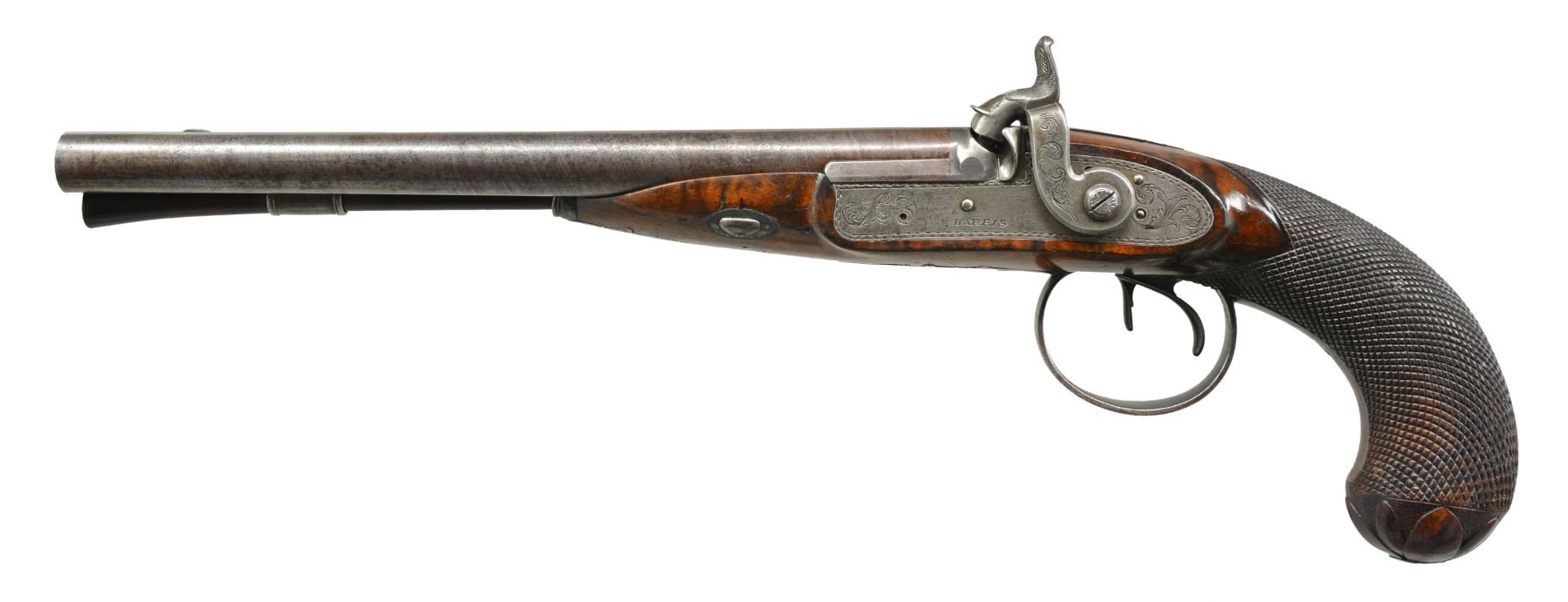 DOUBLE BARREL HOWDAH PISTOLS OF ADMIRAL SCOTT. Cal. 26 bore (approx .56 cal.). Smooth bore. 9 3/4" Twisted bbls. w/ central ribs are engraved “H. W. MORTIMER LONDON / GUN MAKER TO HIS MAJESTY”. Iron mounted w/ percussion conversion locks marked “HARRIS” lightly engraved w/ dbl. line scalloped borders, hammers are engraved en suite. European walnut stocks w/ checkered bag grips are steel mounted & attach to bbls. w/ single keys through oval silver escutcheons. Trigger guards have panoplies of arms engraved on bows & have stylized pineapple finials. Tailpipes have similar pineapple themed engraving. Butts are elegantly carved as 8-leaved flowers. Guns retain their original ramrods, 1 w/ a steel powder measure, the other horn tipped w/ iron worm. The only Admiral Scott that seems to possibly fit the inscription is Sir James Scott (1790-1872), a long serving British naval officer. He entered British service in 1803 retiring in 1865, he had good service as a captain in the American Revolutionary war, he attained the rank of admiral in 1854, possibly about the date these guns were converted to percussion. UNATTACHED ACCESSORIES: mahogany case w/ inlet D ring handle engraved “ADMIRAL SCOTT”, key lock closure, is lined in green baize & contains a leather covered 3 compartment flask & a brass scissor mold. CONDITION: very good. Metal overall is gray patina w/ traces of finish in protected areas stocks are sound & solid retaining some original varnish. Mechanics are fine w/ smooth clean bores. Case is sound w/ a 1” x 1/2" corner piece missing & some repairs & varnish. Interior cloth is worn w/ reductions. (01-17229/JS). ANTIQUE. $6,000-8,000.