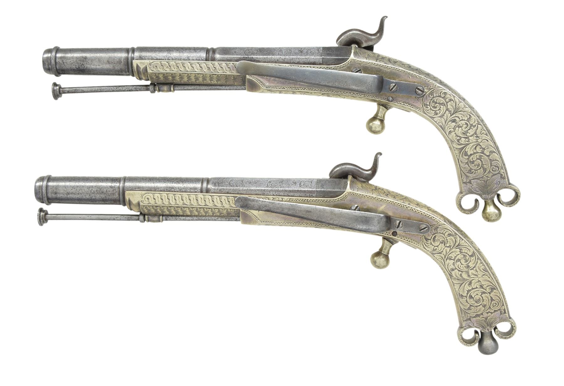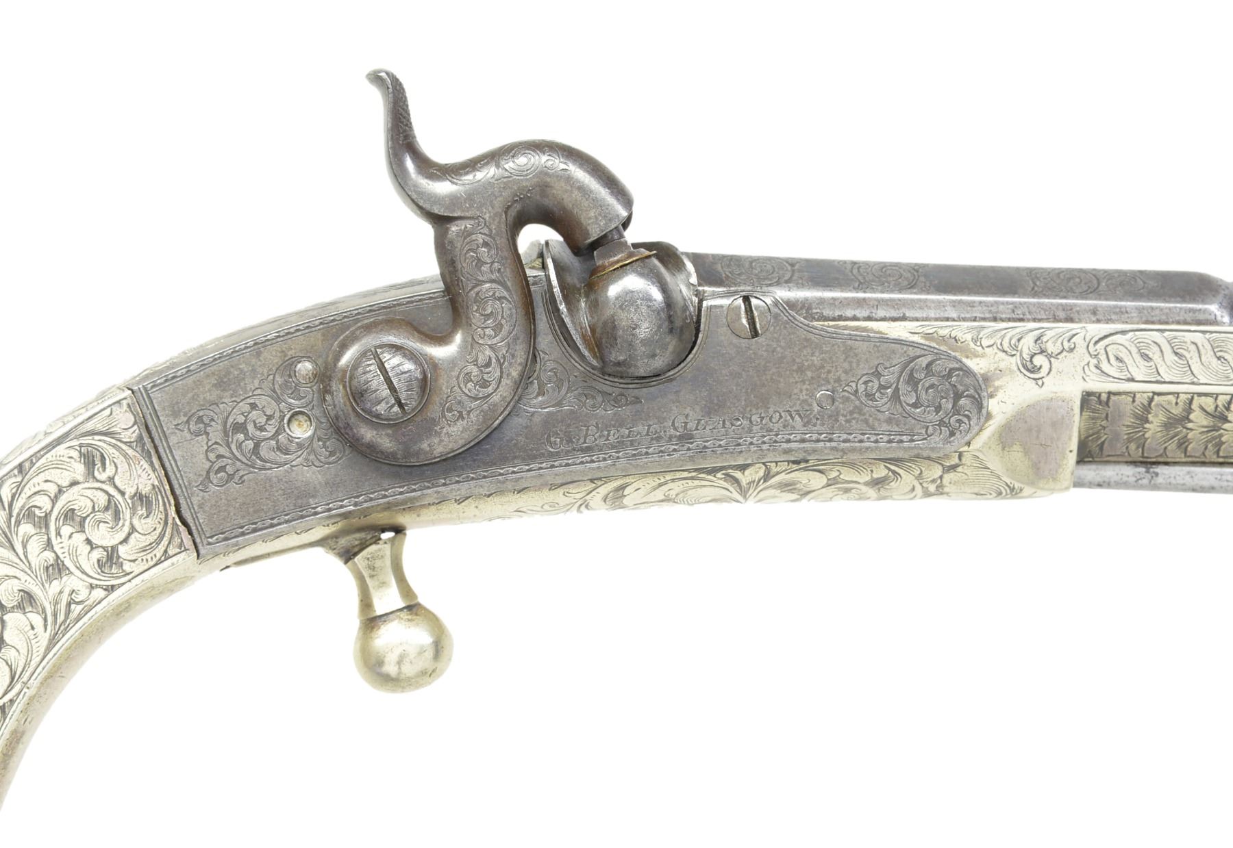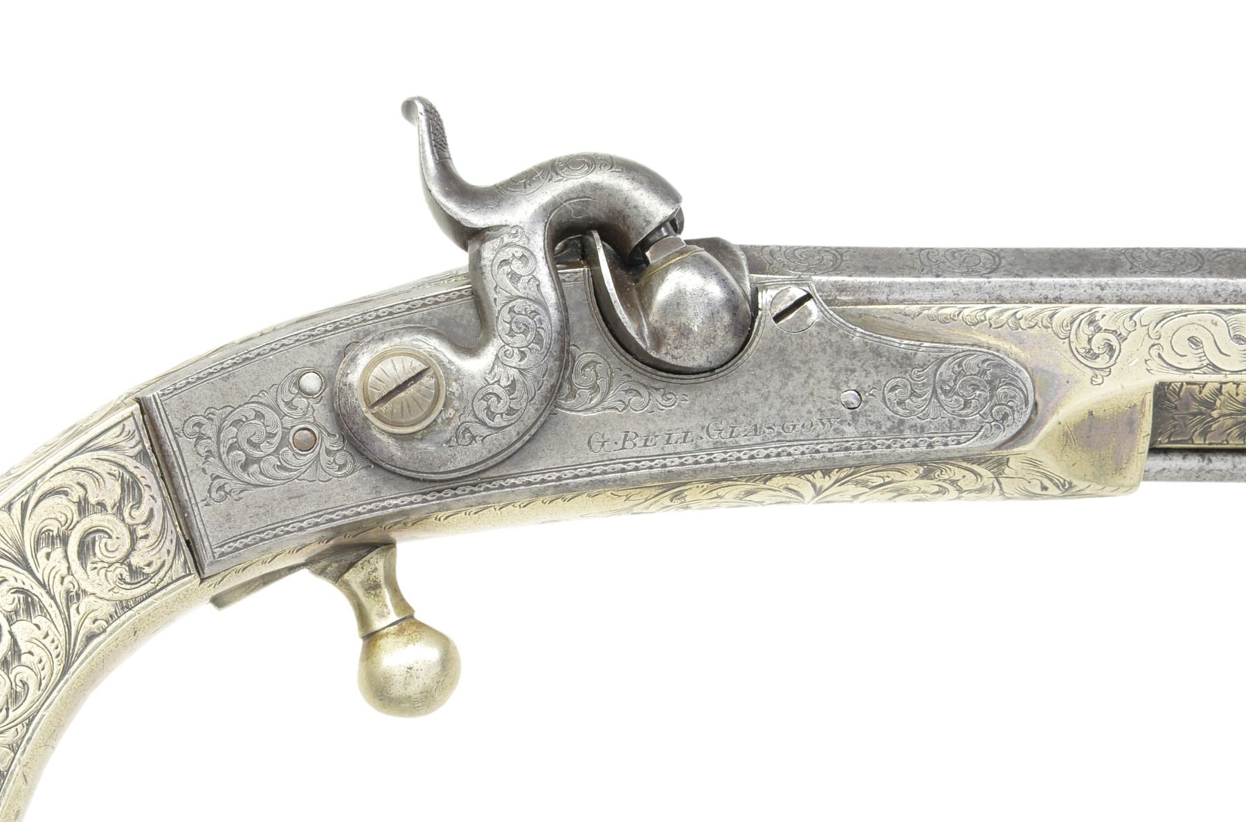 BELT PISTOLS. Cal. 50. NSN. 7 1/8" Oct. to rnd. 4 stage bbls. w/ wedding ring transitions. 11" Overall. All metal construction w/ ram's horn butts & ball triggers. 3 3/4" Belt hooks. Each lock marked "G. BELL GLASGOW". All surfaces are engraved w/ nearly full coverage. CONDITION: good to very good overall. Iron is overall gray w/ light pitting. German silver has silver/gray patina. Engraving is well defined as can be seen in photos. Appear original & complete w/ 1 gun having restored hammer screw & buttcap oiler. Mechanically fine w/ clean smooth bores. (01-17265/JS). ANTIQUE. $5,000-7,000.