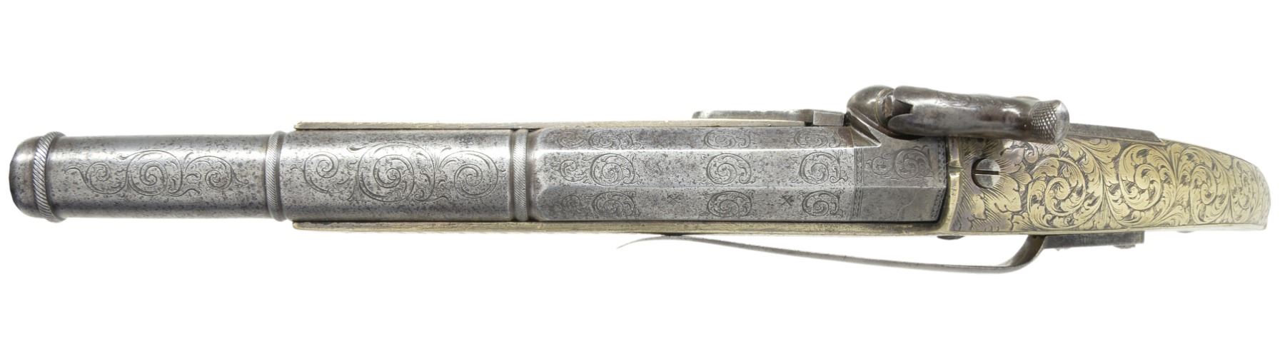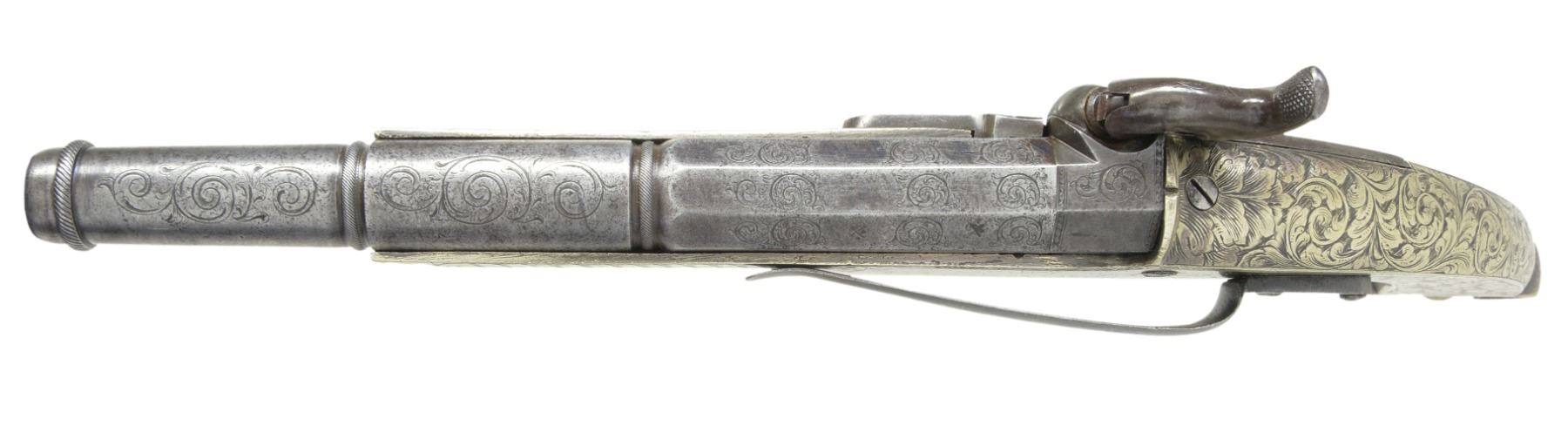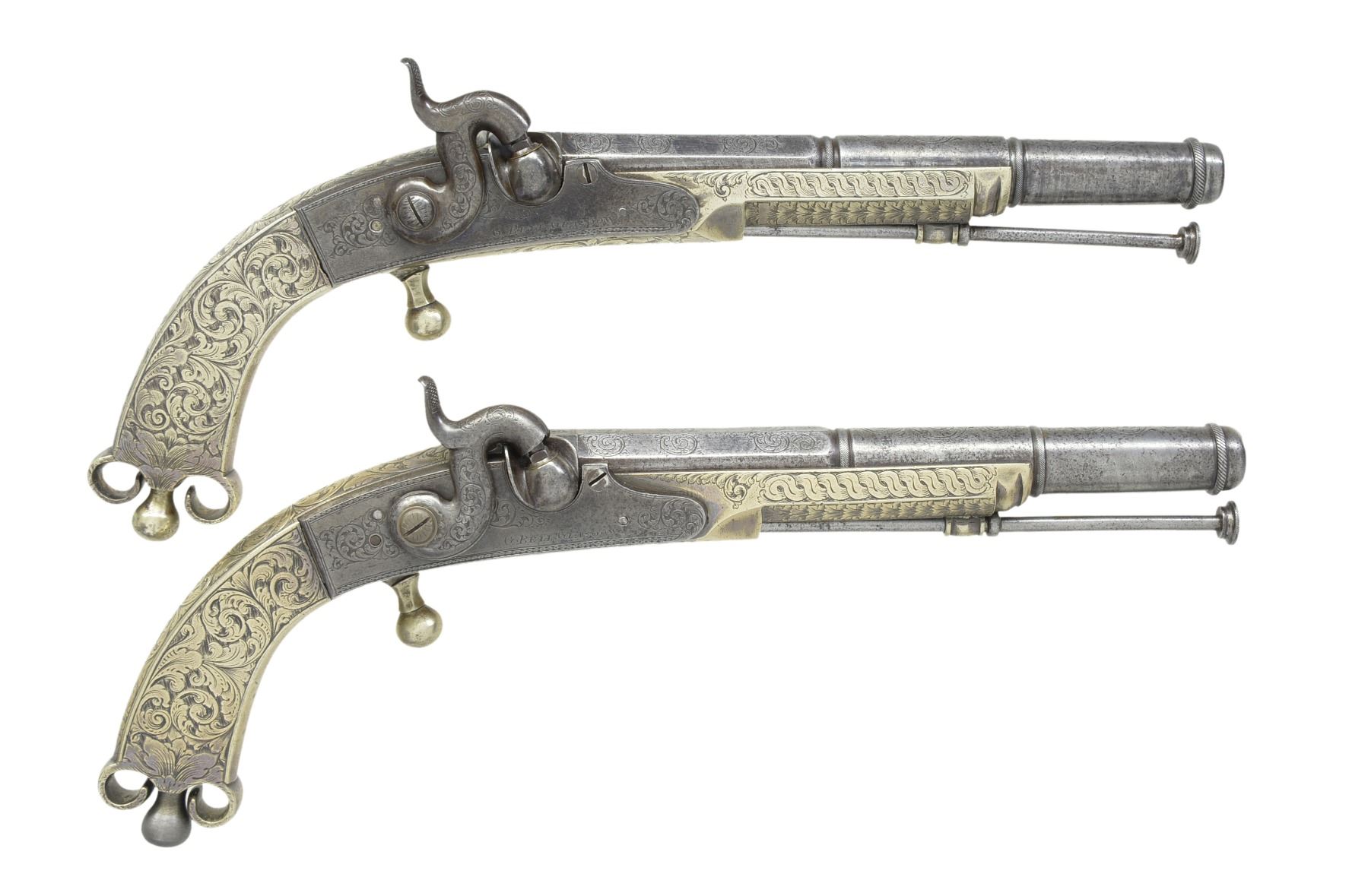 BELT PISTOLS. Cal. 50. NSN. 7 1/8" Oct. to rnd. 4 stage bbls. w/ wedding ring transitions. 11" Overall. All metal construction w/ ram's horn butts & ball triggers. 3 3/4" Belt hooks. Each lock marked "G. BELL GLASGOW". All surfaces are engraved w/ nearly full coverage. CONDITION: good to very good overall. Iron is overall gray w/ light pitting. German silver has silver/gray patina. Engraving is well defined as can be seen in photos. Appear original & complete w/ 1 gun having restored hammer screw & buttcap oiler. Mechanically fine w/ clean smooth bores. (01-17265/JS). ANTIQUE. $5,000-7,000.