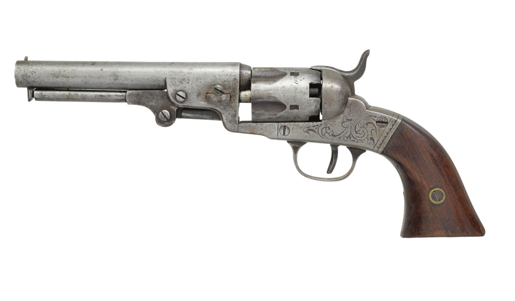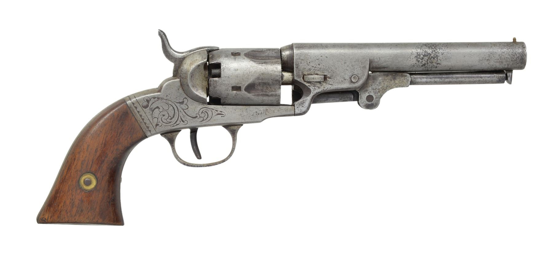 Cal. 31. S# 235. 10 1/4" Overall. Bbl. 5" rnd. marked "BACON MF'G. CO NORWICH, CONN". Fluted cyl. Engraved frame w/ 2 piece walnut grips. CONDITION: good overall, appears all matching & original. Mechanically fine w/ well defined rifled bore. PROVENANCE: Estate Collection of Dan Poppen. (01-17331/JS). ANTIQUE. $400-600.