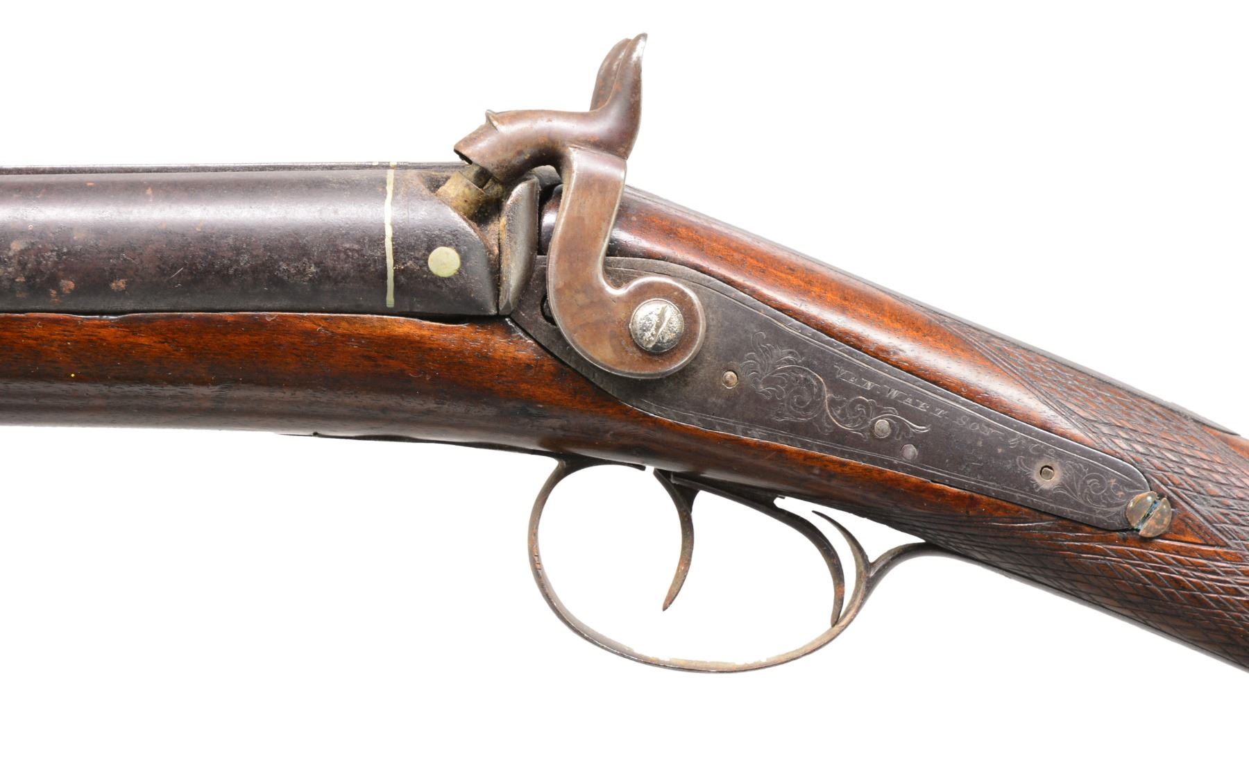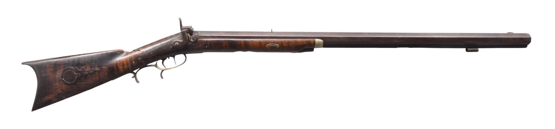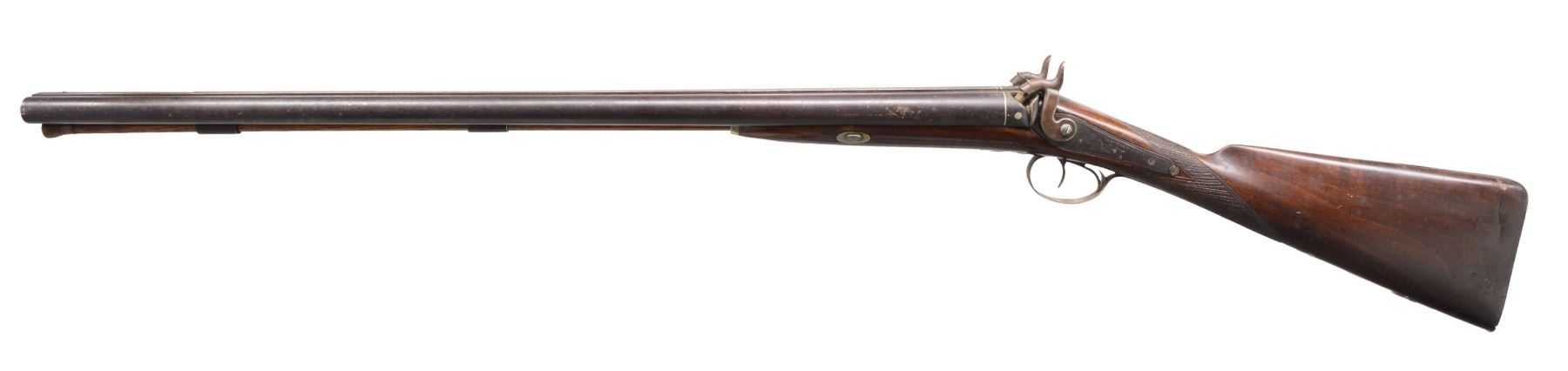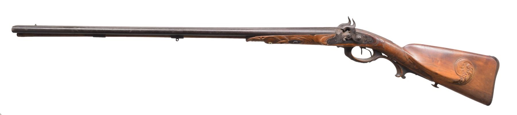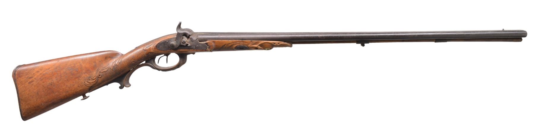 1) HEAVY BARREL HALF STOCK RIFLE. Cal. 36. NSN. This unmarked back action half stock weighs in at a whopping 11.5 lbs. Totally unmarked. Dbl. set triggers. Sm. iron patch box. Bbl. is lightly engraved at breech w/ 2 silver bands. Lock, patch box & trigger guard also lightly engraved. CONDITION: fair to good overall. Well used in its day. Metal is a dark patina. Well worn. Stock has hand worn patina w/ broken wrist having w/ repair & well patinaed screws & tacks. Striped stock is checkered at wrist. Has a 1 1/2" opening between thimble & trigger guard that is well patinad over. Mechanically functional w/ pitted bore (01-17311/JS). 2) GERMANIC CARVED SXS. Cal. 20 Ga. NSN. 49" Overall having 32" bbls. w/ central rib & inset name in silver. Locks are also inset in silver like bbls. "I.N. MITHELSIE IN MUHLHAUSEN". Locks & hammers are lightly engraved. Locks have pivoting safeties. Stock & wooden trigger guard are carved w/ forestock terminating into an animal's head w/ lg. teeth & inset ebony & mother of pearl eyes. CONDITION: fair to good overall, mechanically fine w/ clear dark bores. Carved stock has break forward of lock, which has crude glued repair. (01-17313/JS). 3) VAN WART, LONDON PERCUSSION SXS SHOTGUN. Cal. 12 Ga. NSN. Back action locks w/ 30" twist bbls. having central spine marked "LONDON" w/ silver inlaid hunting scene, 4 inlaid platinum bands & platinum blow outs. Lightly figured European walnut has checkered wrist. Iron trigger guard, thimbles & buttplate. CONDITION: good overall. Mechanics are fine w/ smooth dark bores. Metal overall is a dark plum/brown patina. Hammers are recolored & are gray/plum. Hammer screw on right is replaced. Brass tipped ramrod, worm at other end. Stock is sound & well fit. PROVENANCE: Estate Collection of Dan Poppen. (01-17342/JS). ANTIQUE. $700-900.
