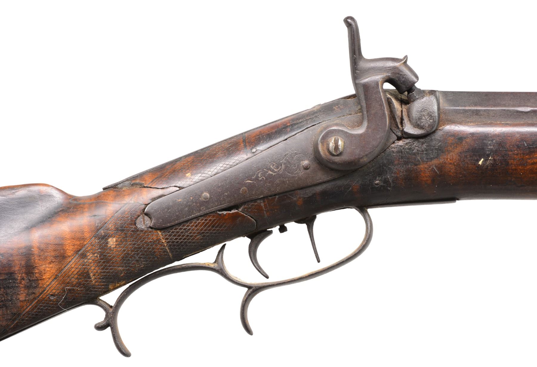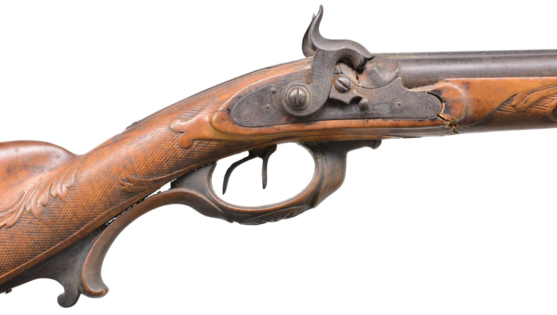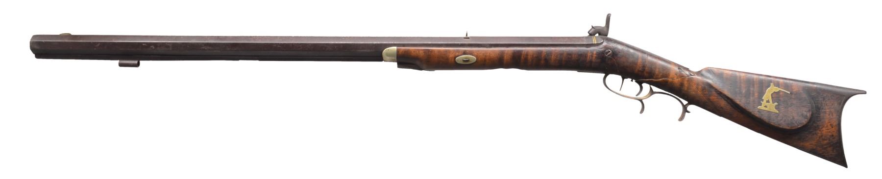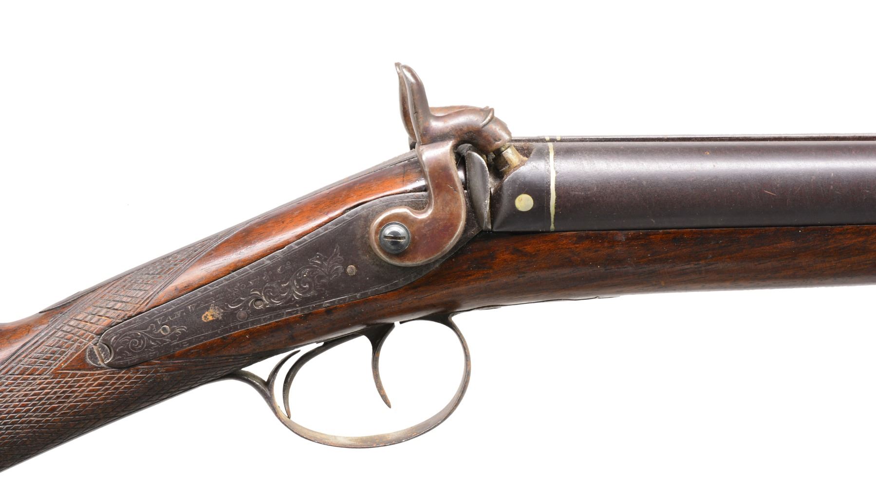 1) HEAVY BARREL HALF STOCK RIFLE. Cal. 36. NSN. This unmarked back action half stock weighs in at a whopping 11.5 lbs. Totally unmarked. Dbl. set triggers. Sm. iron patch box. Bbl. is lightly engraved at breech w/ 2 silver bands. Lock, patch box & trigger guard also lightly engraved. CONDITION: fair to good overall. Well used in its day. Metal is a dark patina. Well worn. Stock has hand worn patina w/ broken wrist having w/ repair & well patinaed screws & tacks. Striped stock is checkered at wrist. Has a 1 1/2" opening between thimble & trigger guard that is well patinad over. Mechanically functional w/ pitted bore (01-17311/JS). 2) GERMANIC CARVED SXS. Cal. 20 Ga. NSN. 49" Overall having 32" bbls. w/ central rib & inset name in silver. Locks are also inset in silver like bbls. "I.N. MITHELSIE IN MUHLHAUSEN". Locks & hammers are lightly engraved. Locks have pivoting safeties. Stock & wooden trigger guard are carved w/ forestock terminating into an animal's head w/ lg. teeth & inset ebony & mother of pearl eyes. CONDITION: fair to good overall, mechanically fine w/ clear dark bores. Carved stock has break forward of lock, which has crude glued repair. (01-17313/JS). 3) VAN WART, LONDON PERCUSSION SXS SHOTGUN. Cal. 12 Ga. NSN. Back action locks w/ 30" twist bbls. having central spine marked "LONDON" w/ silver inlaid hunting scene, 4 inlaid platinum bands & platinum blow outs. Lightly figured European walnut has checkered wrist. Iron trigger guard, thimbles & buttplate. CONDITION: good overall. Mechanics are fine w/ smooth dark bores. Metal overall is a dark plum/brown patina. Hammers are recolored & are gray/plum. Hammer screw on right is replaced. Brass tipped ramrod, worm at other end. Stock is sound & well fit. PROVENANCE: Estate Collection of Dan Poppen. (01-17342/JS). ANTIQUE. $700-900.