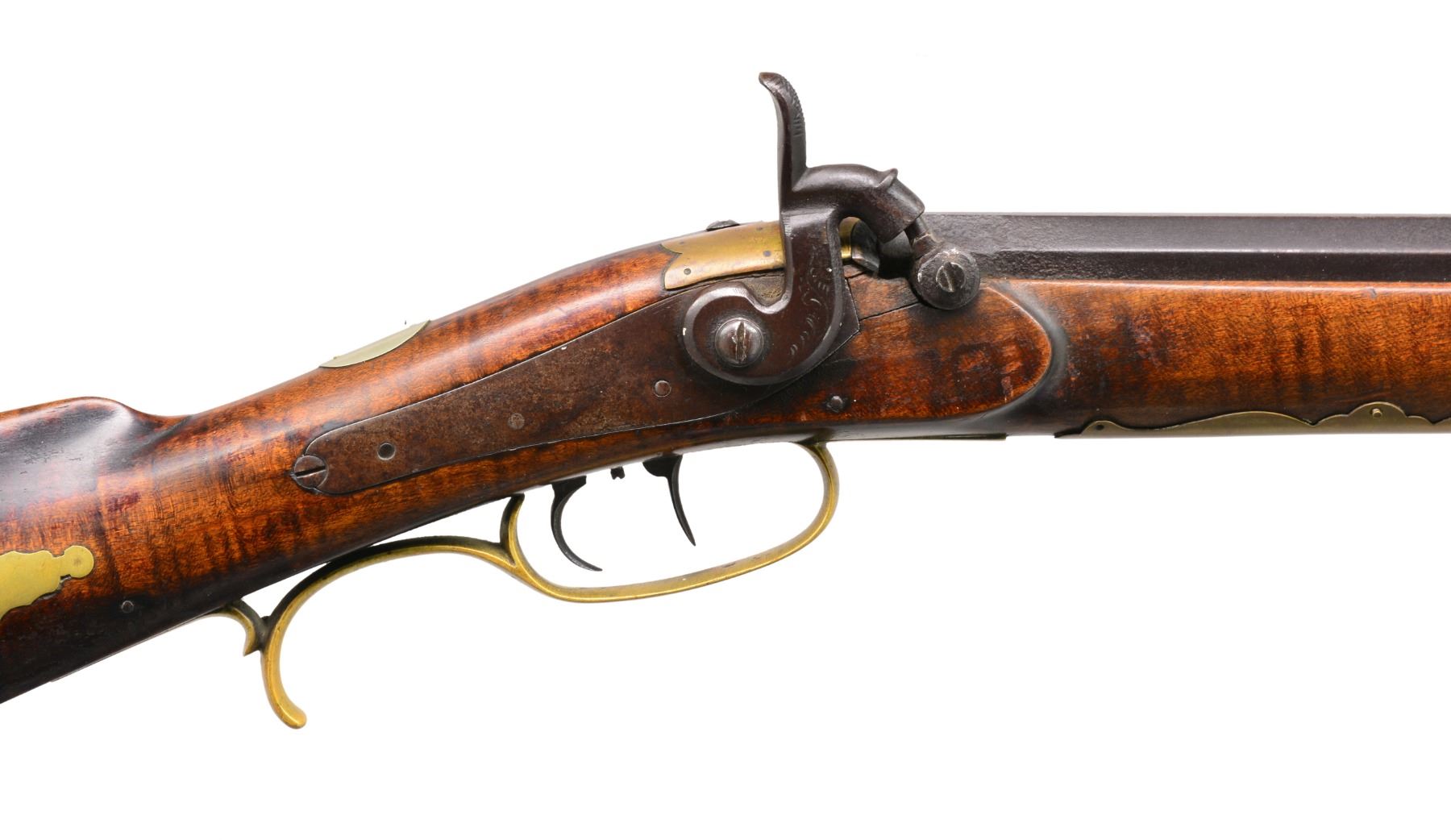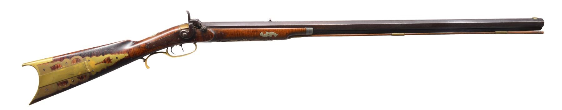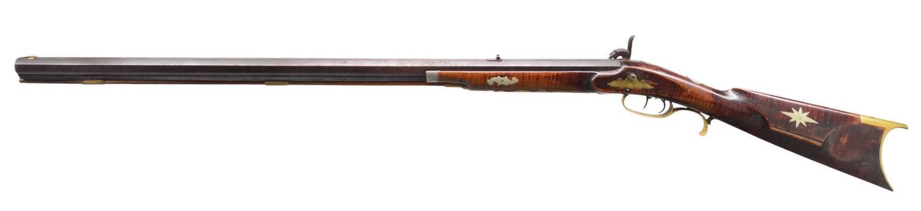 Cal. 32. NSN. 47 1/2" Overall. Unmarked, back action lock. Bbl. 31 1/2” oct. w/ fixed notch sight & inset dovetailed German silver front blade, striped maple stock. 4 Piece pierced & engraved patchbox, brass furniture, German silver hunter’s star on cheek piece, pewter nosecap, bbl. rib has 3 brass ramrod thimbles & dbl. set triggers. CONDITION: very good overall, metal dark plum/brown patina w/ pitting. Stock has sound, hand worn patina. Mechanically functional, good clean smooth bore w/ well defined rifling. (01-17228/JS). ANTIQUE. $800-1,200.