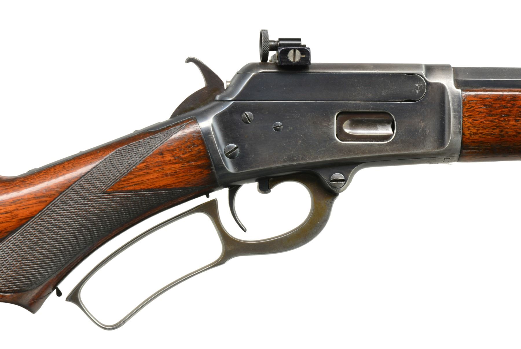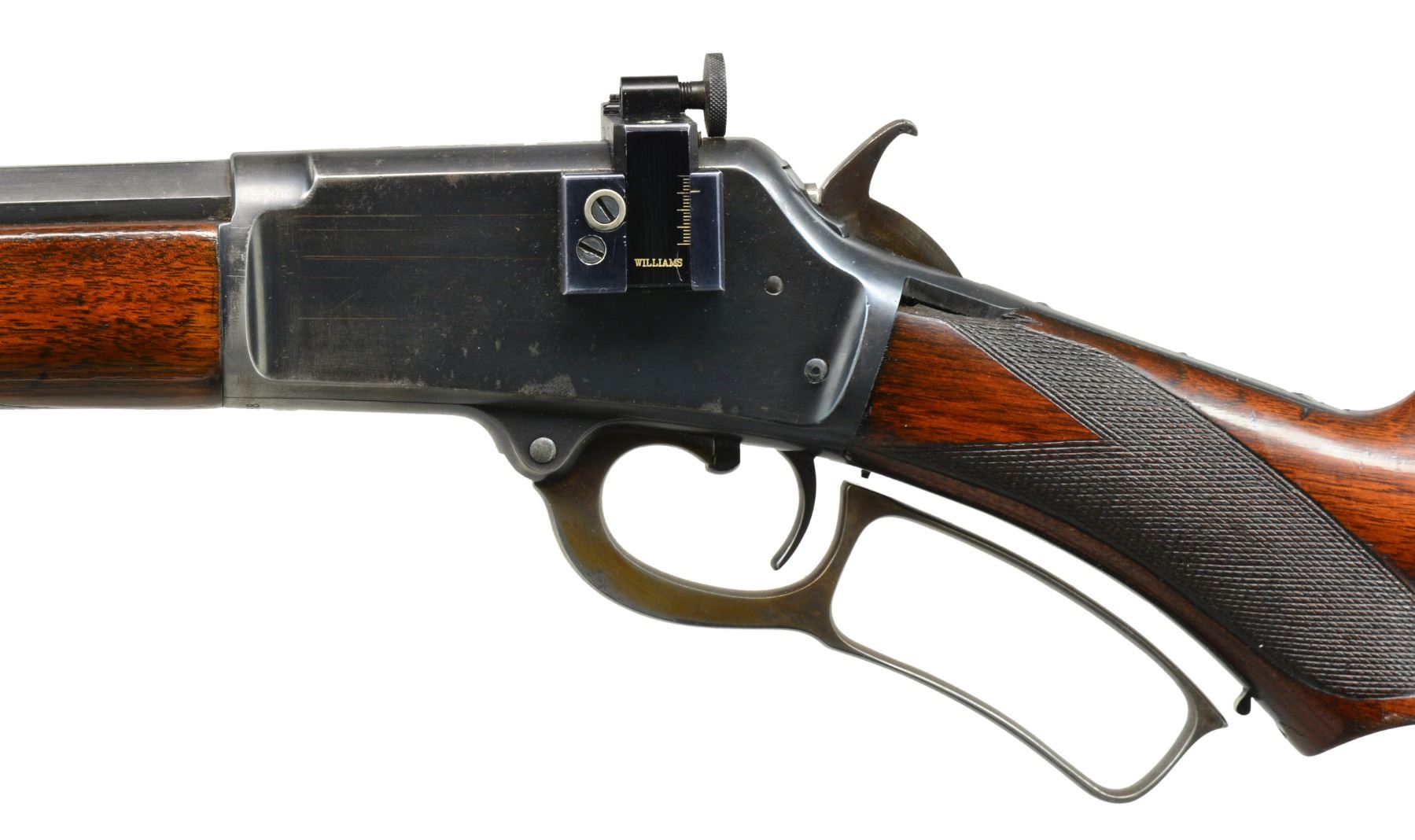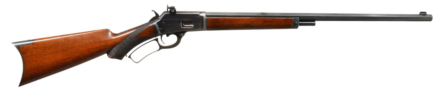Cal. 25-20 Marlin. S# 109958. Bbl. 24" oct. Redfield replacement front sight, filler in rear dovetail w/ Williams Foolproof receiver sight. Half length mag. Blue finish w/ case colored hammer & lever. Forearm & S curved pistol grip walnut stock feature factory style "A" checkering & crescent steel buttplate. S# indicates 1894 mfg. CONDITION: bbl. & receiver retain over 80% lightly faded original blue showing edge & carry wear on action. Hammer & lever case colors are fading to a light bronze patina. Forearm is sanded & refinished w/ weakened checkering. Stock has lightly worn finish showing scattered scratches & marks w/ crack right of lower tang & a lg. chip left of top tang. Bore retains sound rifling w/ slight darkening in the grooves. (01-17691/DS). ANTIQUE. $1,250-1,750.