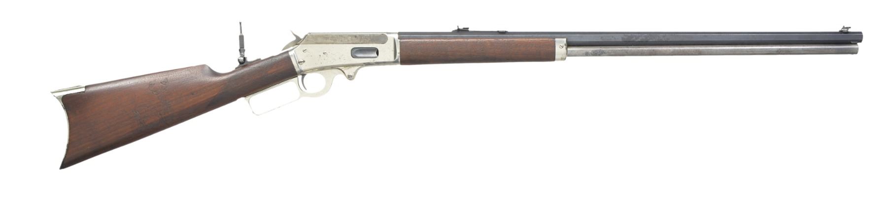 Cal. 30-30. S# 245631. Bbl. 26" oct. Combination front sight, replacement Win. elevator adj. rear sight & combination tang sight. Full length mag. Receiver, lever, forearm cap & crescent steel buttplate have nickel finish. Breech bolt has case colored finish. Walnut forearm & straight grip stock w/ crude added checkered & white tail deer carving. Mfg. 1902. CONDITION: bbl. has 40% fading blue blending w/ areas of pitting. Mag. tube has faded gray appearance w/ spots of pitting. Nickel parts retain 75% finish showing spots of flaking. Breech block has lightly visible case colors. Lightly sanded & refinished wood has dark open grain appearance w/ dark staining at toe. Bore has darkened appearance retaining intact rifling. (19-5563/DS). CURIO. $500-700.