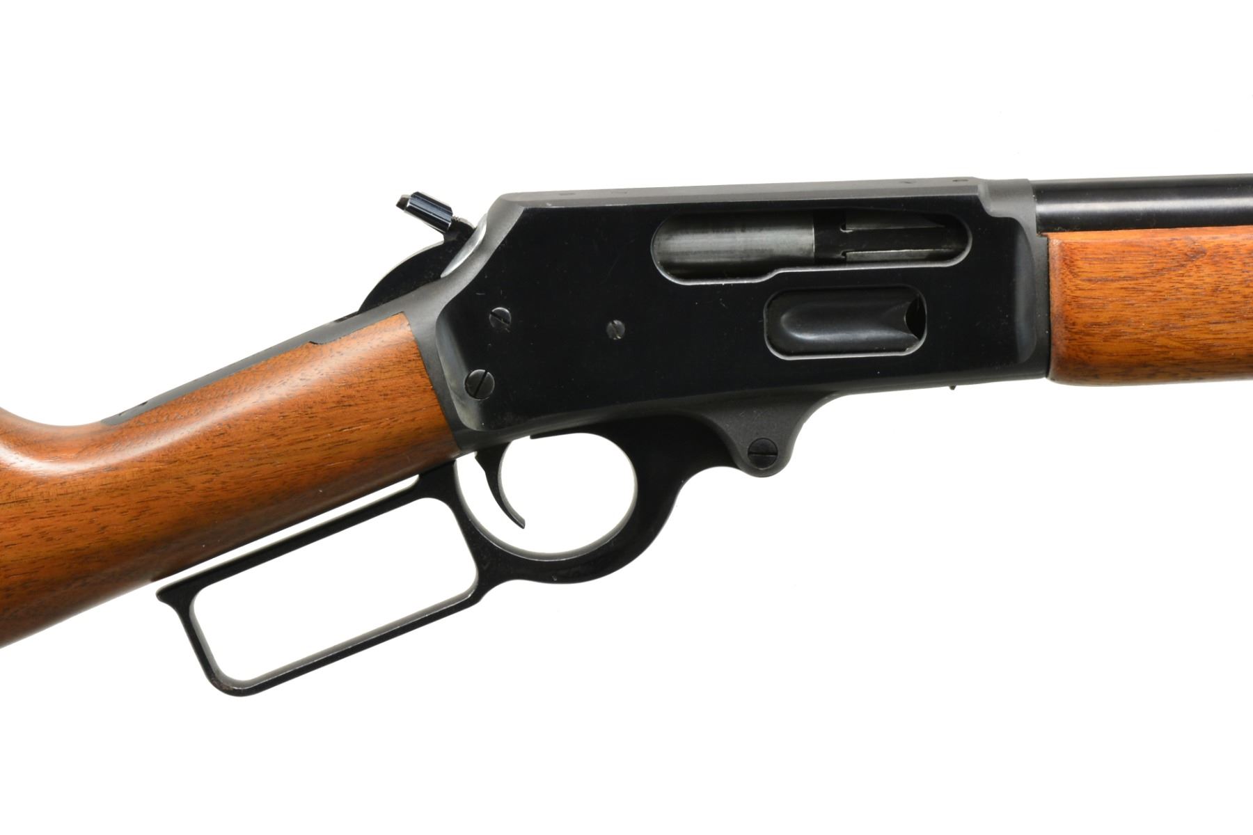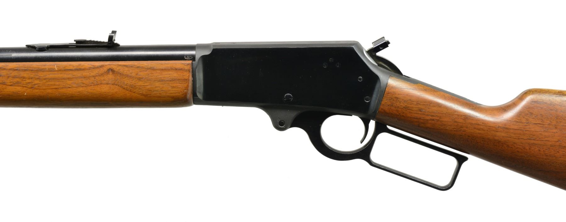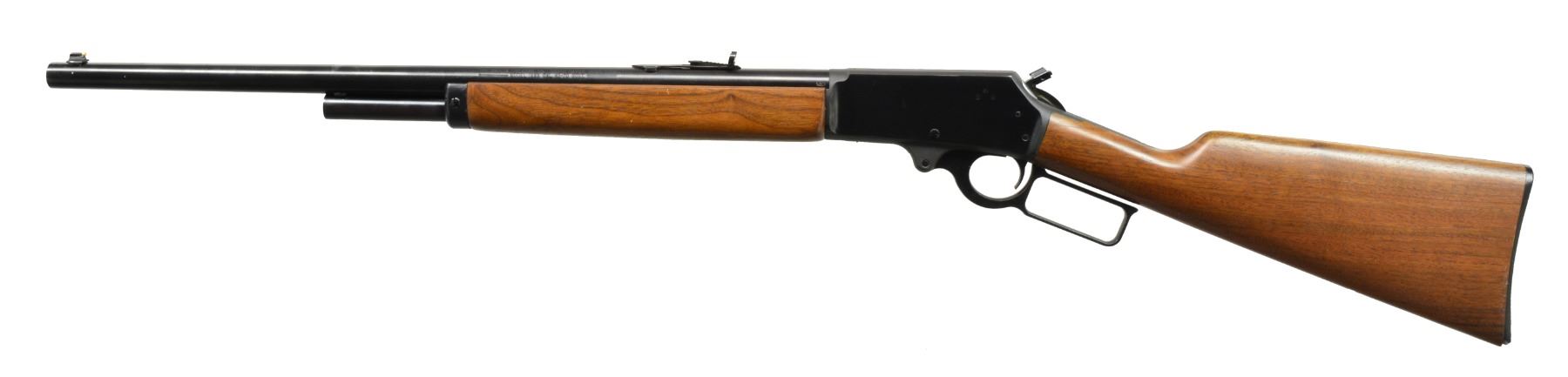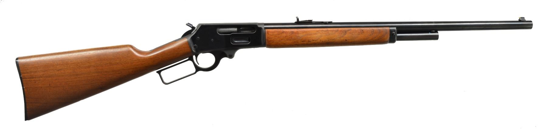 Cal. 45-70. S# B005711. Bbl. 22”. Bbl. marked on left side “THE MARLIN FIREARMS COMPANY NORTH HAVEN CONN USA / MODEL 1895 CAL. 45-70 GOVT. MICRO-GROOVE RIFLING”. Folding sporting rear sight. Gold colored bead front sight. Drilled & tapped for receiver sight & scope mts. Square lever. Straight grip walnut stock set w/ curved plastic buttplate. Trigger is blue. Pre Crossbolt safety. Marlin bullseye on belly of stock. CONDITION: stock set has very good appearance w/ sm. scattered handling marks. Buttplate & toe of stock has sm. missing chips. Has 90% blue w/ light high point wear. Very good shiny bore. (20-733/RW). MODERN. $600-800.