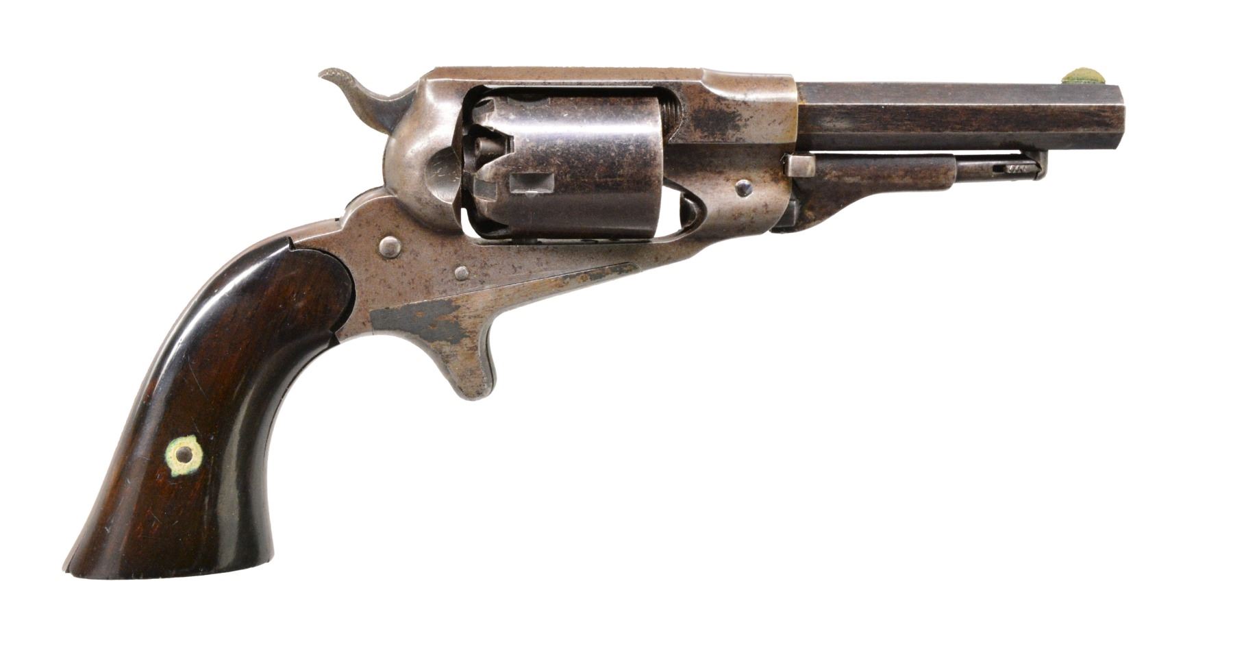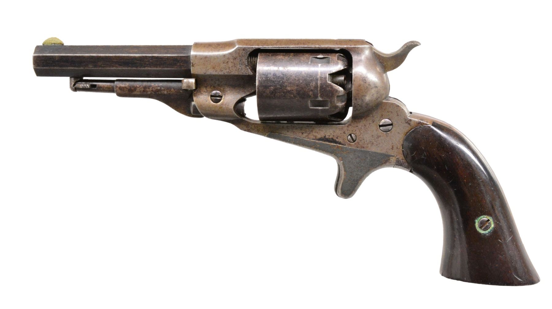 REVOLVERS. 1) NEW MODEL POCKET. Cal. 31. S# 13674. Bbl. 3 1/2" w/ blade front sight. 5 Shot rnd. cyl. 3rd Type, all iron, blue finished & spur trigger action. 2 Piece rosewood grips. CONDITION: 50% dull faded blue showing scattered spots of light pitting. Grips show wear & handling marks w/ sm. chip at heel of right panel. Bore has darkened appearance w/ worn rifling & light pitting. (01-16862/DS). 2) NEW MODEL POLICE. Cal. 36. S# 3033. Bbl. 4 1/2" oct. w/ blade front sight. 5 Shot rnd. cyl. Blue finish w/ brass trigger guard. Original 2 piece ivory grips have matching S# pencil marked on inside of both panels. CONDITION: 50% lightly faded blue finish. Brass trigger guard shows a dark tarnish. Ivory grips have acquired a mild cream colored patina having small cracks around the left screw escutcheon. Bore retains intact rifling showing scattered spots of pitting. (01-16889/DS). BOTH ANTIQUE. $1100-1600.