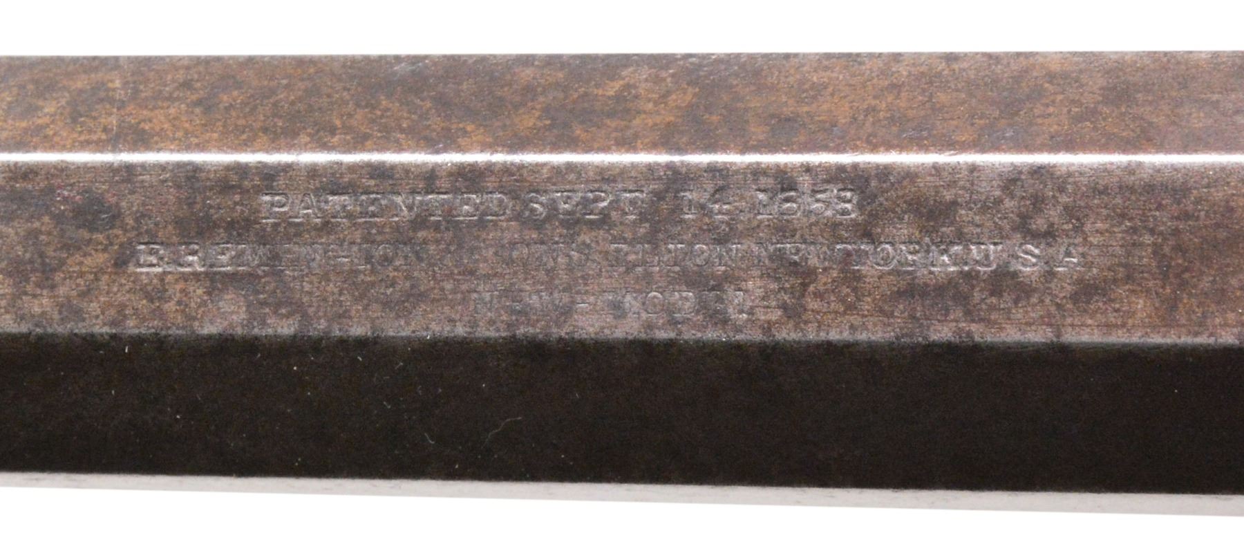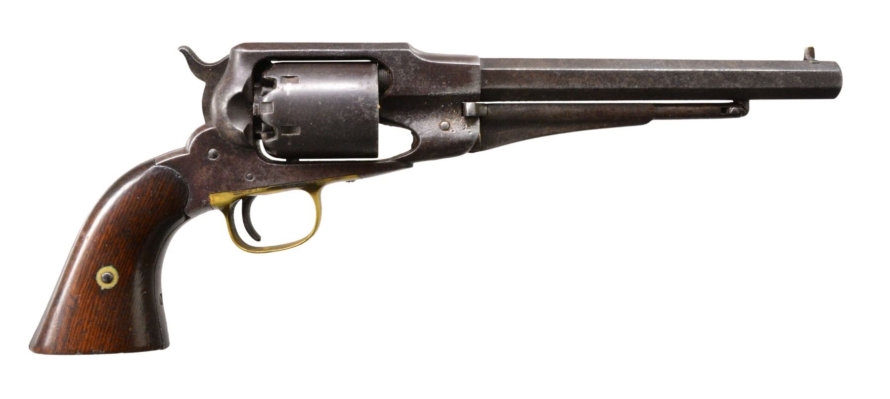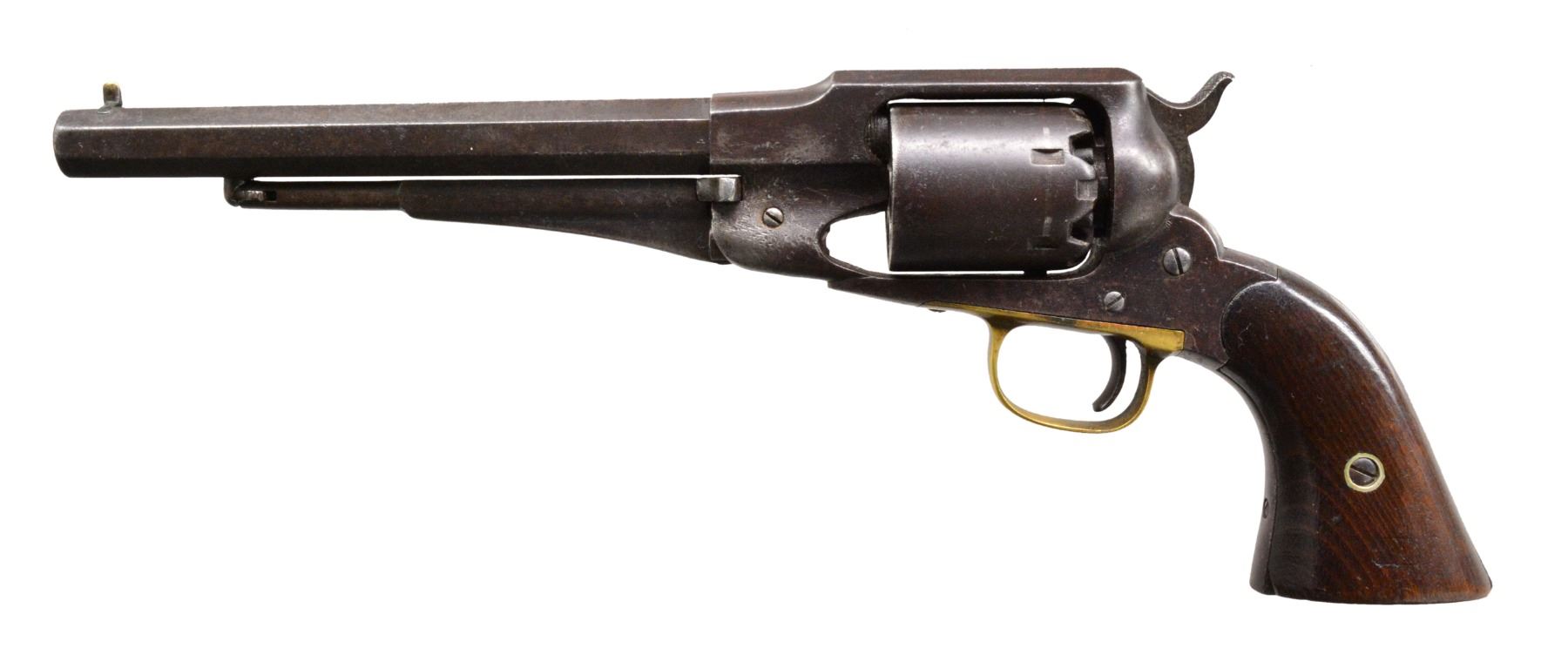 Cal. 44. S# 34517. Bbl. 8" oct. w/ dovetail mounted brass blade front sight. 6 Shot rnd. cyl. Blue finish w/ brass trigger guard. Bbl., frame & cyl. have "A" or "I" US inspectors marks. 2 Piece walnut grips w/ partially visible cartouche on right panel. CONDITION: metal has dark patina appearance showing areas of pitting w/ numerous sm. dents on both sides on forward portion of frame. Sanded & refinished grips have chips along bottom w/ heavily coated refinishing. Bore retains sound rifling showing areas of light pitting. (01-17121/DS). ANTIQUE. $600-1,000.