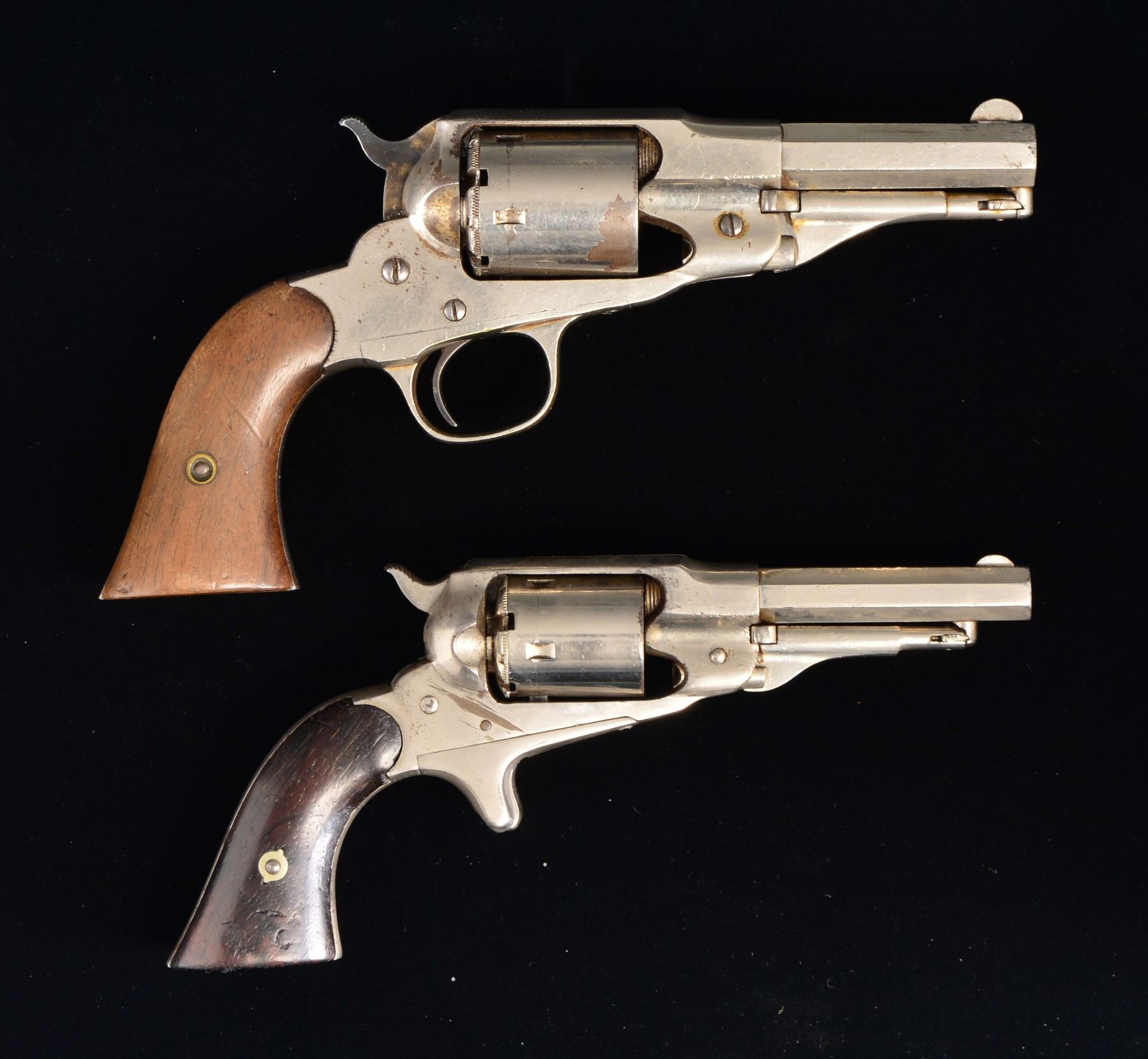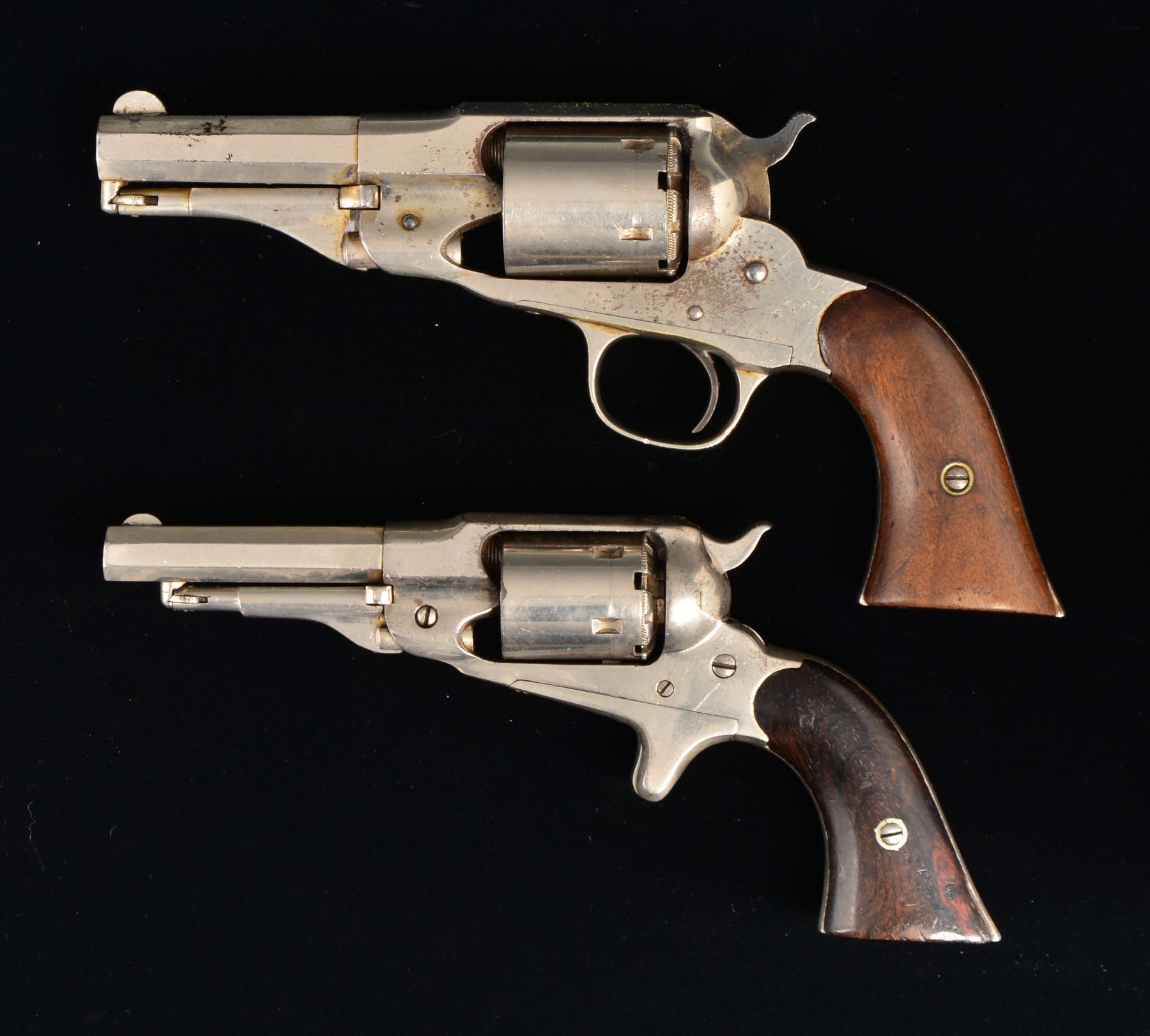 CONVERSION REVOLVERS. 1) POLICE. Cal. 38 RF. S# 295. Bbl. 3 1/2" oct. w/ semi circular sight. 5 Shot rnd. cyl. w/ conversion plate. Nickel finish. 2 Piece walnut grips. CONDITION: 80% original nickel. w/ areas of flaking, wear spots & scattered scratches. Grips show wear & handling marks. Dark pitted bore w/ partially visible rifling. (01-17582/DS). 2) POCKET. Cal. 32 RF. S# 41402. Bbl. 3 1/2" oct. w/ semi circular sight. 5 Shot rnd. cyl. w/ conversion plate. Spur trigger. 2 Piece rosewood grips. Butt of right panel has hand carved marking "G ZINC". Bottom of grip strap has added white paint ID marking "FB-225". UNATTACHED ACCESSORIES: auxilary percussion cyl. w/ apparent chrome refinish. CONDITION: 60% worn renickeled finish showing dents, scratches & marks. Grips have darkened appearance showing numerous dents & handling marks. Bore is dark w/ worn rifling showing spots of pitting. (01-17585/DS). BOTH ANTIQUE. $600-900.