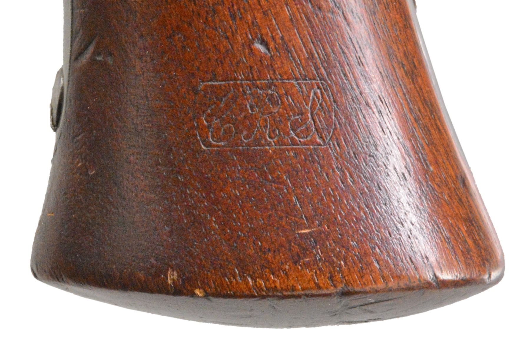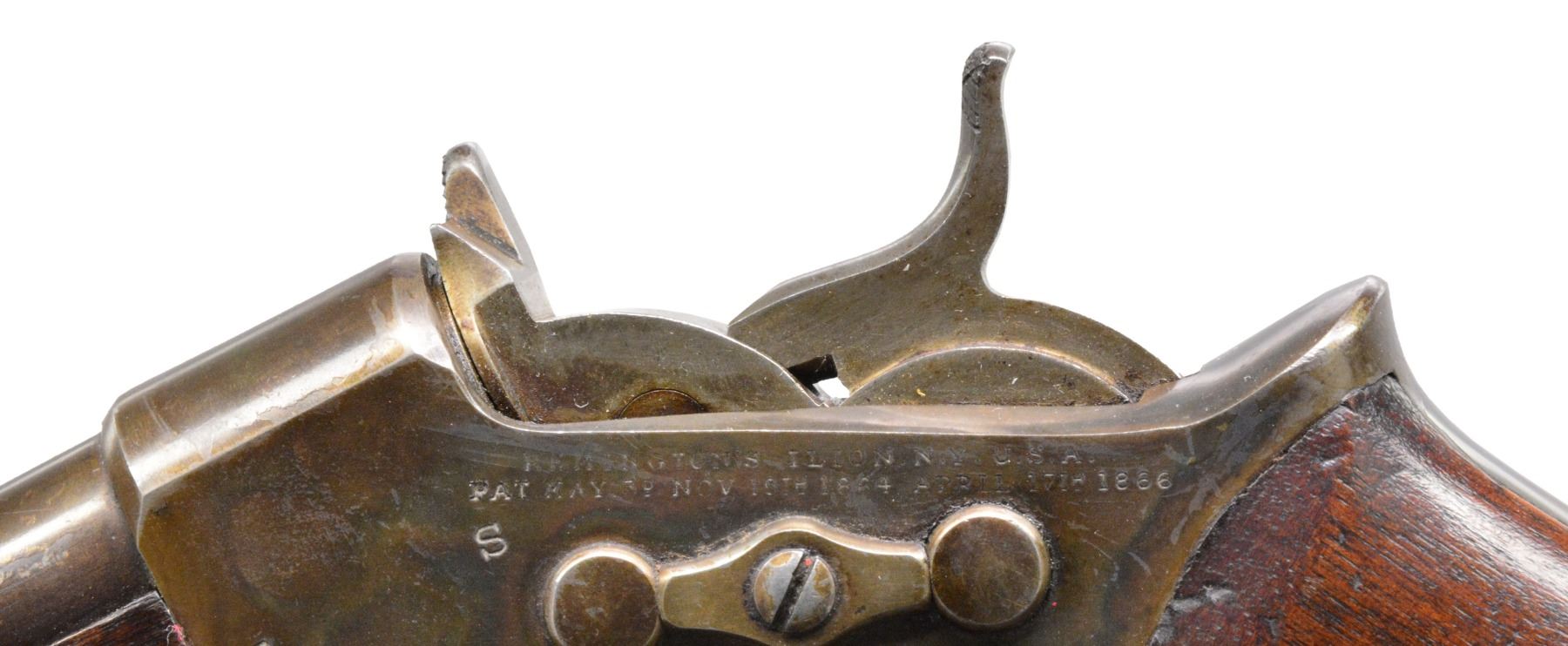 Cal. 50 CF. S# 5162. Bbl. 8" rnd. Case colored action w/ 2 line patent dates along with "P" & "S" markings on left side of frame. Left inside tangs bear assembly # "5410" along w/ matching S# on top tang only. 1 Piece walnut grip w/ clear "C.R.S" cartouche on left side. CONDITION: bbl. retains 50% dull faded blue. Action retains 80% dull faded case colors w/ coating of varnish over all metal surfaces. Grips have dark worn lightly refinished appearance showing dents & handling marks. Bore is generally bright retaining sound rifling showing sm. spots of very light pitting. (01-16853/DS). ANTIQUE. $750-1,250.